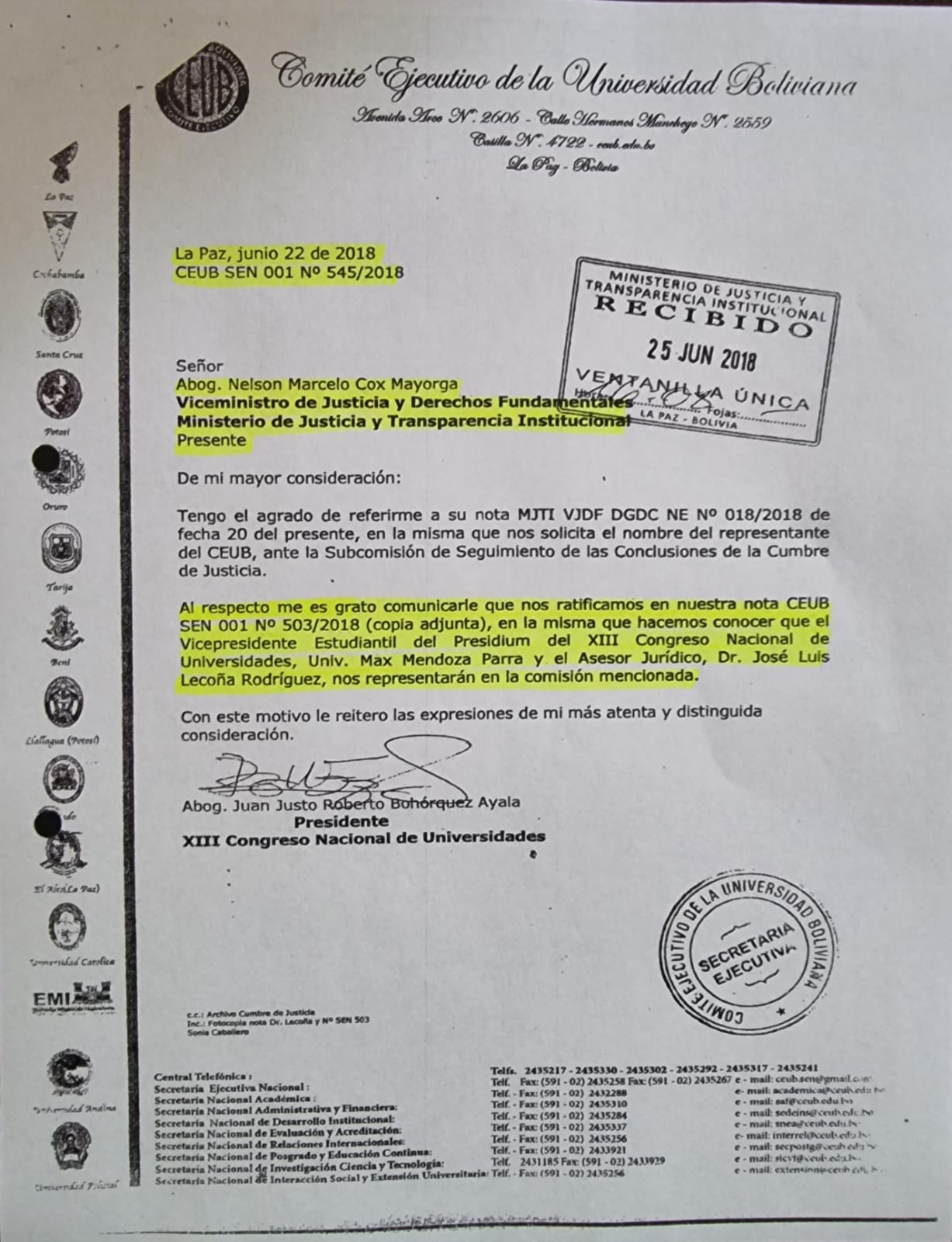 También puntualizó que en aquella oportunidad se aclaró que se hizo partícipe a Max Mendoza del proyecto del censo carcelario ya que él había sido acreditado como parte del CEUB, a través de la nota “CEUB SEN 001 N° 545/2018 de 22 de junio de 2019 dirigida a este Ministerio por el Abog. Juan Justo Roberto Bohórquez Ayala, Presidente del XIII Congreso Nacional de Universidades y presentante legal de CEUB”.