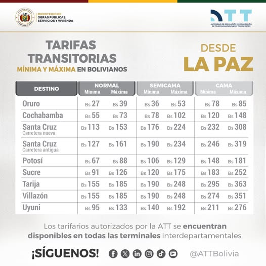 La Paz, 13 de febrero de 2026 (ABI).– La Autoridad de Regulación y Fiscalización de Telecomunicaciones y Transportes (ATT) recordó que rigen tarifas máximas y mínimas para el transporte interdepartamental y exhortó a los usuarios a denunciar cualquier cobro excesivo en las oficinas habilitadas en las terminales terrestres del país.