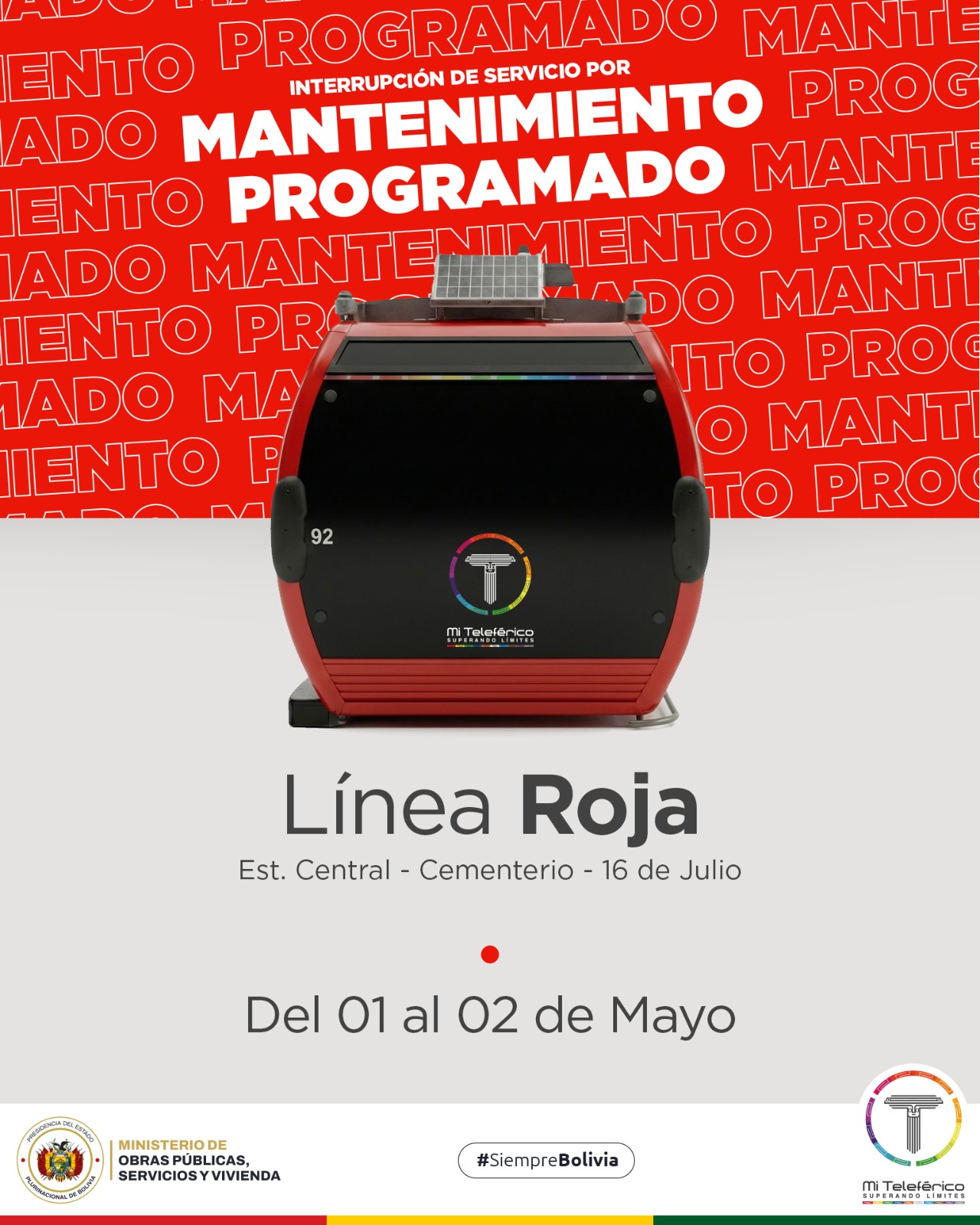 La Paz, 21 de abril de 2026 (ABI). – La Línea Roja interrumpirá sus operaciones el 1 y 2 de mayo por mantenimiento programado para reforzar la seguridad, confiabilidad y continuidad del servicio, informó este martes la empresa estatal de transporte por cable Mi Teleférico.