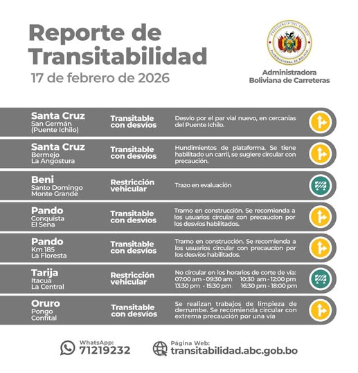 La Paz, 17 de febrero de 2026 (ABI). – La Administradora Boliviana de Carreteras (ABC) informó este martes que la Red Vial Fundamental se encuentra transitable en la mayor parte del país, aunque con desvíos y restricciones en algunos tramos donde se ejecutan trabajos de mantenimiento y limpieza.