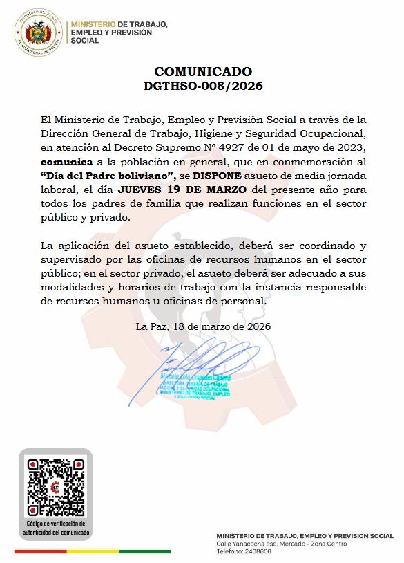 La Paz, 18 de marzo de 2026 (ABI).- El Ministerio de Trabajo, Empleo y Previsión Social, a través de la Dirección General de Trabajo, Higiene y Seguridad Ocupacional, comunicó que el jueves 19 de marzo se otorgará asueto de media jornada laboral por la celebración del “Día del Padre boliviano”, en cumplimiento del Decreto Supremo Nº 4927, de 1 de mayo de 2023.
