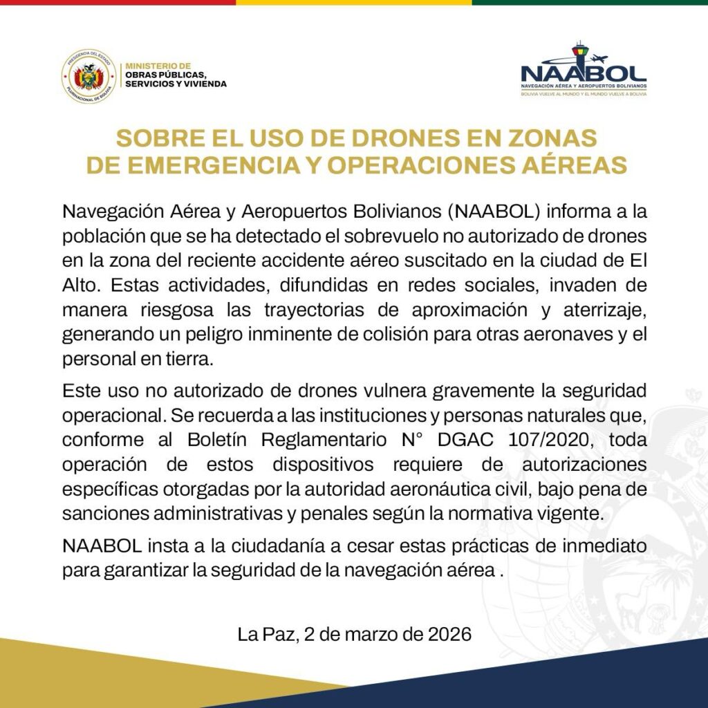 El Alto, 2 de marzo de 2026 (ABI) – La Navegación Aérea y Aeropuertos Bolivianos (NAABOL) informó, a través de un comunicado, que se detectó el sobrevuelo no autorizado de drones en la zona del reciente accidente aéreo suscitado en la ciudad de El Alto, actividad que pone en riesgo la seguridad de las operaciones aeronáuticas.