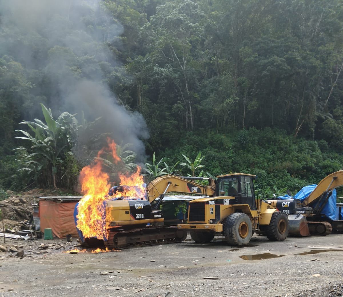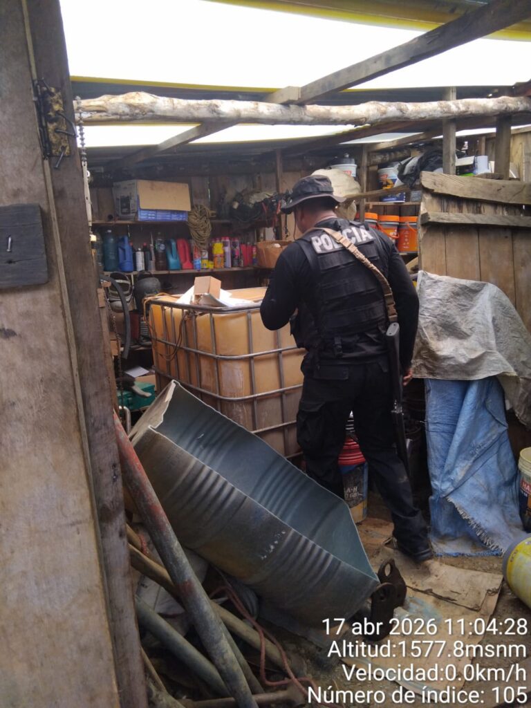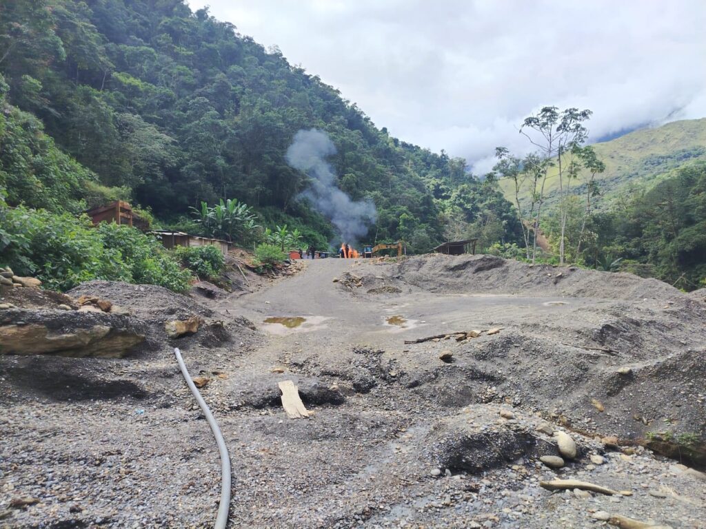 Durante la verificación en campo, la comisión técnica evidenció la presencia de maquinaria pesada, entre ellas retroexcavadoras y equipos de procesamiento, así como un campamento instalado, lo que confirmaba el desarrollo de actividades mineras al margen de la normativa vigente.