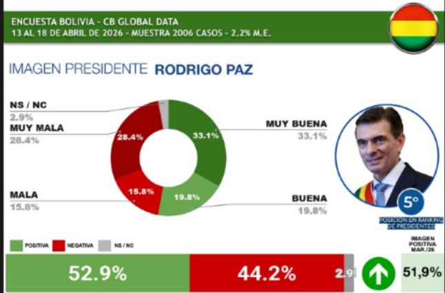 La Paz, 20 de abril de 2026 (ABI).– El presidente de Bolivia, Rodrigo Paz, se posicionó este mes como el quinto mandatario mejor valorado de Latinoamérica, con un 52,9% de aceptación positiva, según el ranking de presidentes de la región.