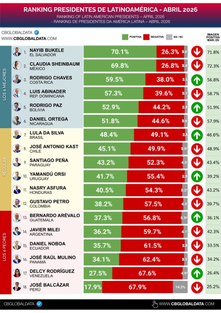 El ranking, elaborado por CB Global Data, analizó la percepción ciudadana sobre la gestión presidencial en al menos 18 países de la región durante el mes de abril del presente año.