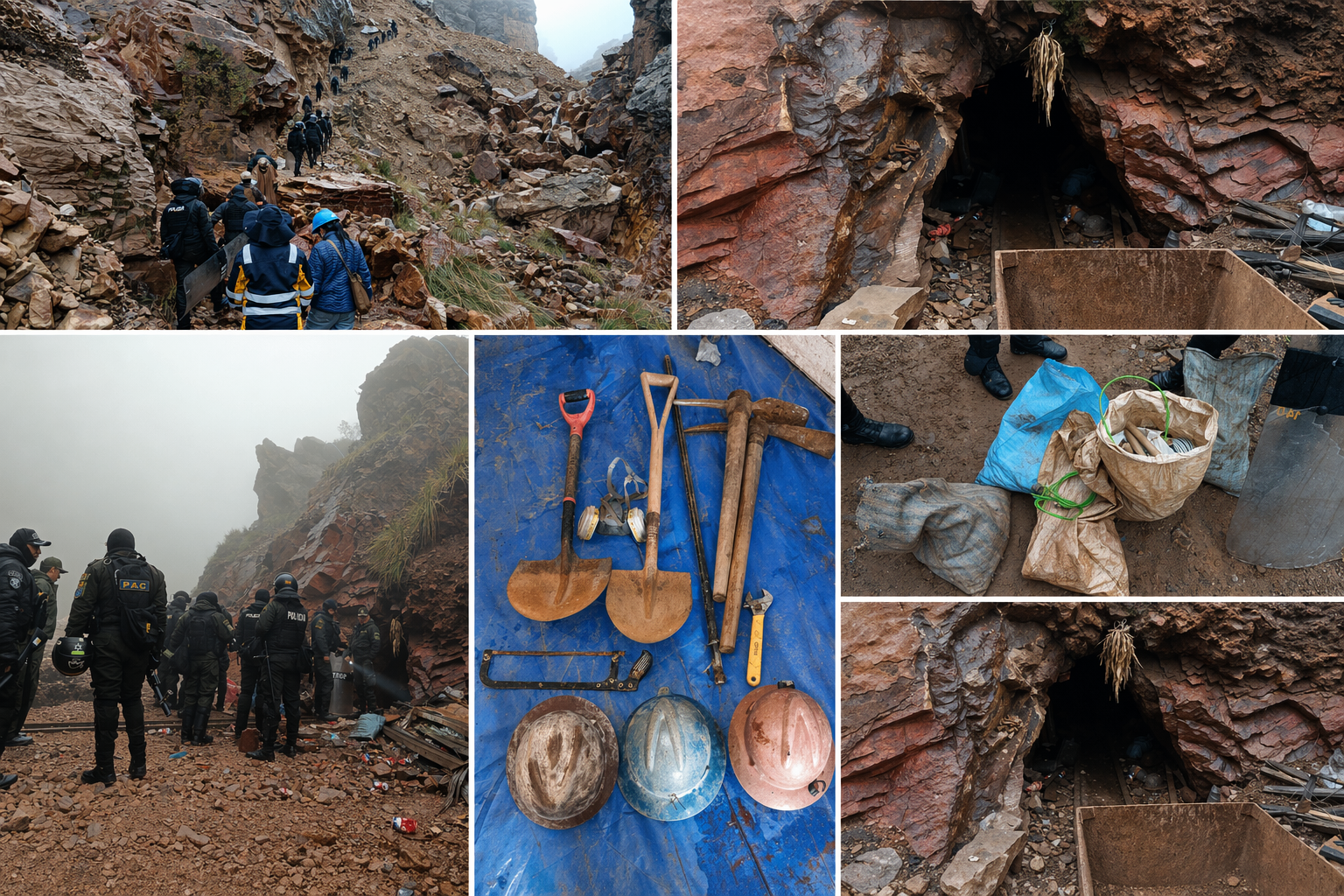 Asimismo, en el interior de las bocaminas se encontraron implementos de trabajo como cascos, botas, guantes y ropa especializada, mientras que en el exterior se identificaron carros metaleros, compresoras y un tractor.