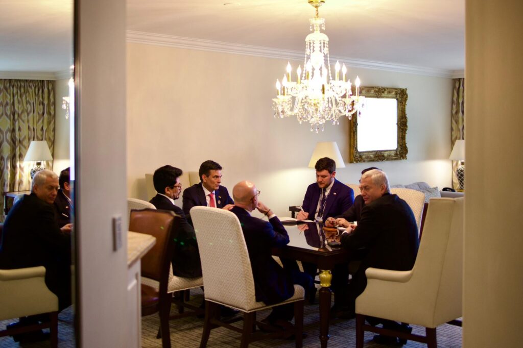 En imágenes compartidas a los medios de comunicación, Paz aparece junto al canciller de Bolivia, Fernando Aramayo, y el ministro de Gobierno, José Luis Lupo, sentados alrededor de una mesa conversando con Kast, a quien le acompañan otras dos personas.
