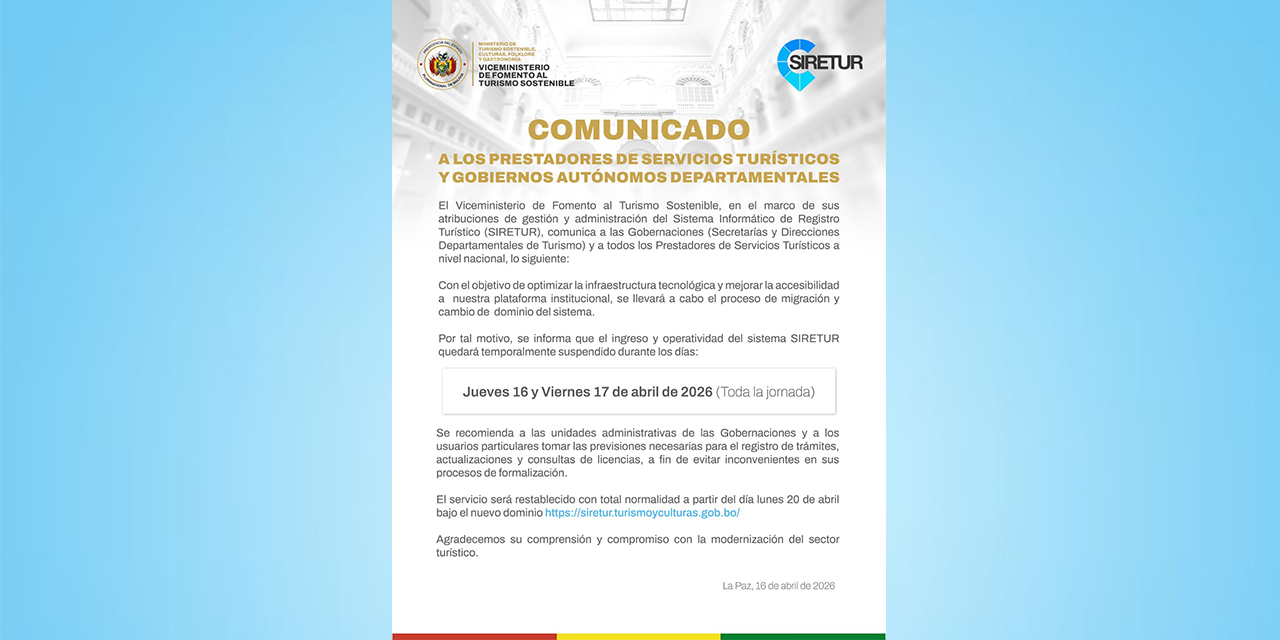 La Paz, 16 de abril de 2026 (ABI). – El Viceministerio de Fomento al Turismo Sostenible informó que el Sistema Informático de Registro Turístico (Siretur) suspenderá temporalmente su servicio a nivel nacional debido a un proceso de migración tecnológica y cambio de dominio.