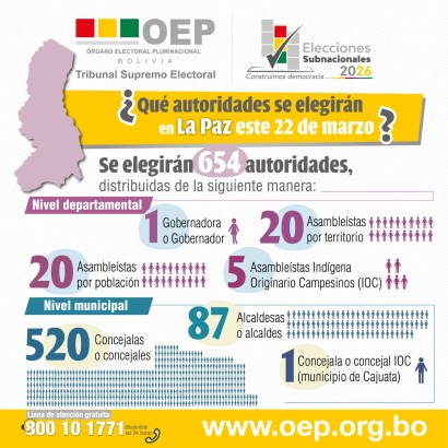La Paz, 1 de marzo (ABI).- El departamento de La Paz se encamina a una de las jornadas democráticas más trascendentales de los últimos años. Más de 2.023.882 ciudadanas y ciudadanos están habilitados para ejercer su derecho al voto en las 20 provincias paceñas durante las Elecciones Subnacionales 2026, en las que se definirán 654 autoridades departamentales y municipales que marcarán el rumbo político y administrativo de la región durante los próximos cinco años.