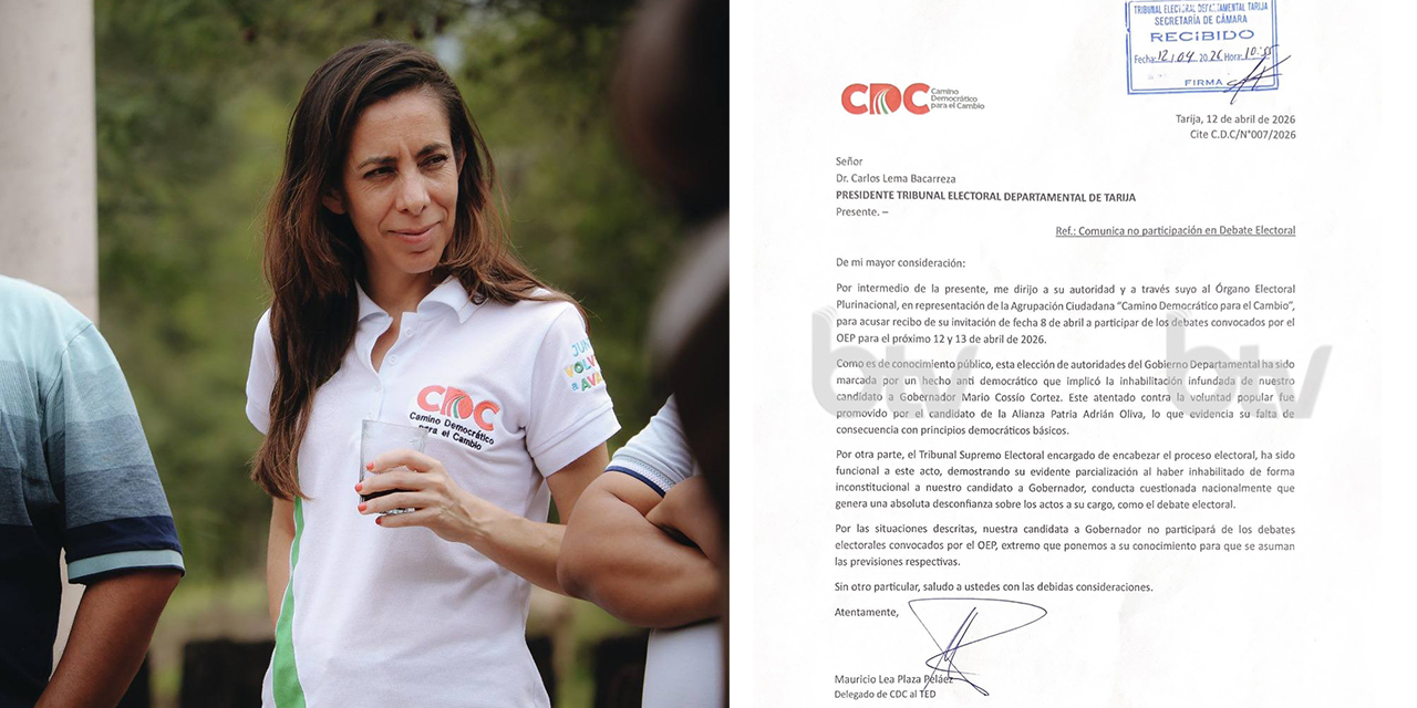 “Nuestra candidata a Gobernador no participará de los debates electorales convocados por el OEP (Órgano Electoral Plurinacional), extremo que ponemos a su conocimiento para que se asuman las previsiones respectivas”, señala la misiva.