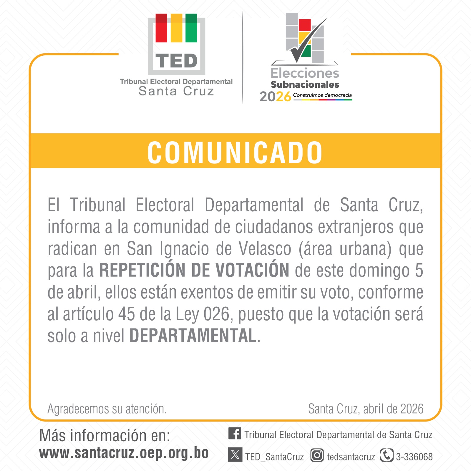 Santa Cruz, 4 de abril de 2026 (ABI). — El Tribunal Electoral Departamental (TED) de Santa Cruz informó que para la repetición de votos de las elecciones subnacionales programadas para mañana domingo 5 de abril, la comunidad de ciudadanos extranjeros que radican en San Ignacio de Velasco (área urbana) están exentos de votar.