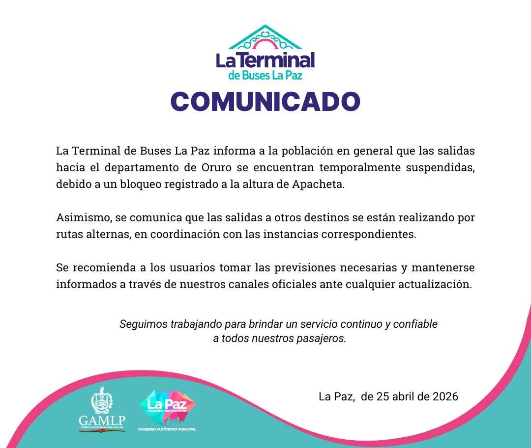 La Paz, 25 de abril de 2026 (ABI). – La Terminal de Buses de la ciudad de La Paz informó que las salidas de buses a Oruro se encuentran temporalmente suspendidas debido a un bloqueo a la altura de Apacheta.