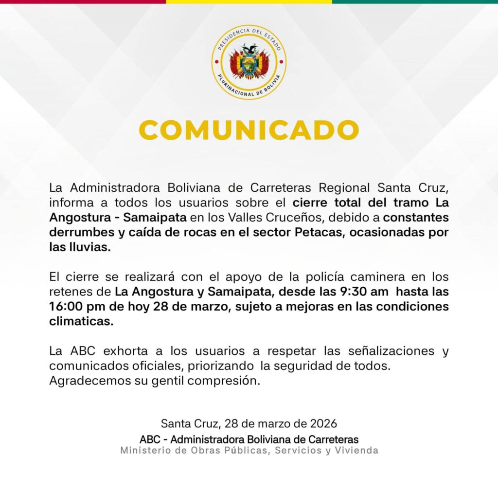Según el comunicado oficial, “la ABC informa a todos los usuarios sobre el cierre total del tramo La Angostura – Samaipata en los valles cruceños”. La medida se adoptó debido a derrumbes y caída de rocas en el sector Petacas, ocasionados por las intensas lluvias registradas en la zona.