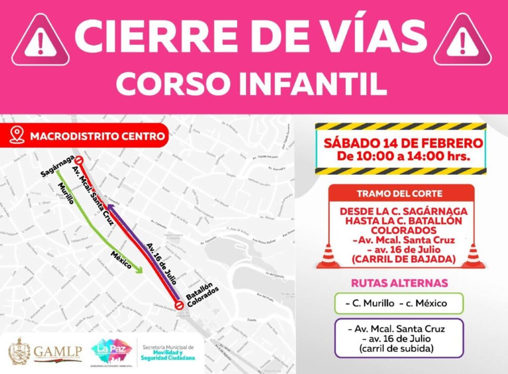 La Paz, 13 febrero de 2026 (ABI).- La Alcaldía de La Paz anunció el cierre de varias vías en el centro paceño durante el fin de semana, debido a la realización del Corso Infantil y la Farándula de Pepinos, por lo que recomendó a la población tomar previsiones y utilizar rutas alternas.