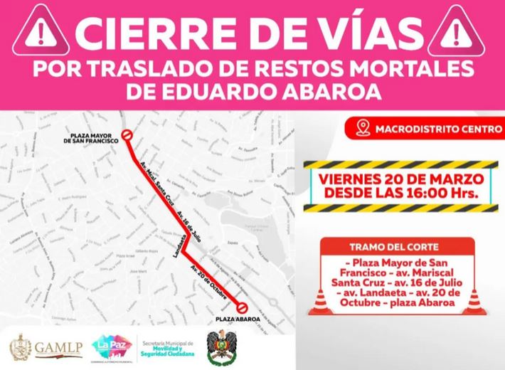 La Paz, 19 de marzo de 2026 (ABI) – La Alcaldía de La Paz anunció el cierre de varias vías del macrodistrito Centro este viernes 20 de marzo desde las 16:00, por el traslado de los restos del Eduardo Abaroa, en conmemoración de los 147 años de la Guerra del Pacífico.