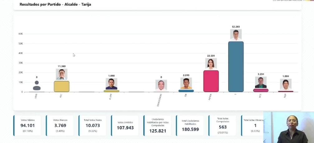 Tarija, 22 de marzo de 2026 (ABI). – Los candidatos Jonny Torres, de Primero Tarija, y Luciana Campero, de Unidad por la Patria, encabezan la carrera por la Alcaldía de Tarija, según los resultados preliminares al 71% del cómputo.