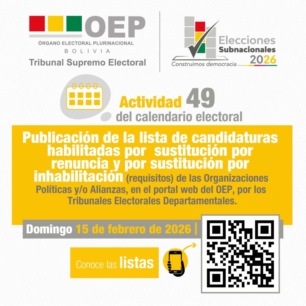 La Paz, 15 de febrero de 2026 (ABI).- El Tribunal Supremo Electoral (TSE) dio a conocer este domingo la lista oficial de candidatos habilitados para las elecciones subnacionales del próximo 22 de marzo. La publicación incluye tanto a los candidatos habilitados por sustitución, como aquellos que fueron habilitados tras cumplir con los requisitos tras renuncias o inhabilitaciones previas.