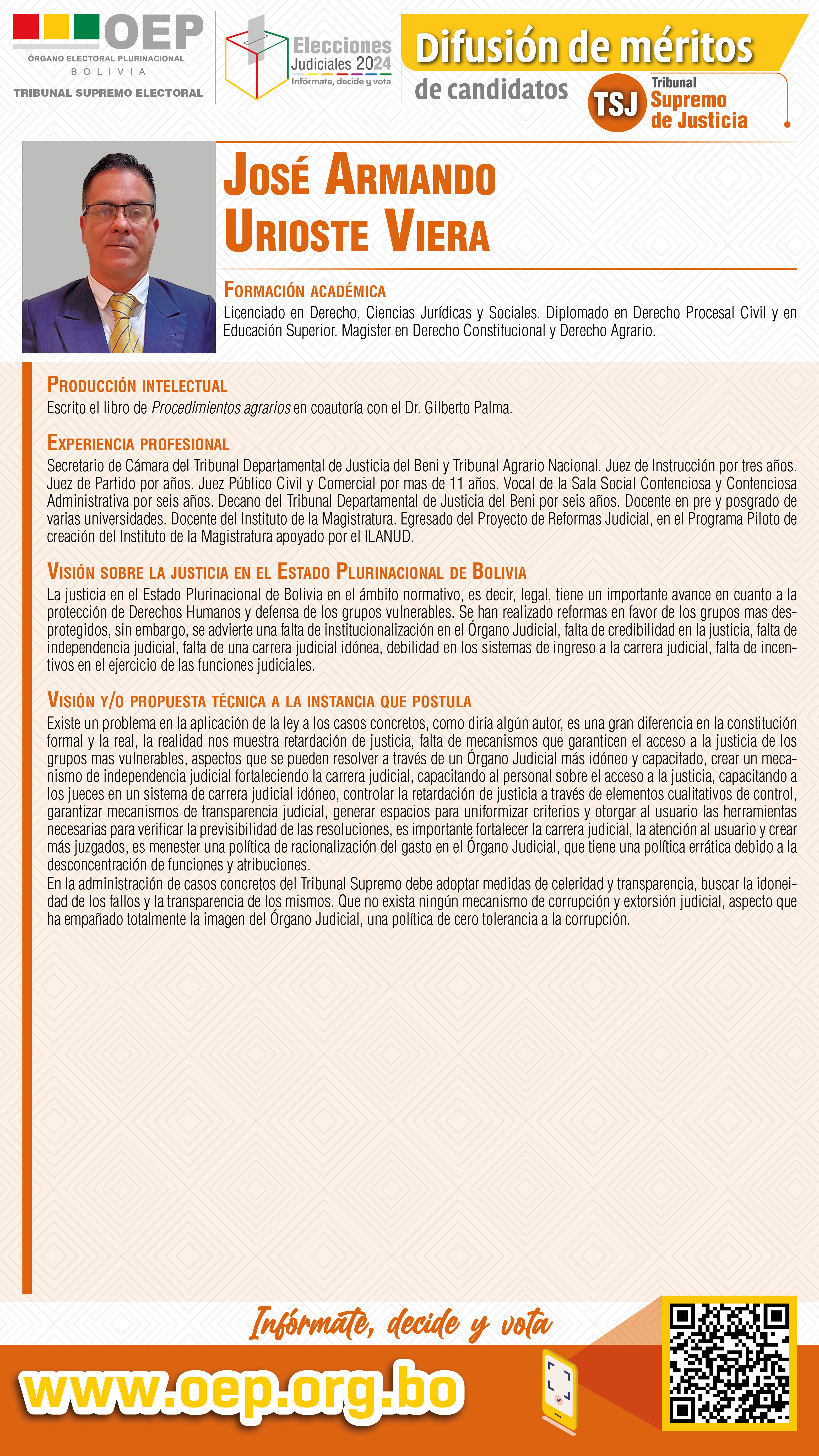 Espacio solicitado: Conforme a lo establecido en el Artículo 10 "Difusión de méritos" del “Reglamento de Difusión de Méritos e Información del Proceso de Elección de Autoridades del Órgano Judicial y del Tribunal Constitucional Plurinacional 2024”, (aprobado Mediante Resolución TSE-RSP-ADM N° 301/2024 de 27 de agosto de 2024), que señala que “Los medios de comunicación del Estado deben establecer espacios gratuitos para la difusión de méritos de las candidatas y los candidatos, garantizando que tengan el mismo tiempo y condiciones".