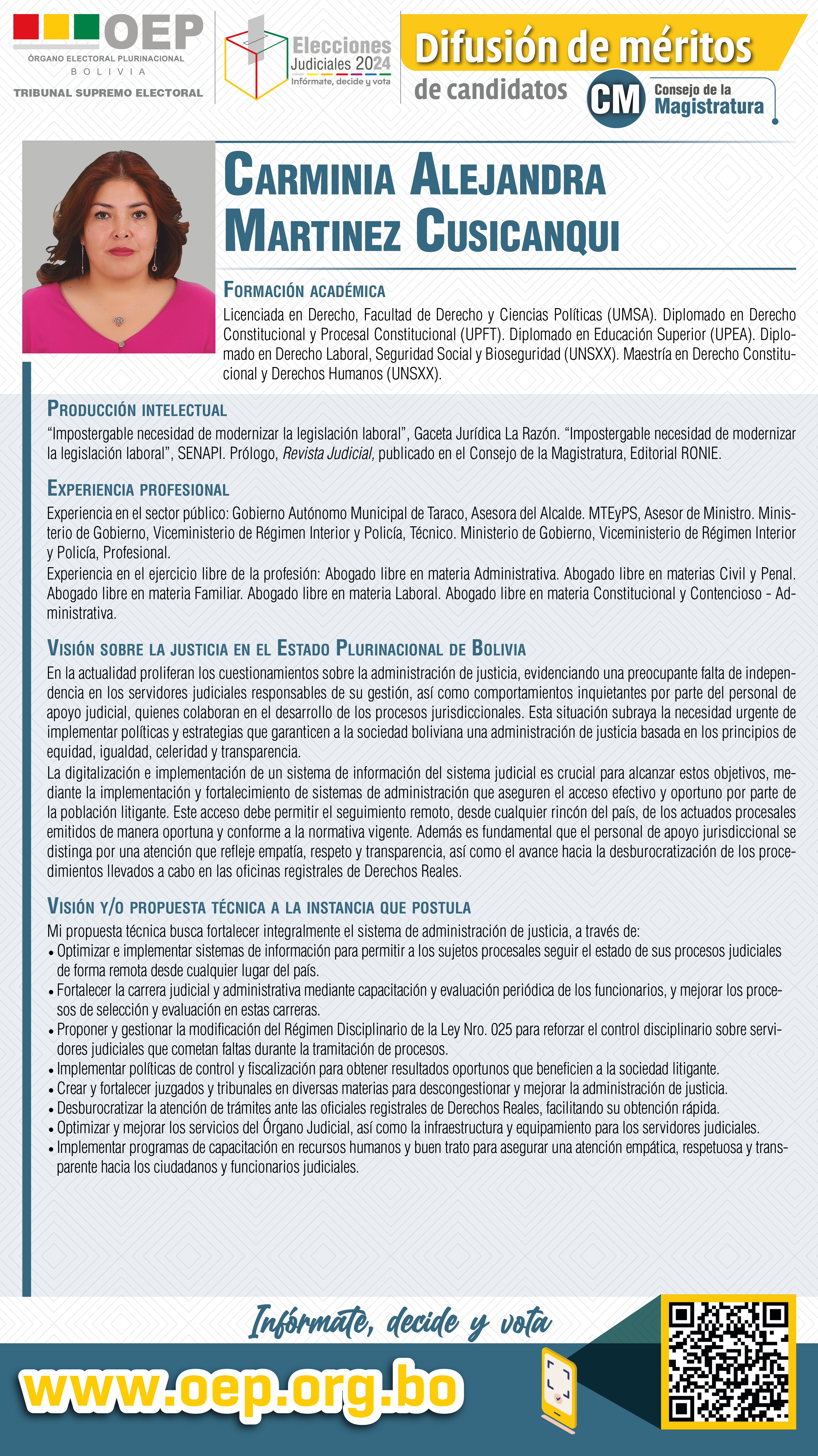 ELECCIONES JUDICIALES: Conozca a la candidata al Consejo de la Magistratura, Carminia Alejandra Martinez Cusicanqui