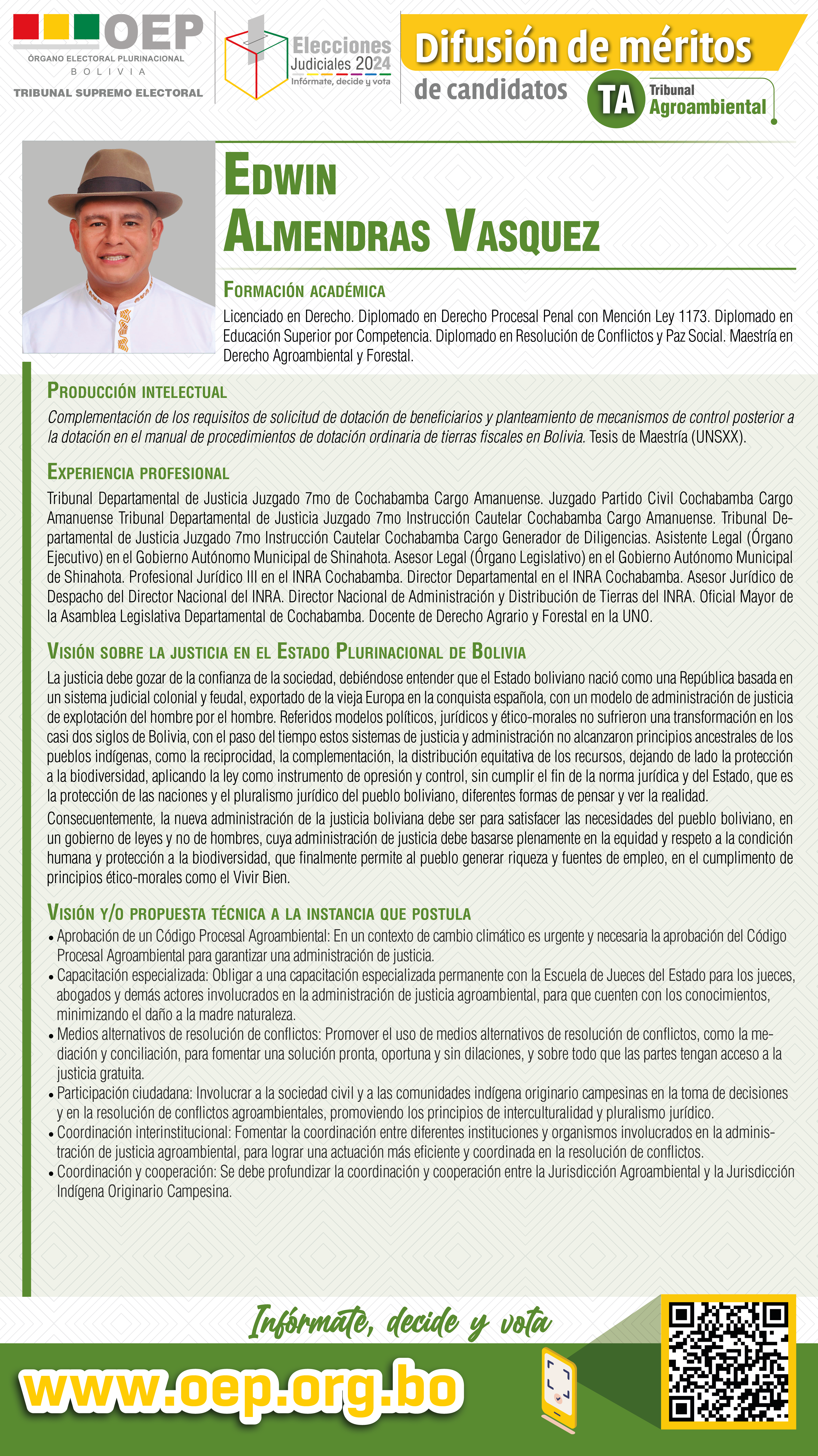 ELECCIONES JUDICIALES: Conozca al candidato al Tribunal Agroambiental, Edwin Almendras Vasquez