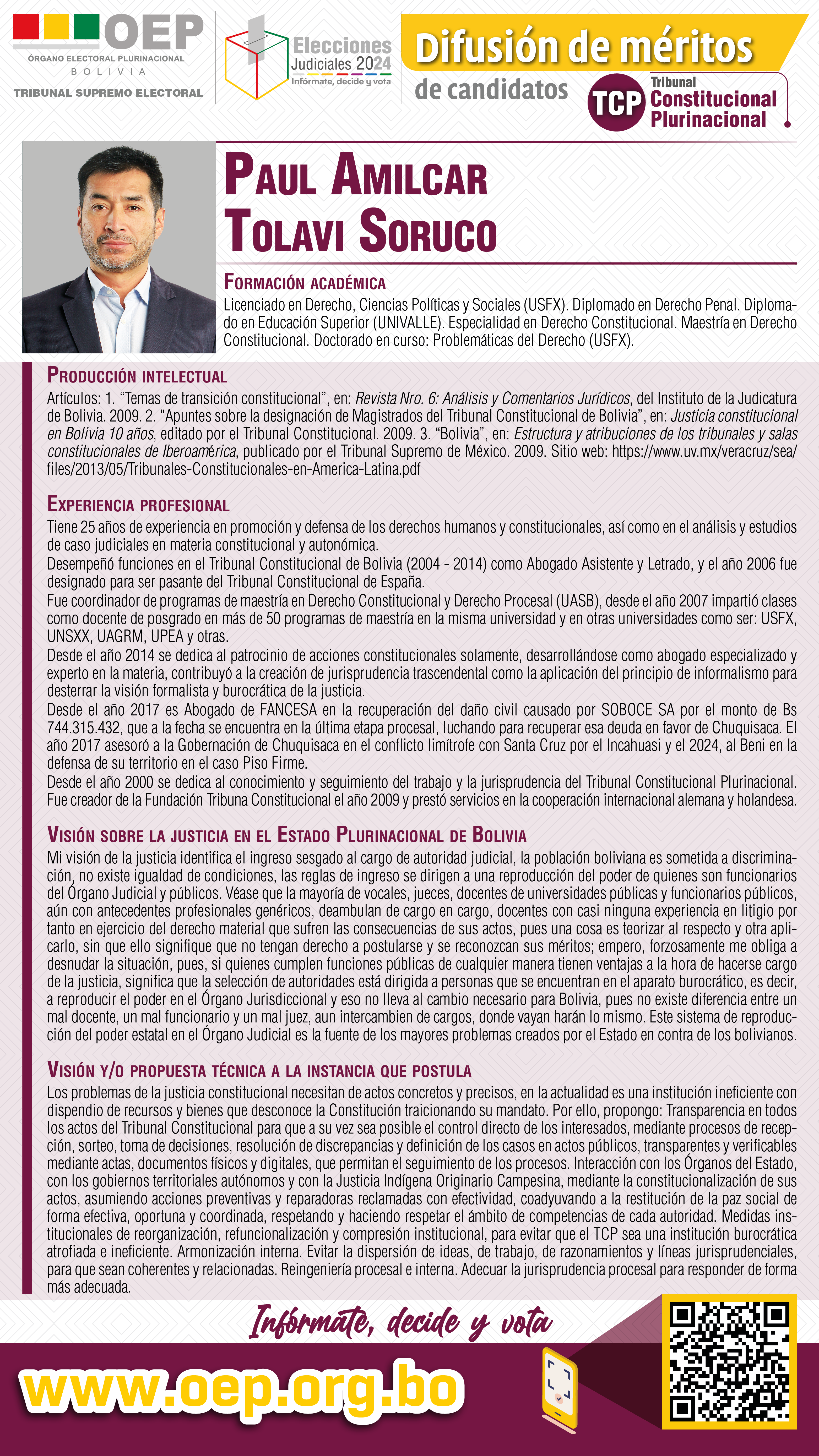 Espacio solicitado: Conforme a lo establecido en el Artículo 10 "Difusión de méritos" del “Reglamento de Difusión de Méritos e Información del Proceso de Elección de Autoridades del Órgano Judicial y del Tribunal Constitucional Plurinacional 2024”, (aprobado Mediante Resolución TSE-RSP-ADM N° 301/2024 de 27 de agosto de 2024), que señala que “Los medios de comunicación del Estado deben establecer espacios gratuitos para la difusión de méritos de las candidatas y los candidatos, garantizando que tengan el mismo tiempo y condiciones".