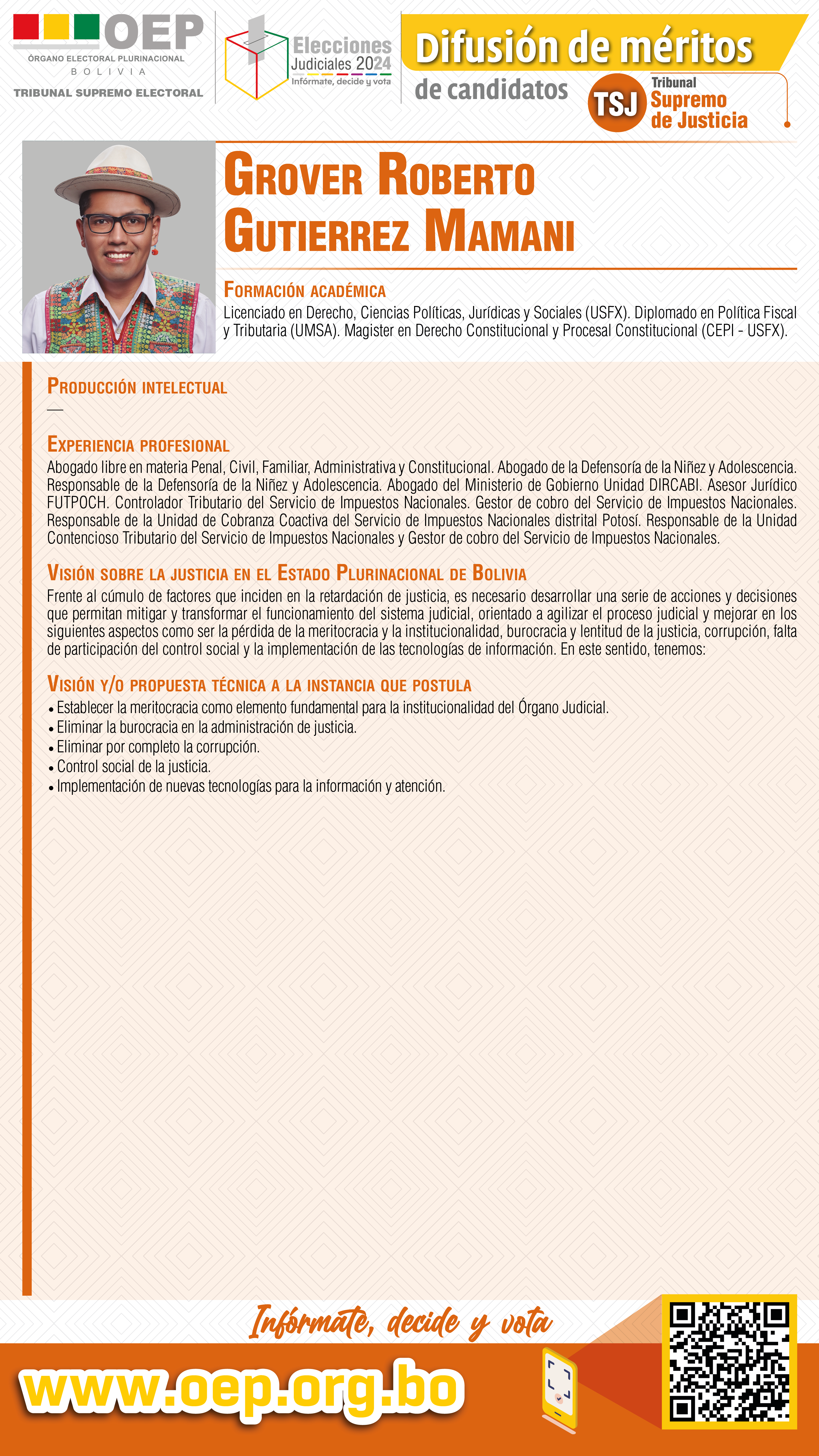 ELECCIONES JUDICIALES: Conozca al candidato al TSJ por Potosí, Grover Roberto Gutierrez Mamani