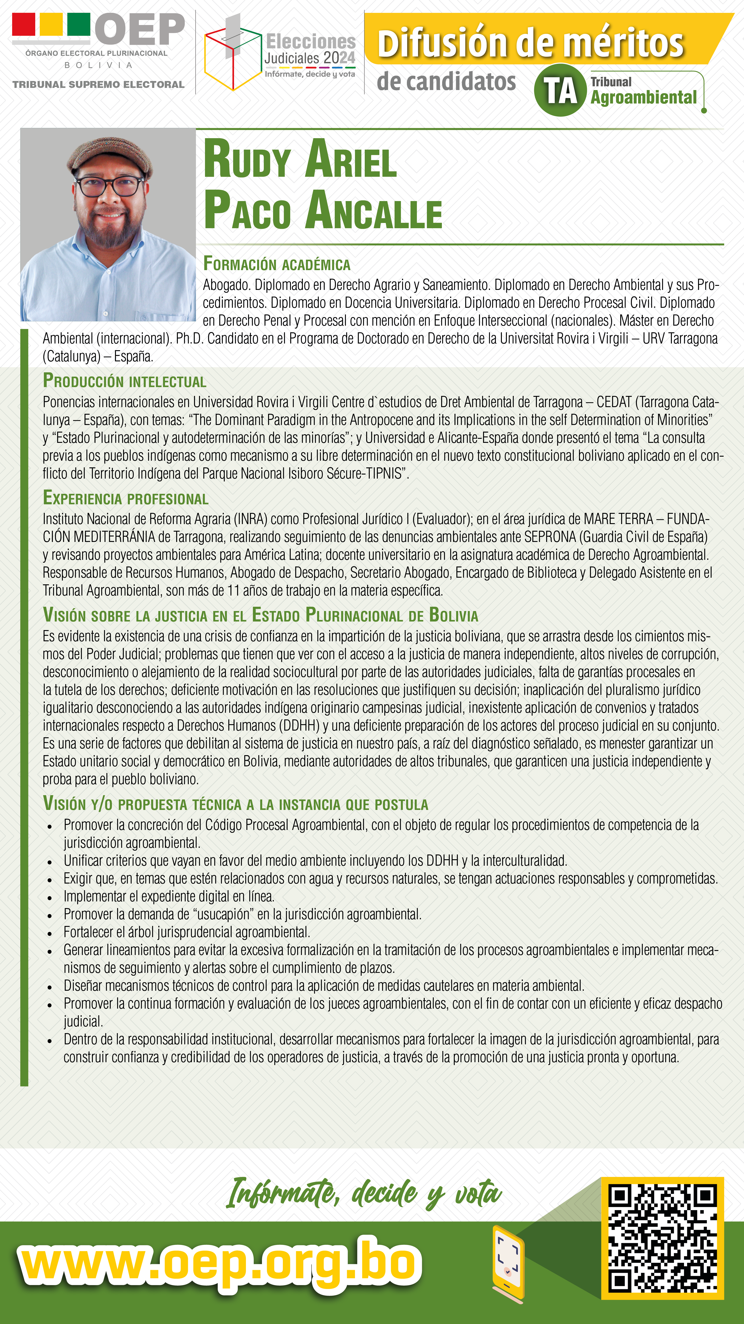 ELECCIONES JUDICIALES: Conozca al candidato al Tribunal Agroambiental, Rudy Ariel Paco Ancalle