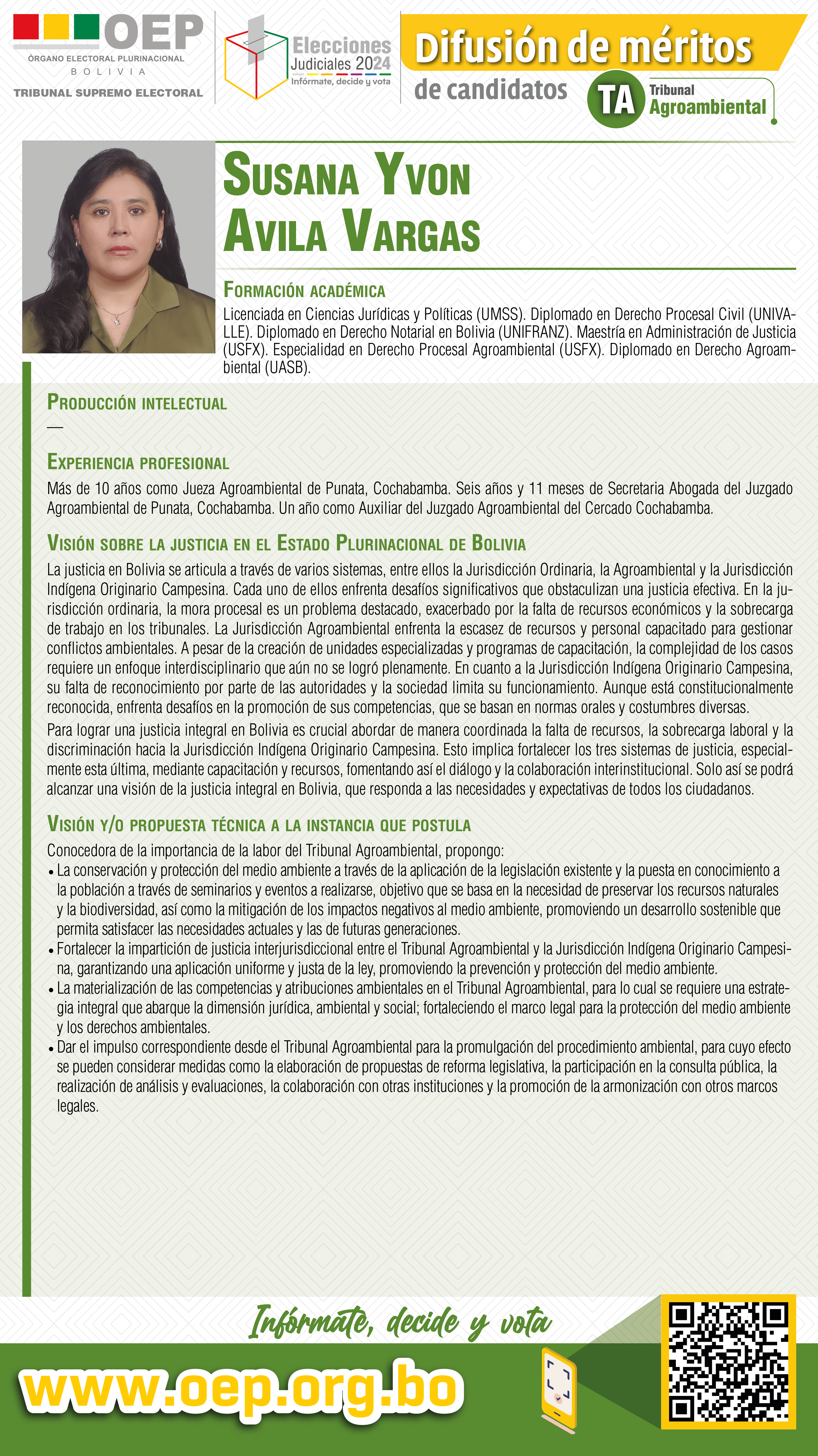 ELECCIONES JUDICIALES: Conozca a la candidata al Tribunal Agroambiental, Susana Yvon Avila Vargas