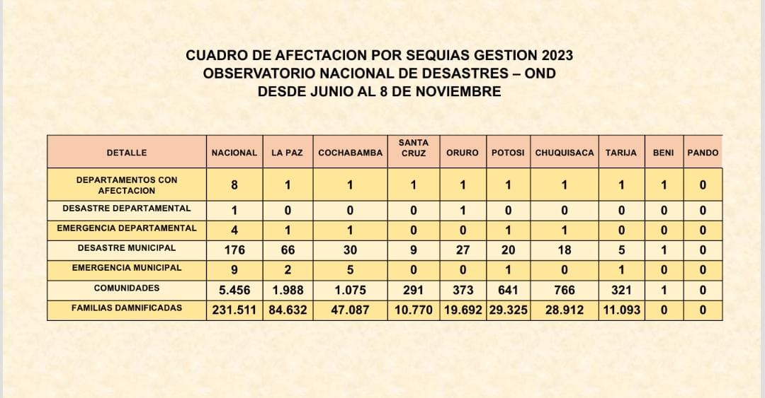 La Paz, 09 de noviembre de 2023 (ABI). – La sequía afectó a ocho departamentos del país y dejó damnificadas a 231.511 familias, informó este jueves el viceministro de Defensa Civil, Juan Carlos Calvimontes.