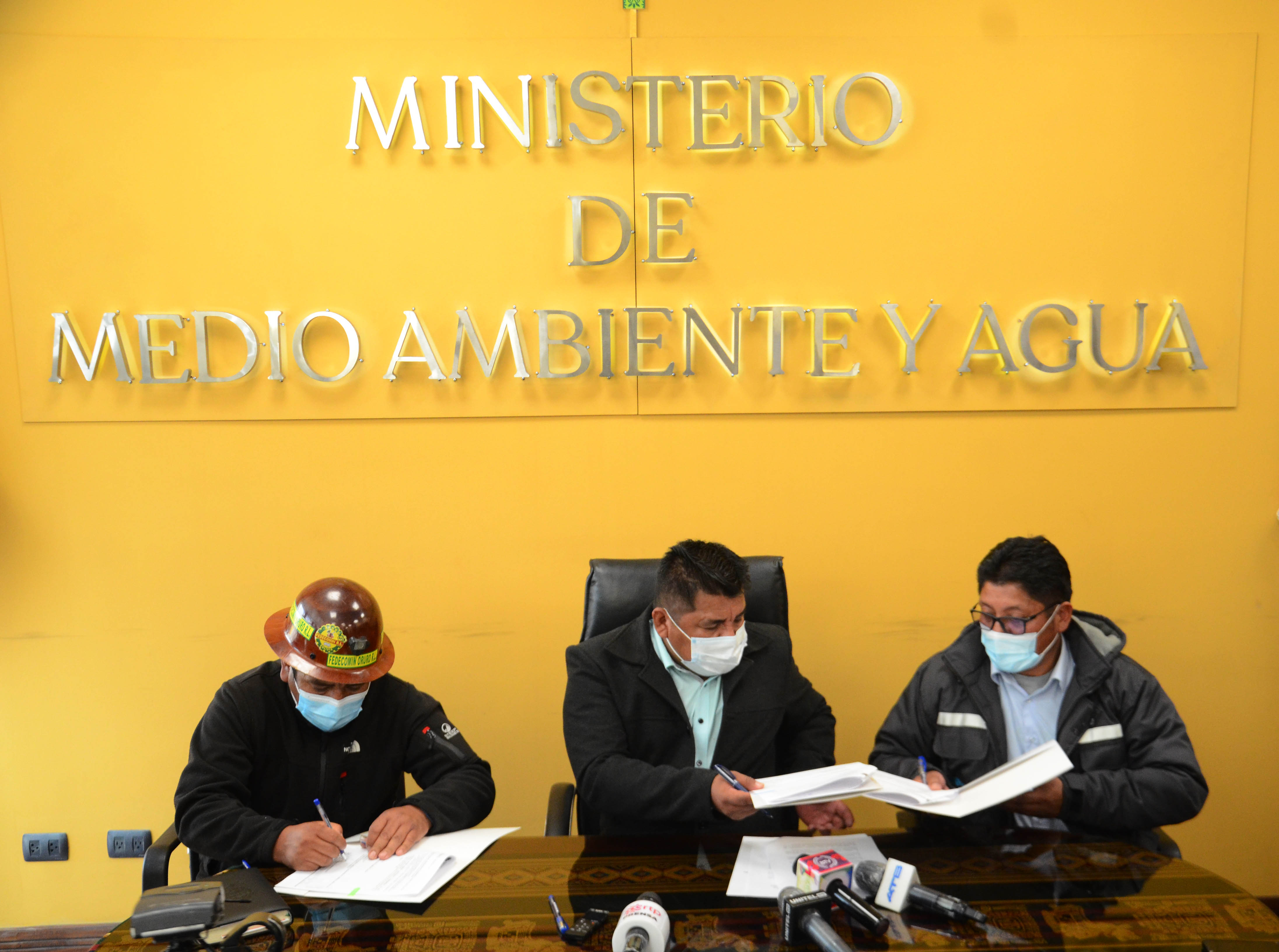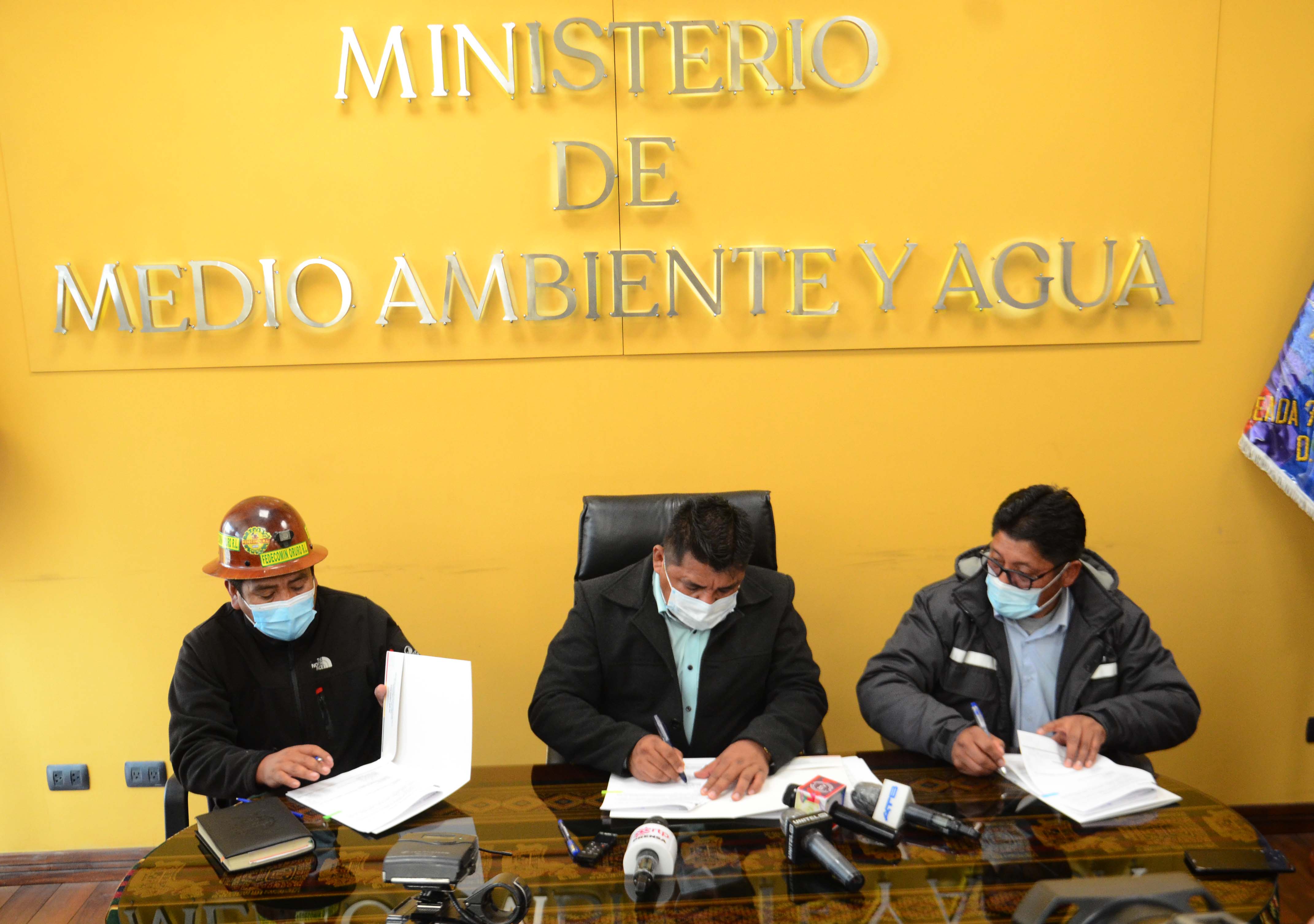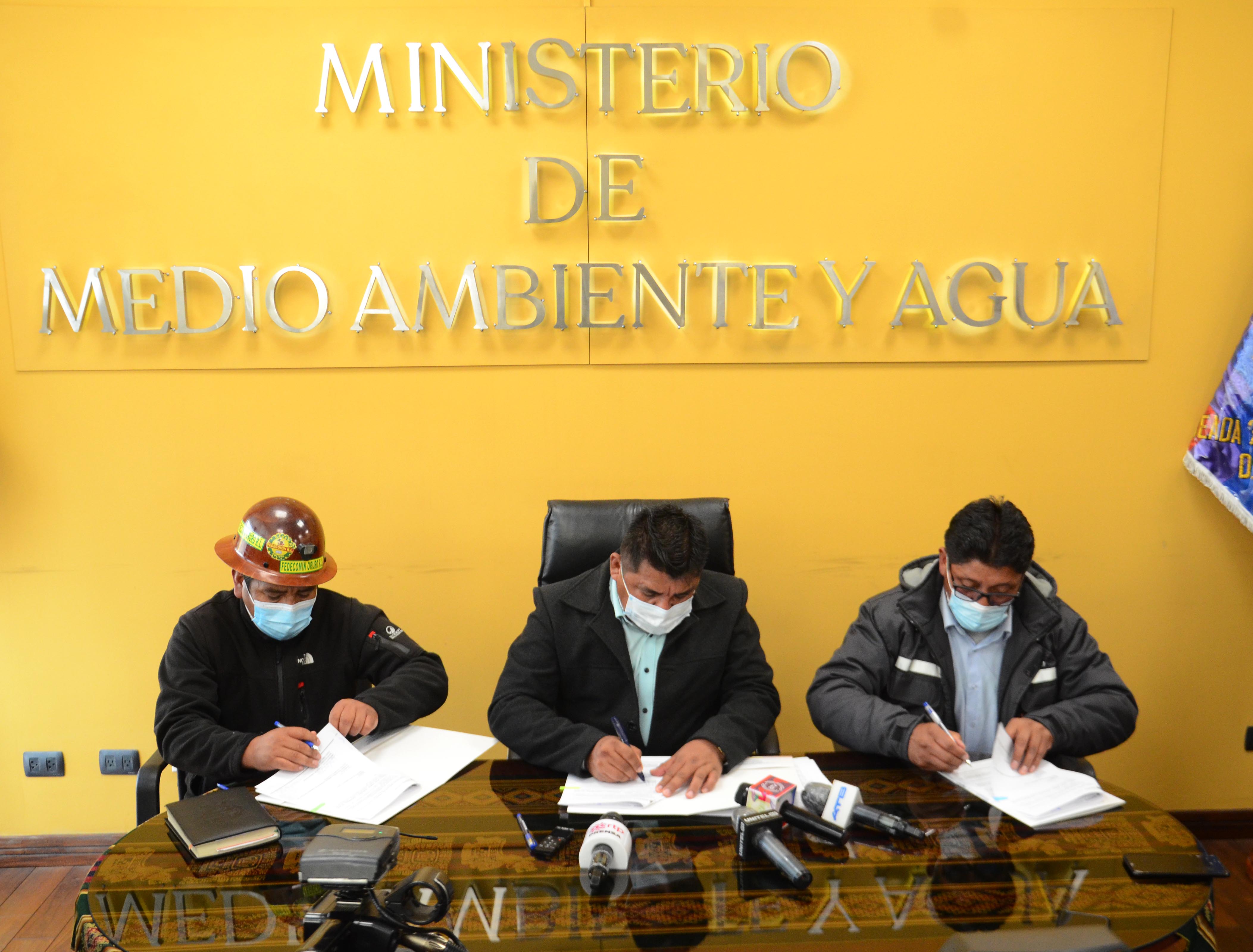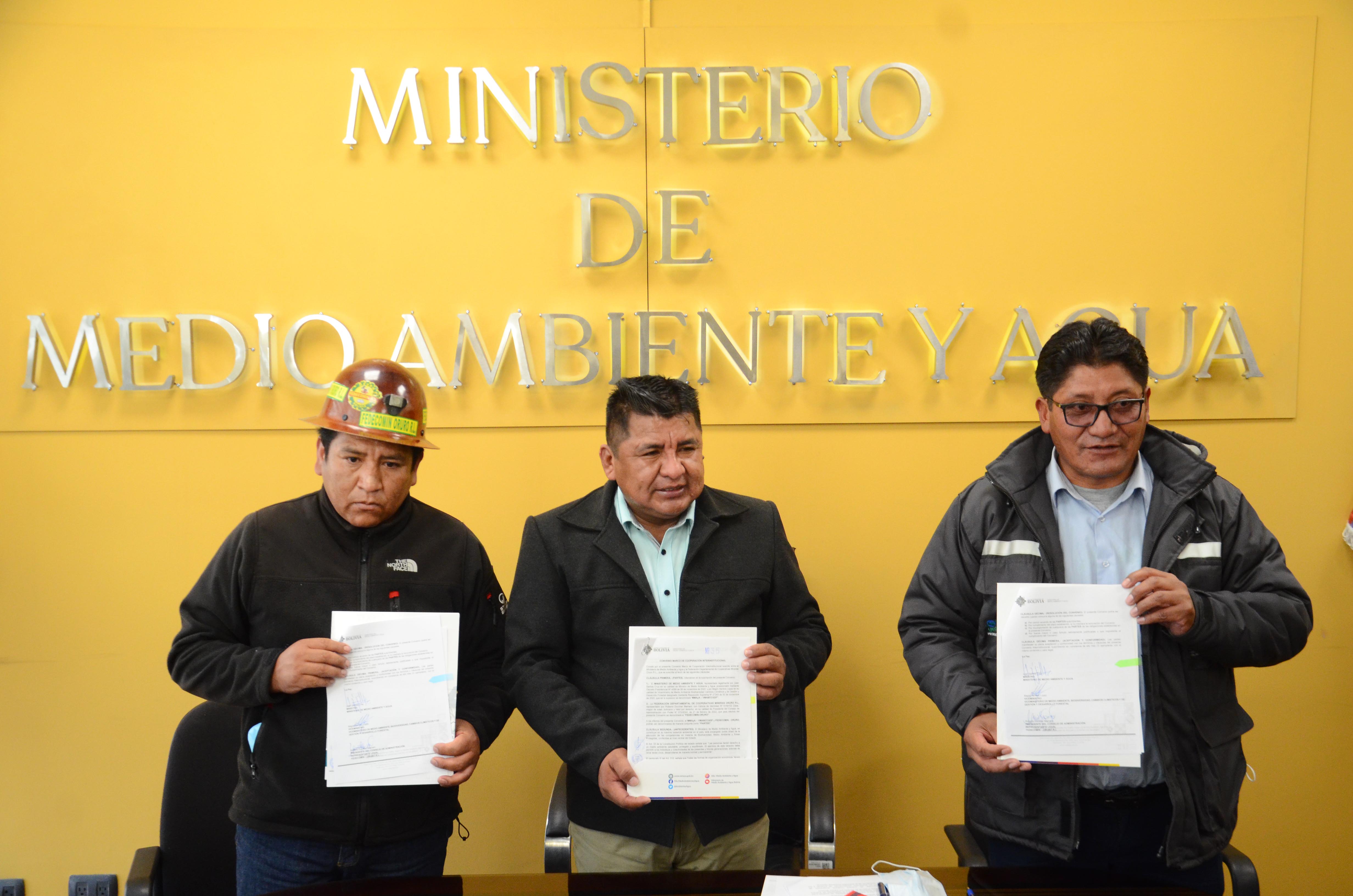 "Firma de Convenio de Cooperación Interinstitucional suscrito entre el Ministerio de Medio Ambiente y Agua - MMAYA y la Federación Departamental de Coperativas Mineras FEDECOMIN - ORURO."