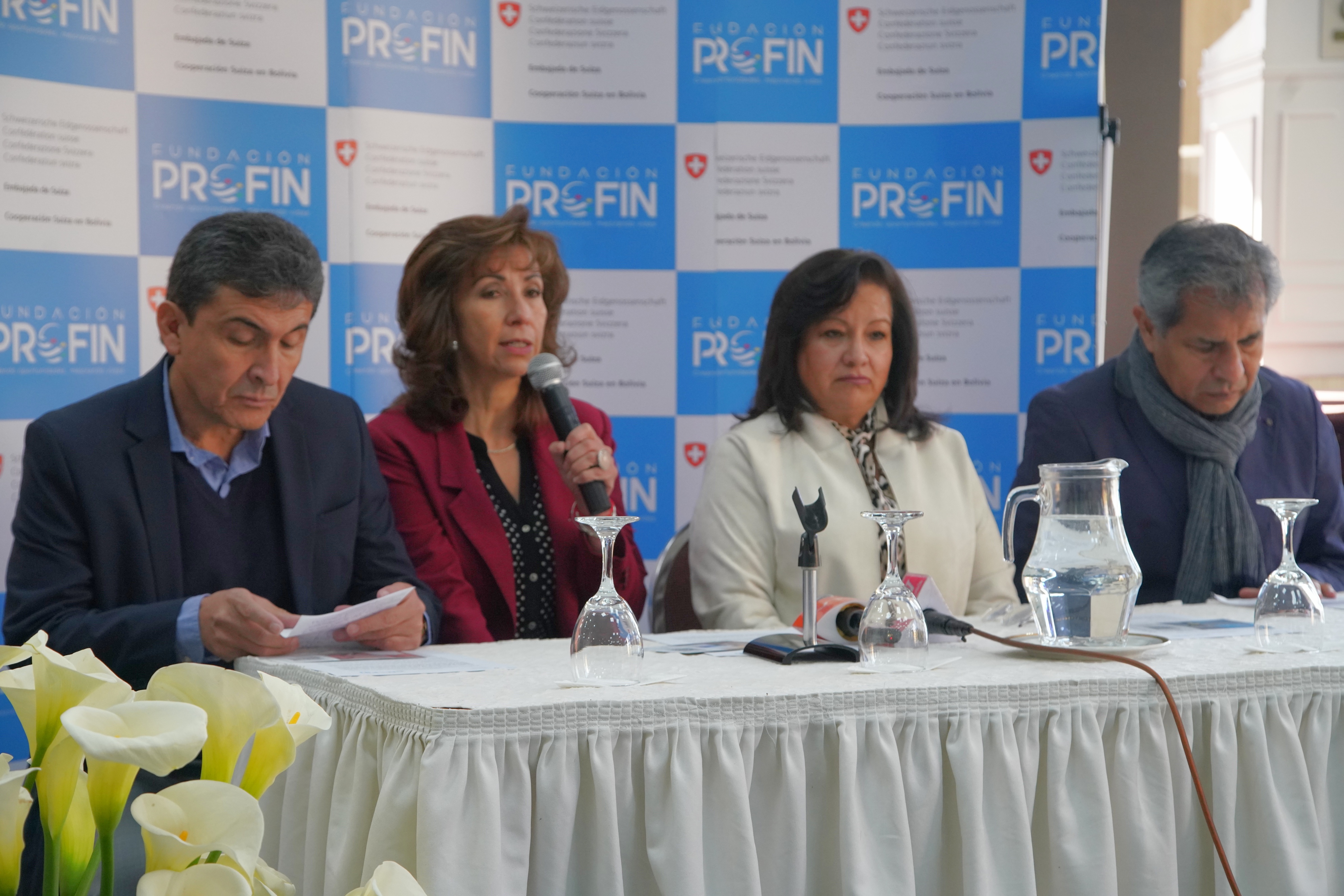 Conferencia de Prensa, voceros José Luis Pereira, Oficial Nacional de Programas de la Cooperación Suiza; Kathia Ferrufino, Presidenta Directorio PROFIN; Edwin Vargas, sobre los avances y resultados finales del proyecto seguros inclusivos en Bolivia