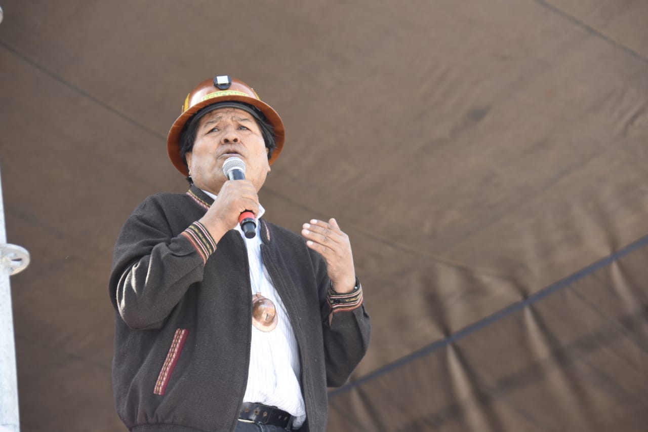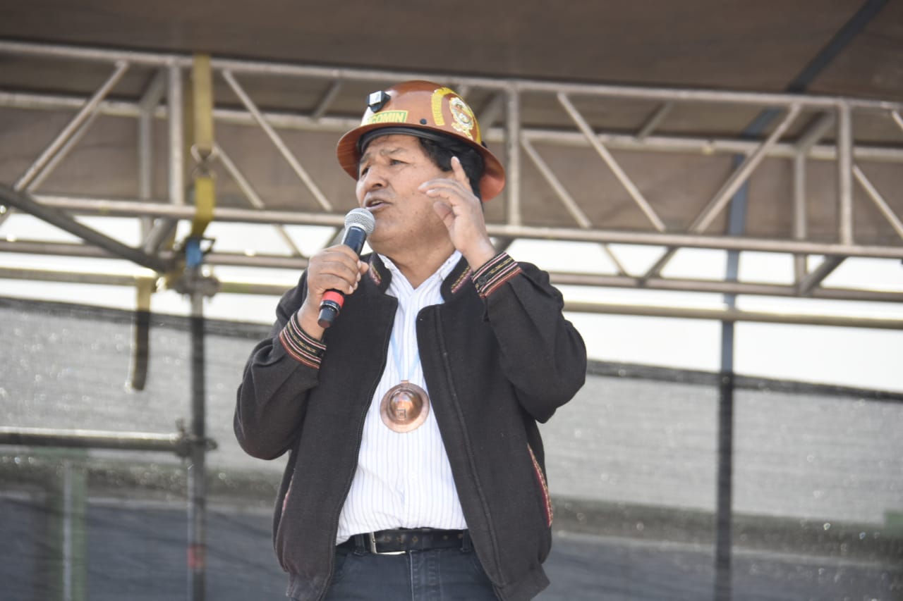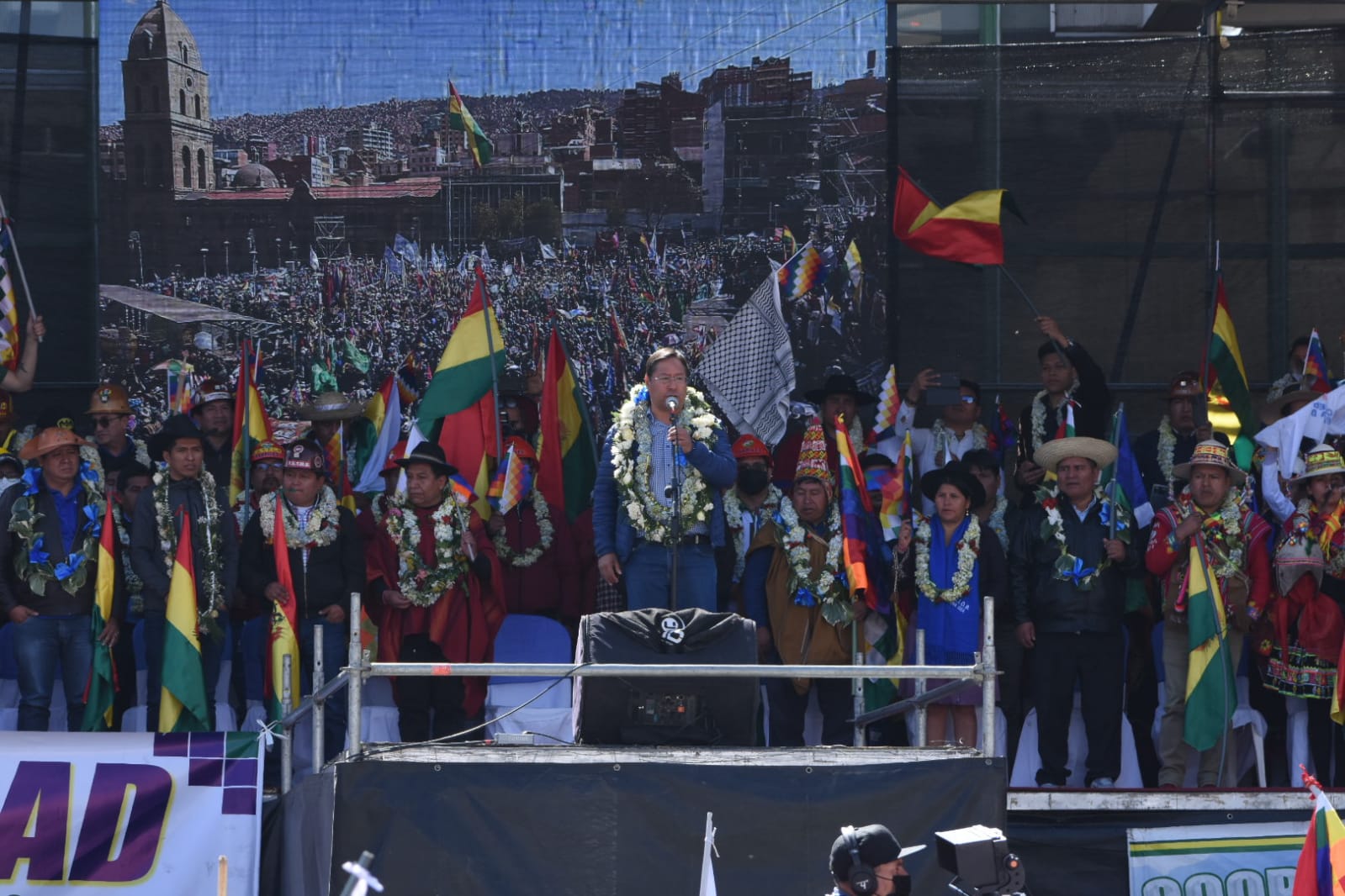 Presidente Luis Arce, Vicepresidente David Choquehuanca y ex Presidente Evo Morales discursan ante la concentración de los marchistas llegados en Defensa de la Democracia y la Reconstrucción Económica