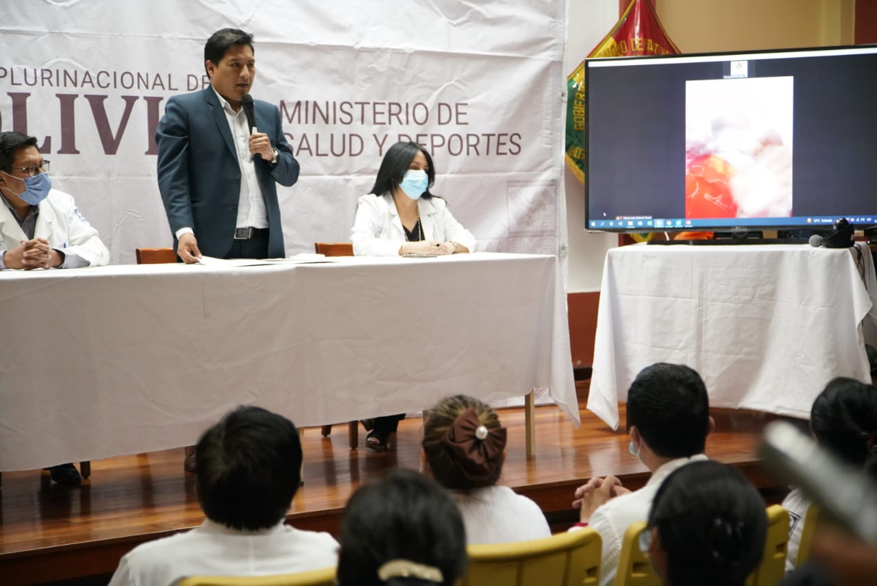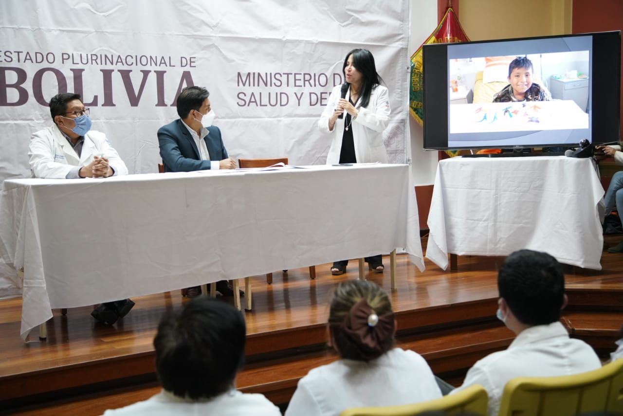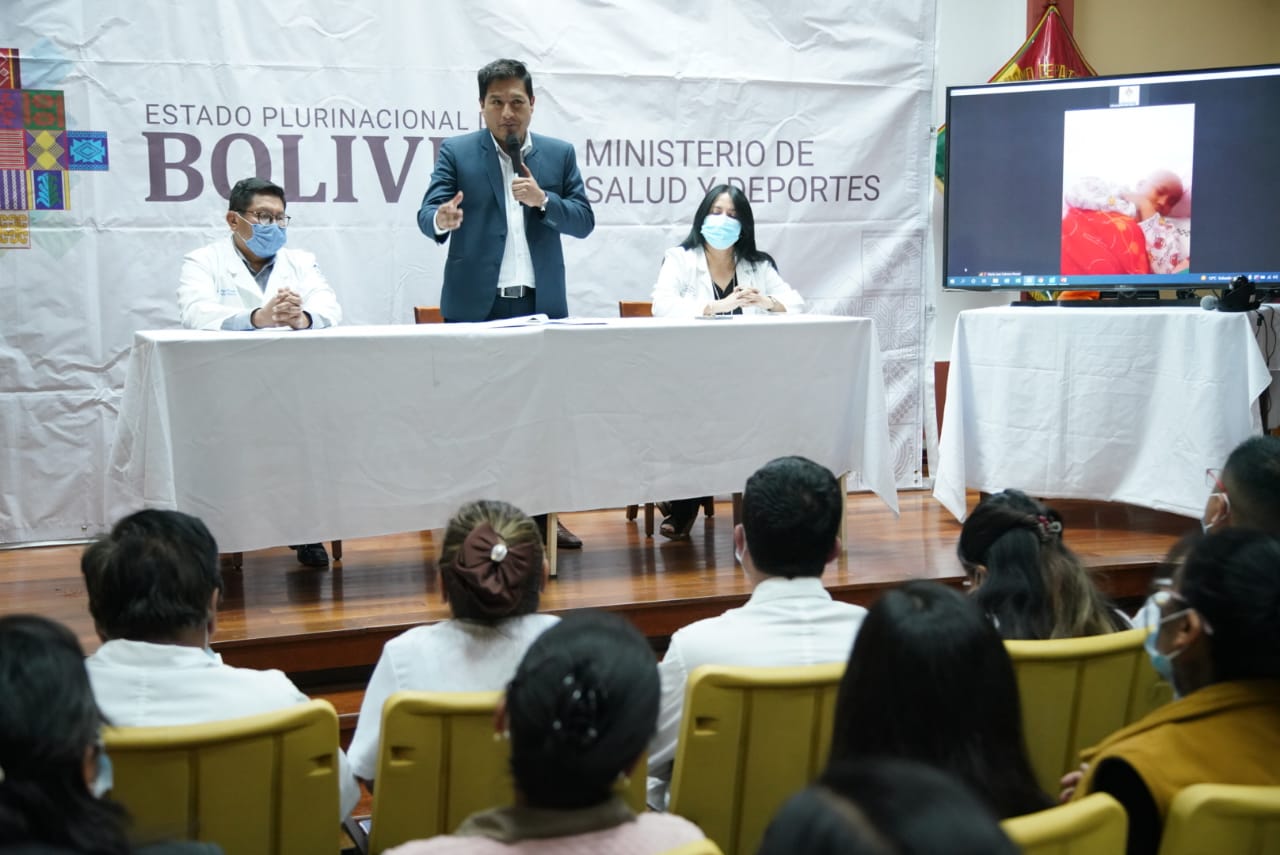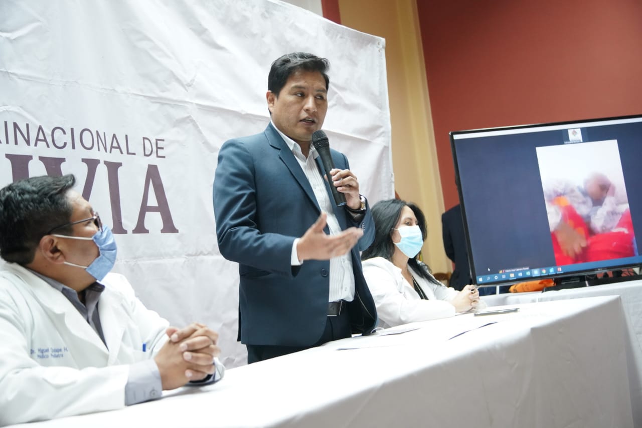 Dr. Jeyson Auza, Ministro de Salud y Deportes, en acto por el alta del niño Jhoel Ajnota Montaño y el reconocimiento a profesionales que intervinieron en el primer trasplante pediátrico alogenico de medula ósea en Bolivia