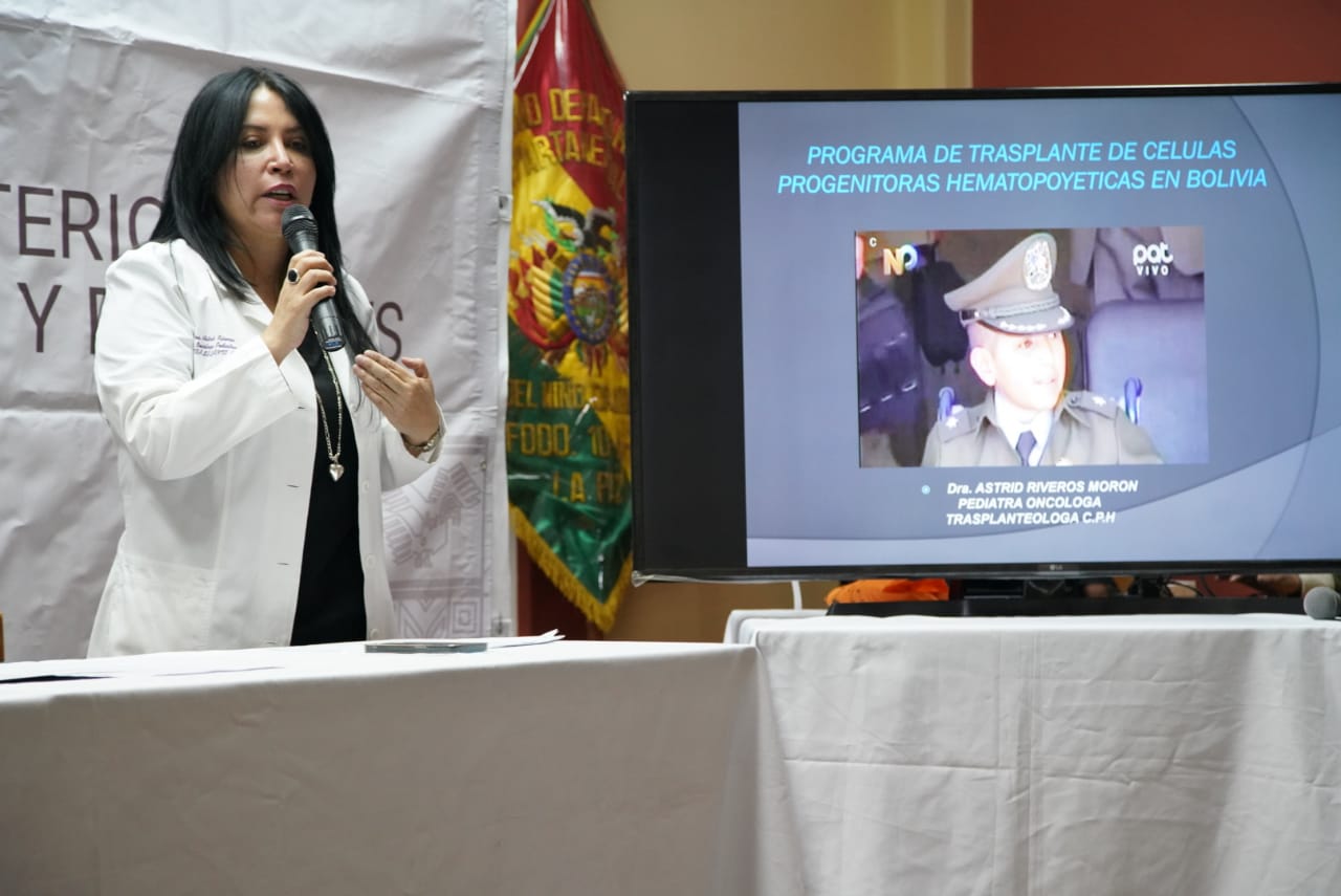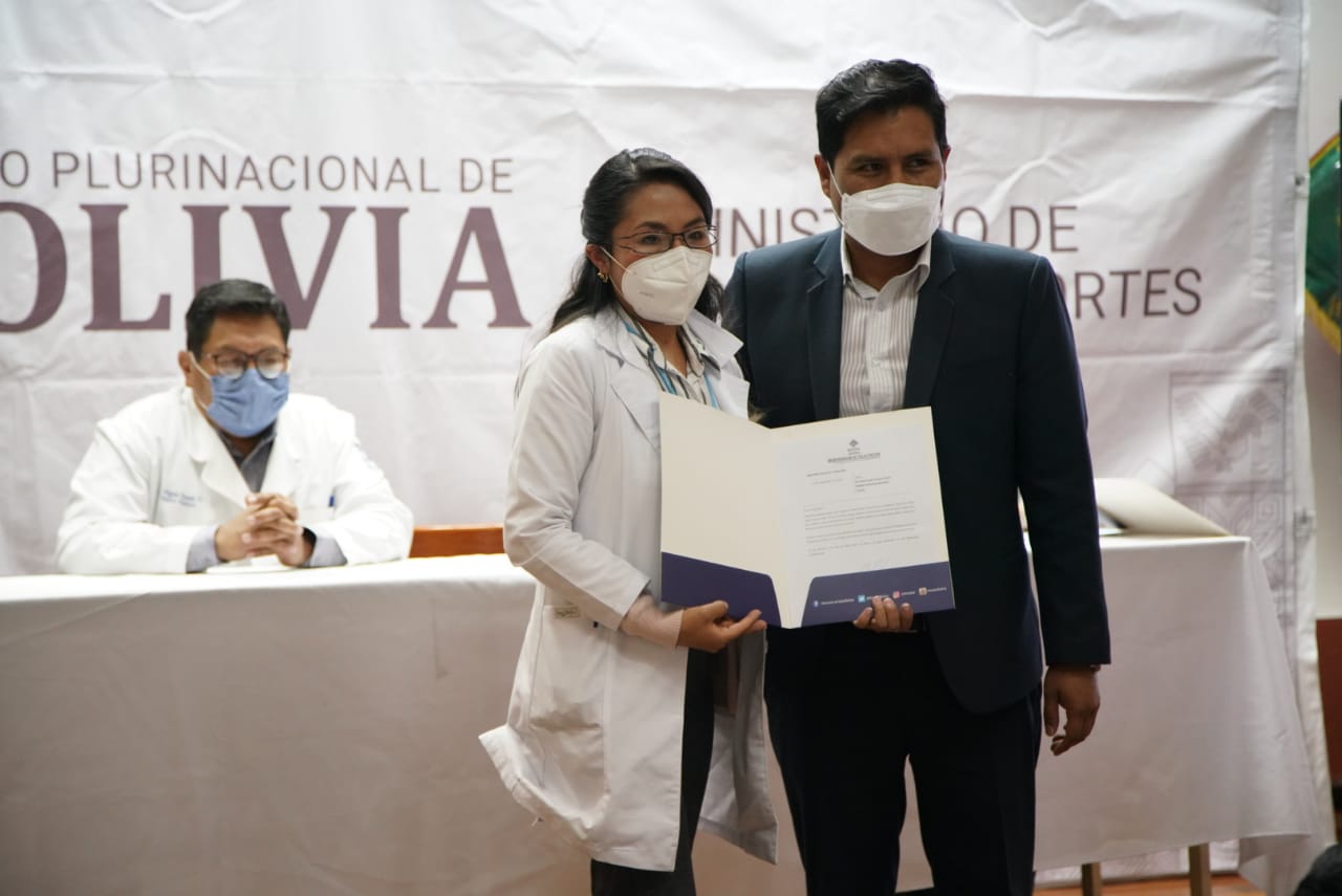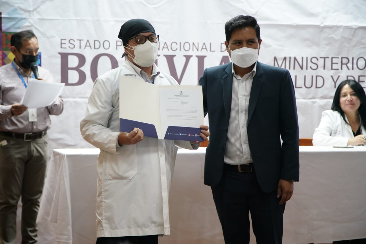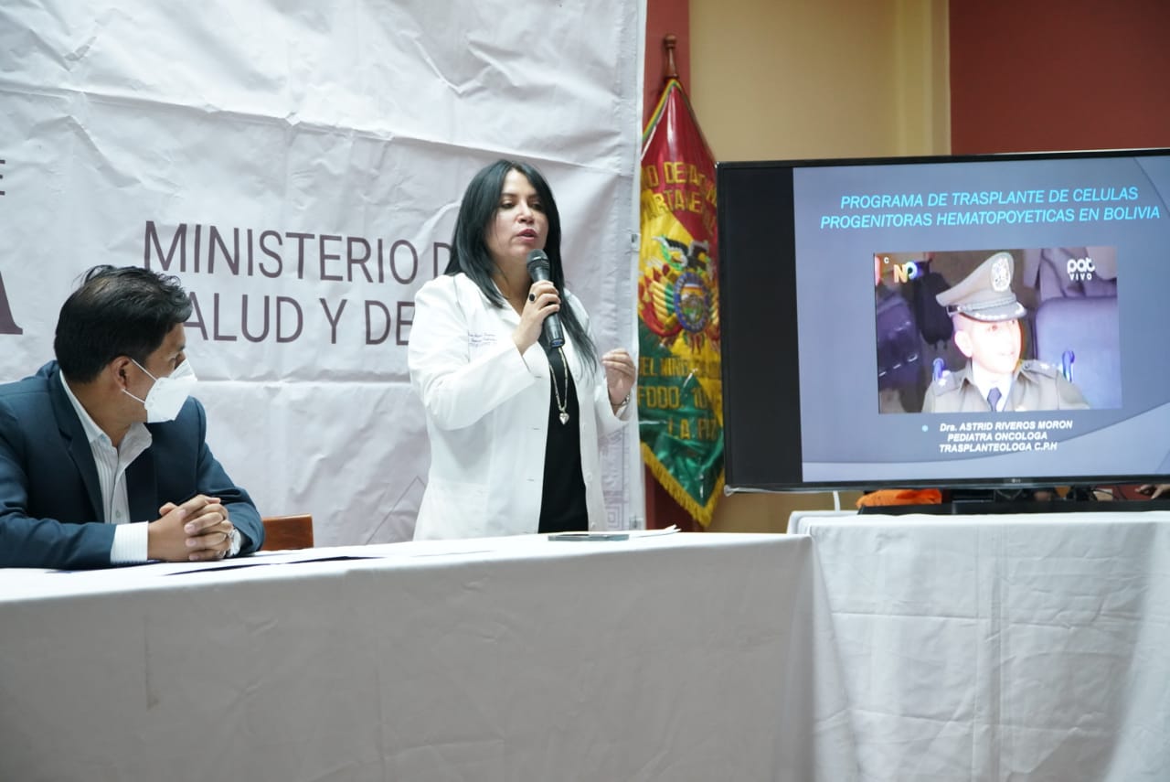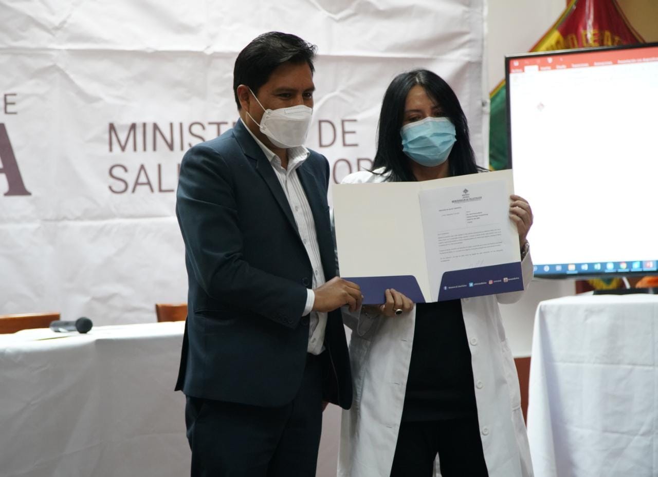 Dr. Jeyson Auza, Ministro de Salud y Deportes, en acto por el alta del niño Jhoel Ajnota Montaño y el reconocimiento a profesionales que intervinieron en el primer trasplante pediátrico alogenico de medula ósea en Bolivia