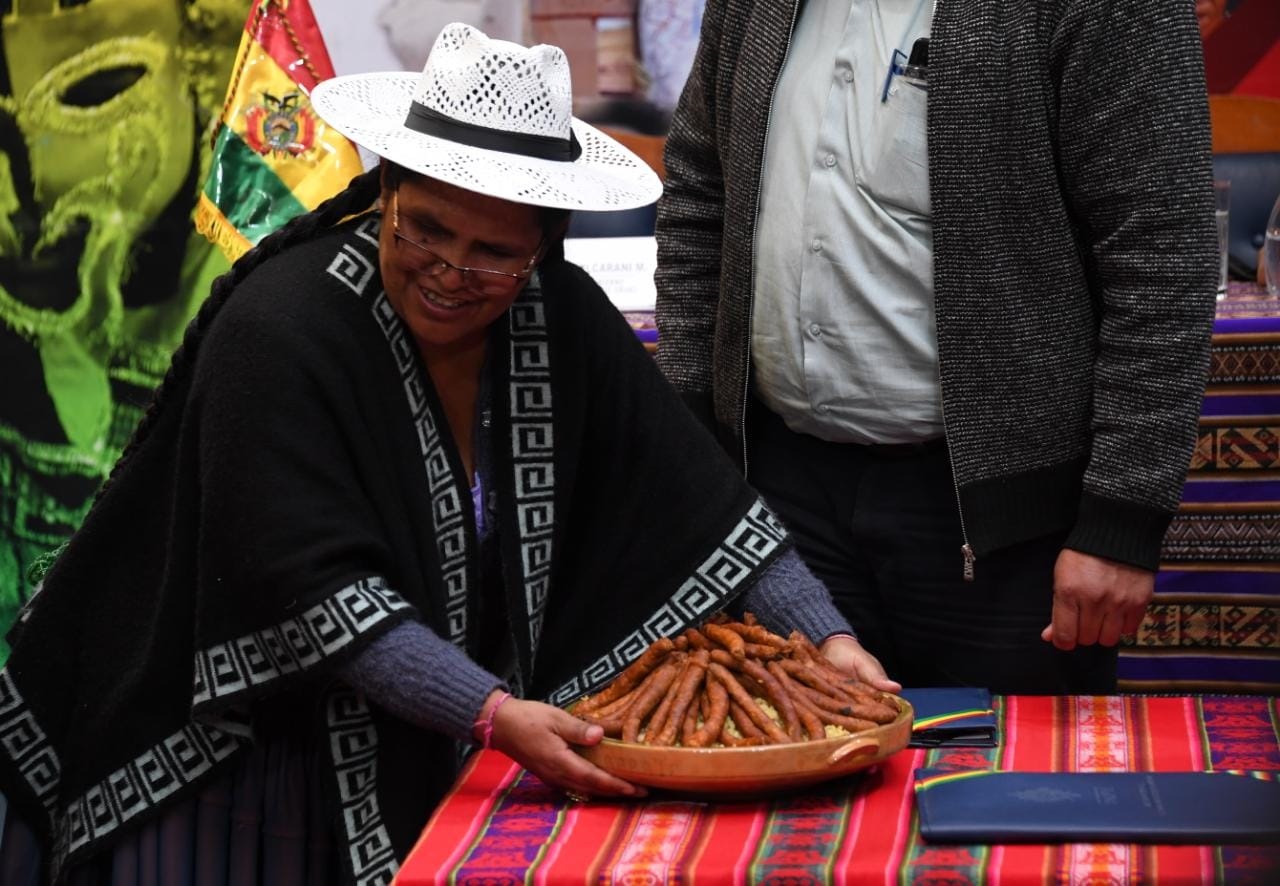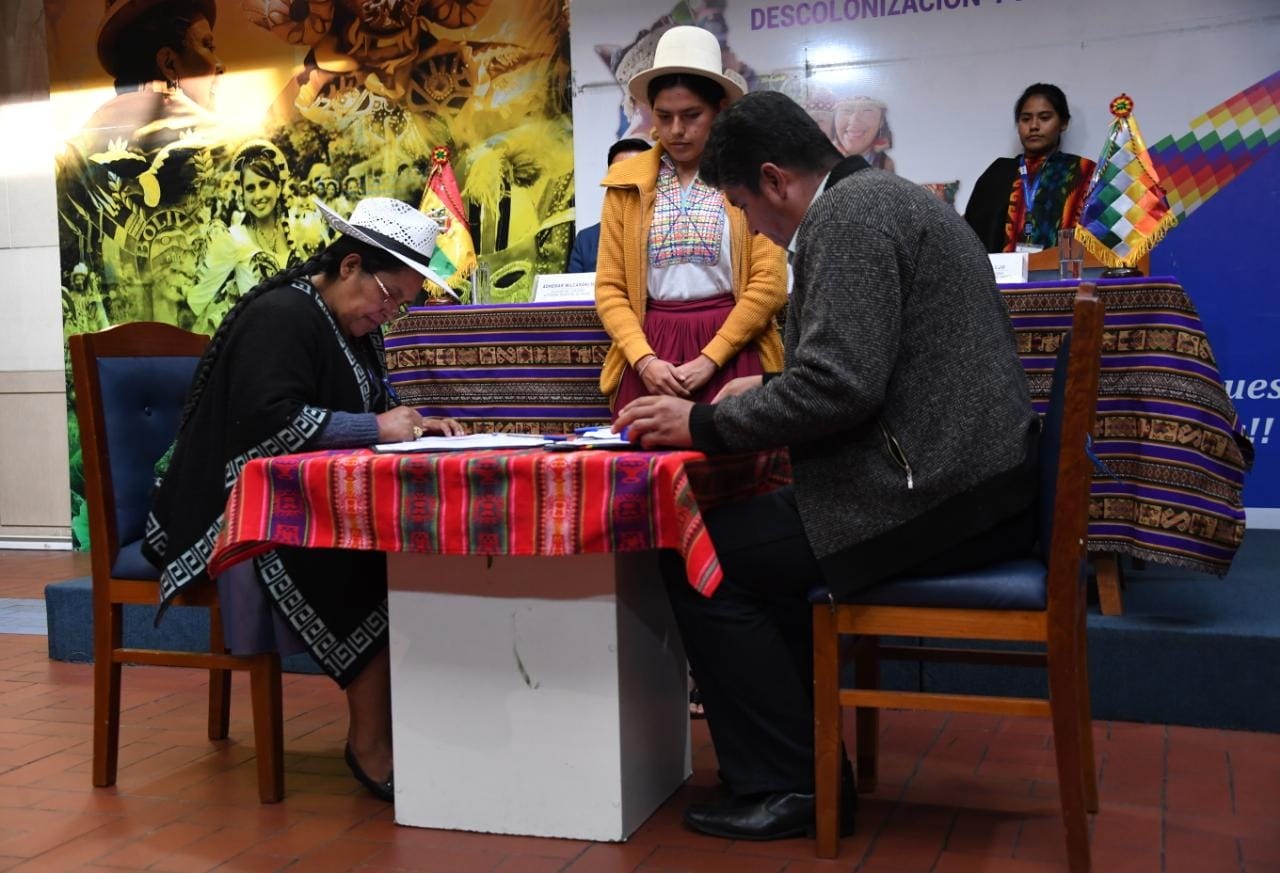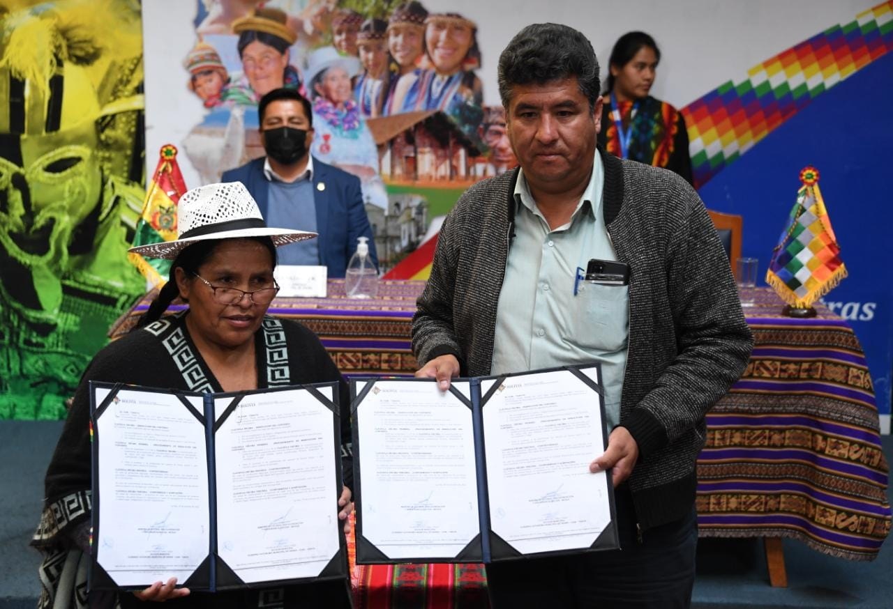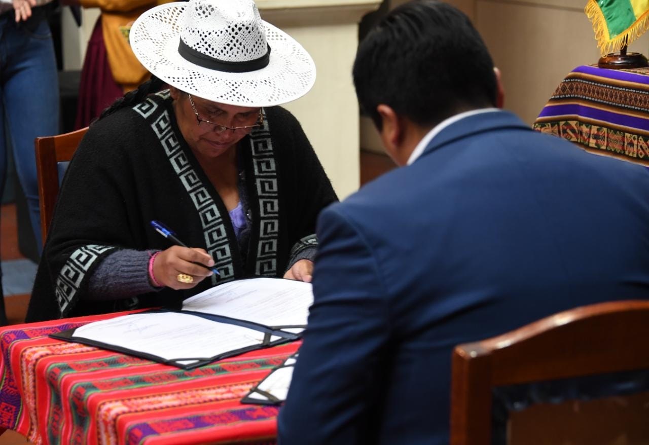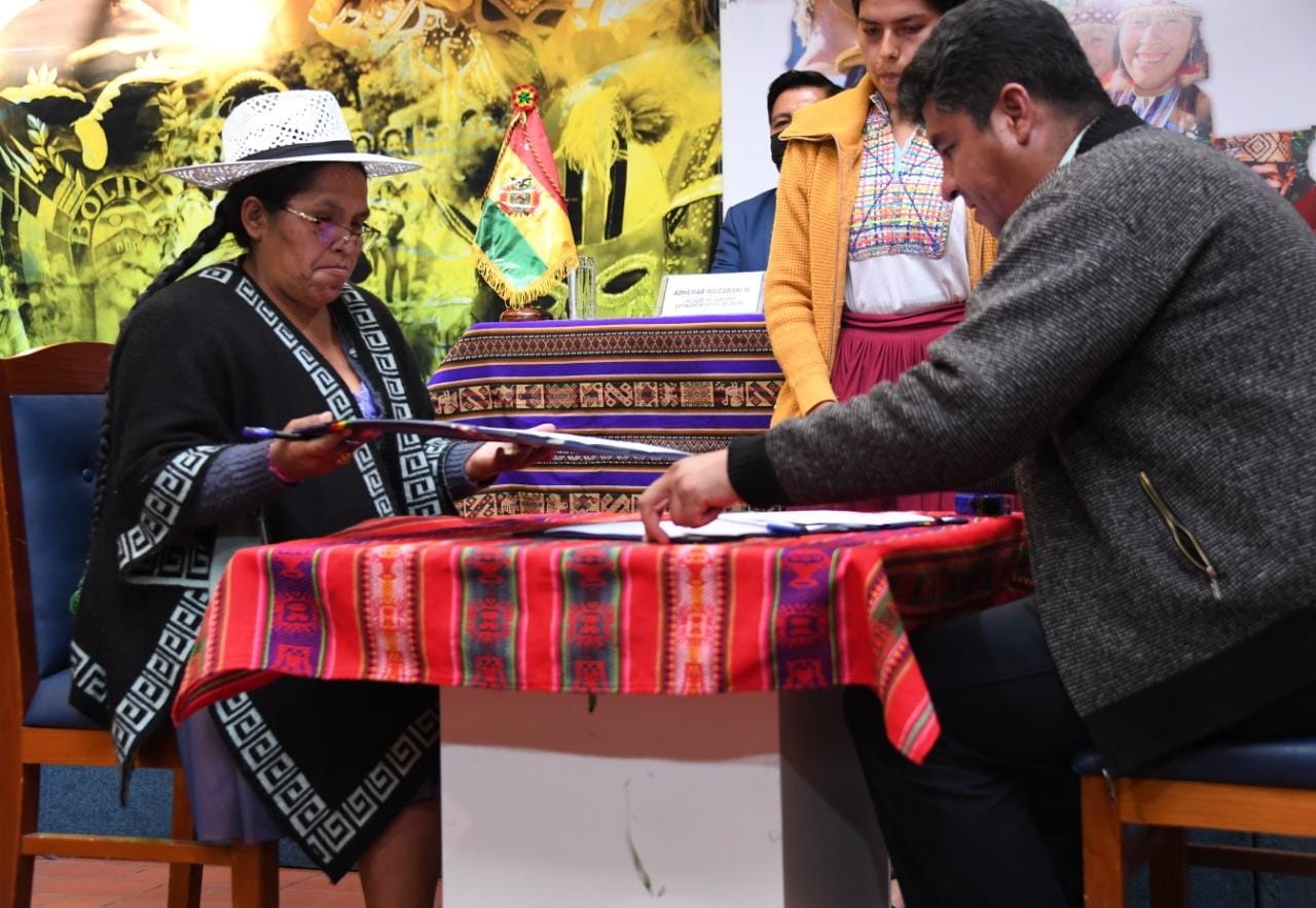 La Ministra de Culturas, Descolonización y Despatriarcalización, Sabina Orellana, firma un Convenio con Gobiernos Autónomos Municipales de Oruro y Tarata para la Construcción de Espacios Culturales "Casas de las Memorias''