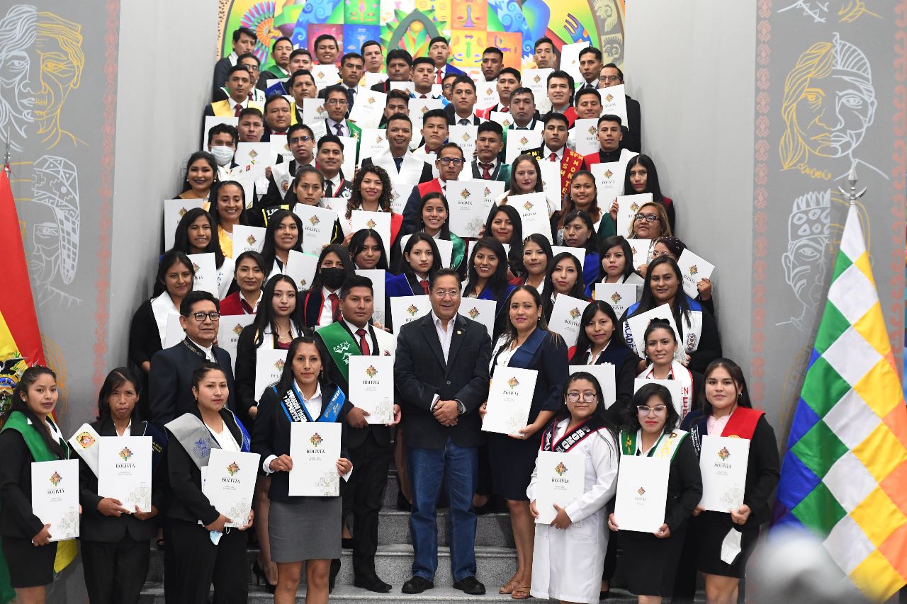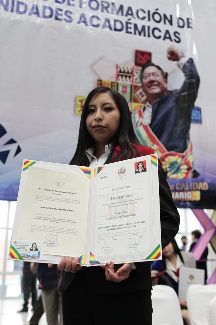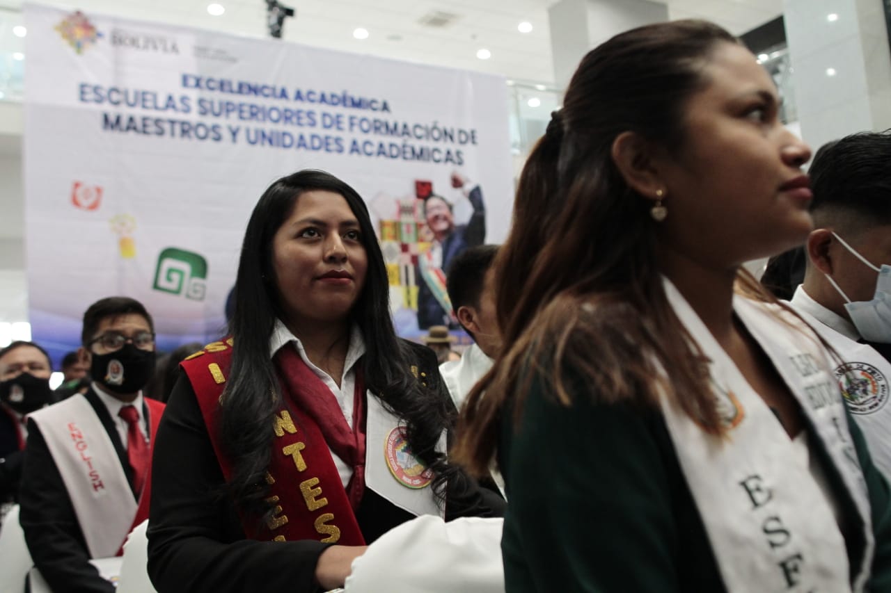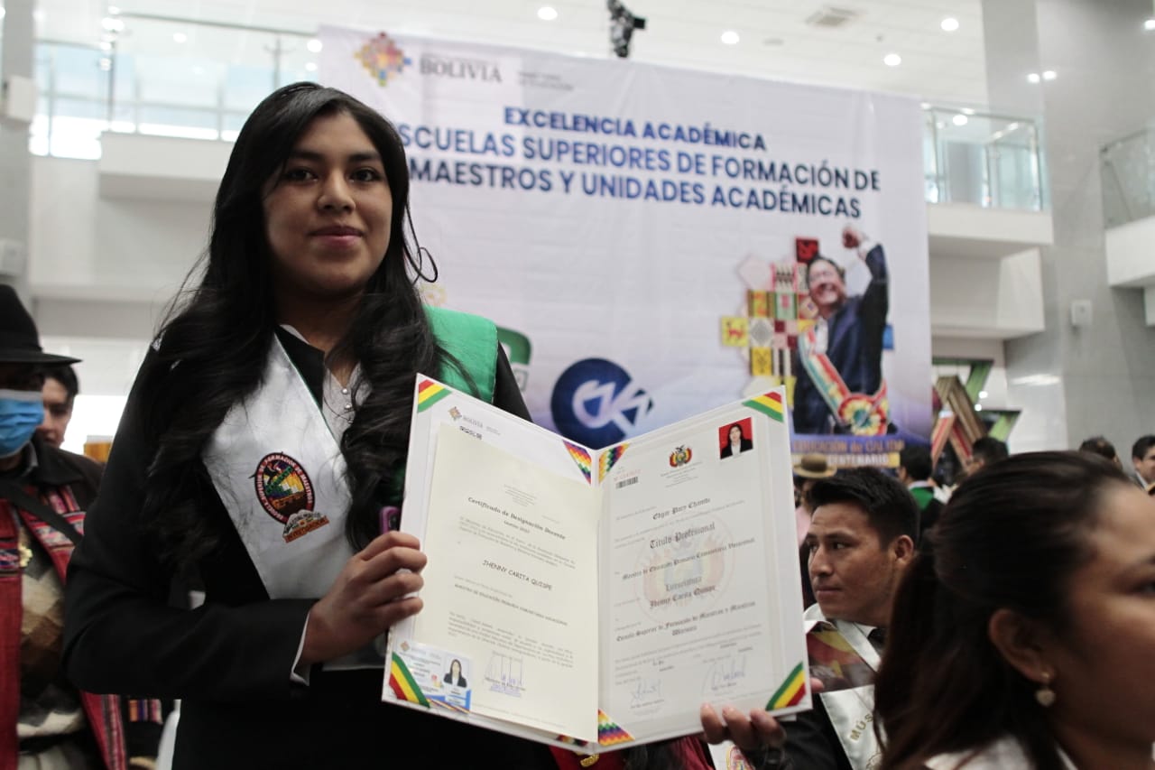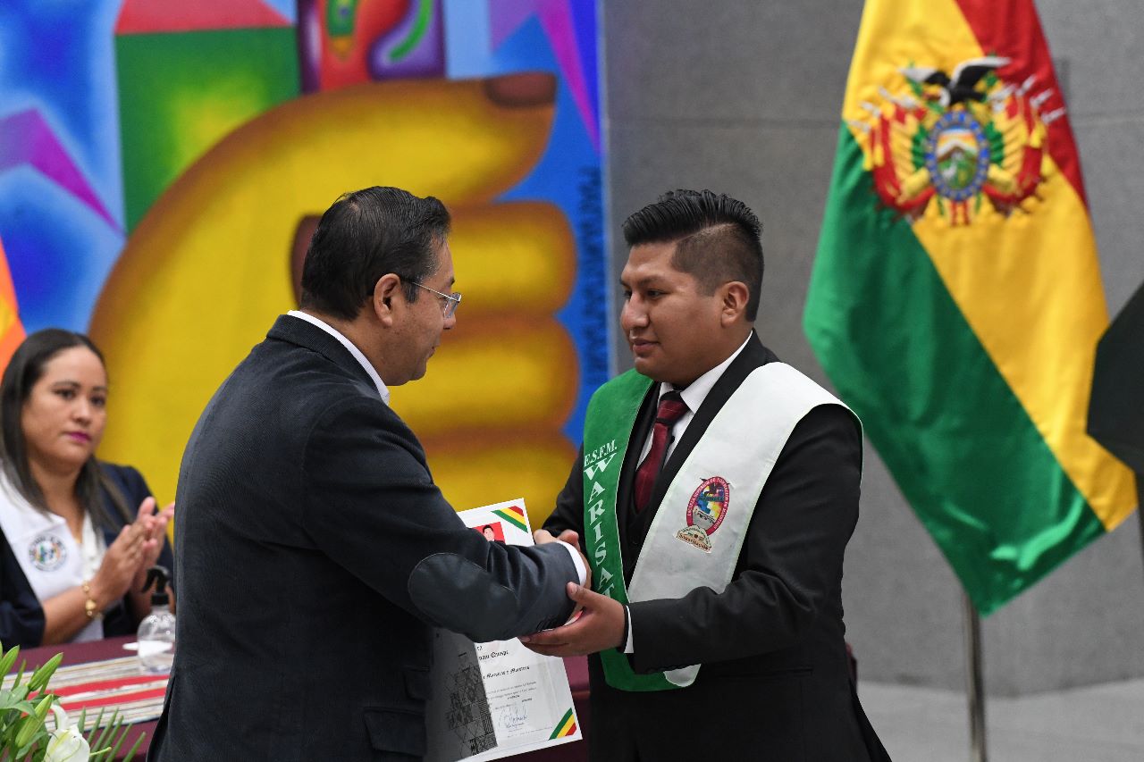 El Presidente Luis Arce realizó la entrega de certificados de excelencia a maestros y maestras de las institutos superiores de formaciones de maestros (2/2)Usuario ABIGalería Fotográfica 01 Diciembre 2022 Visto: 10844ShareTwittearshare with Whatsappshare with Telegram FOTOS VICECOMAnteriorSiguiente