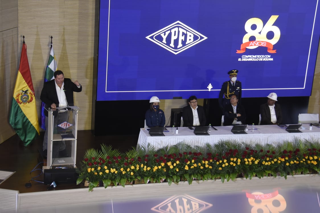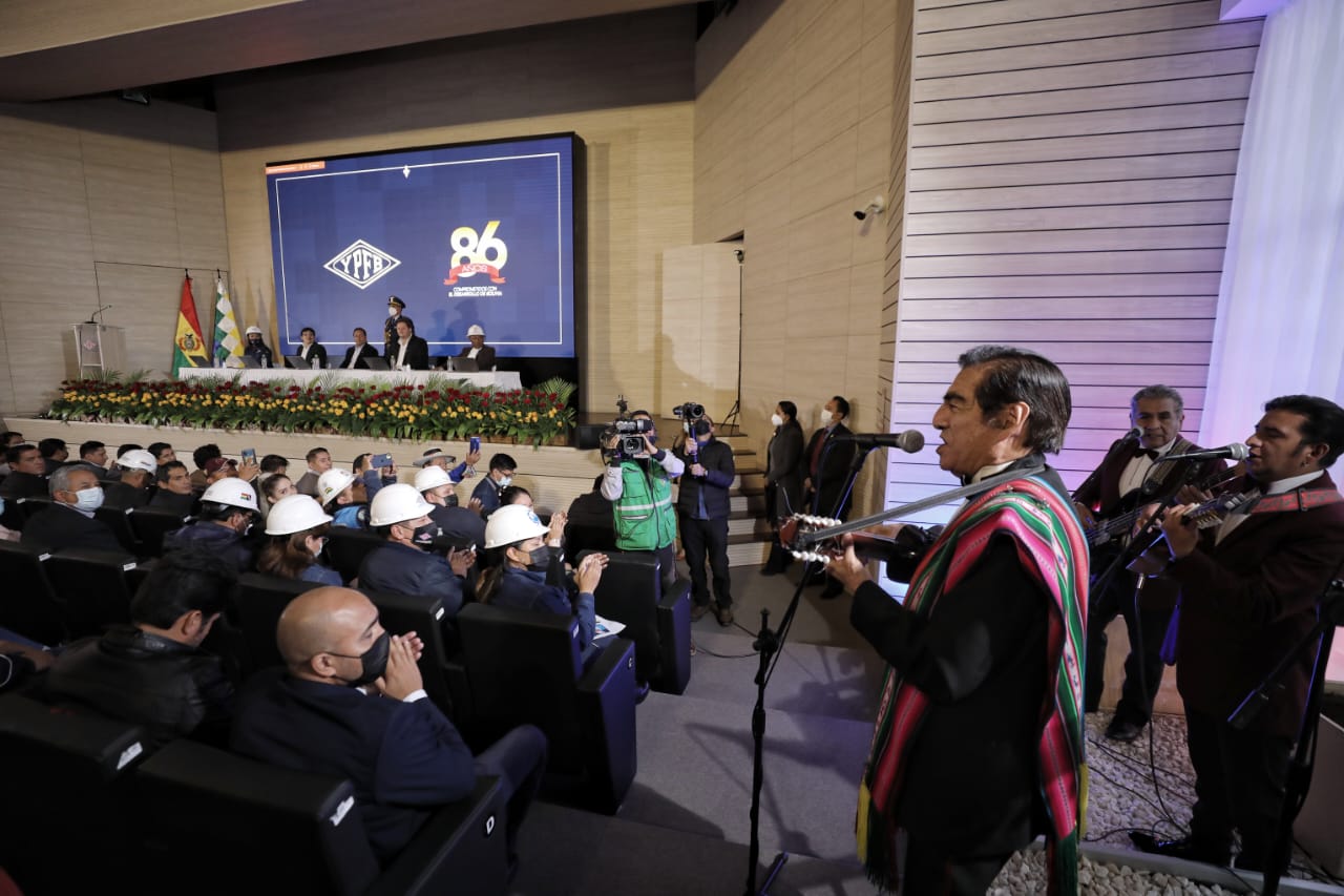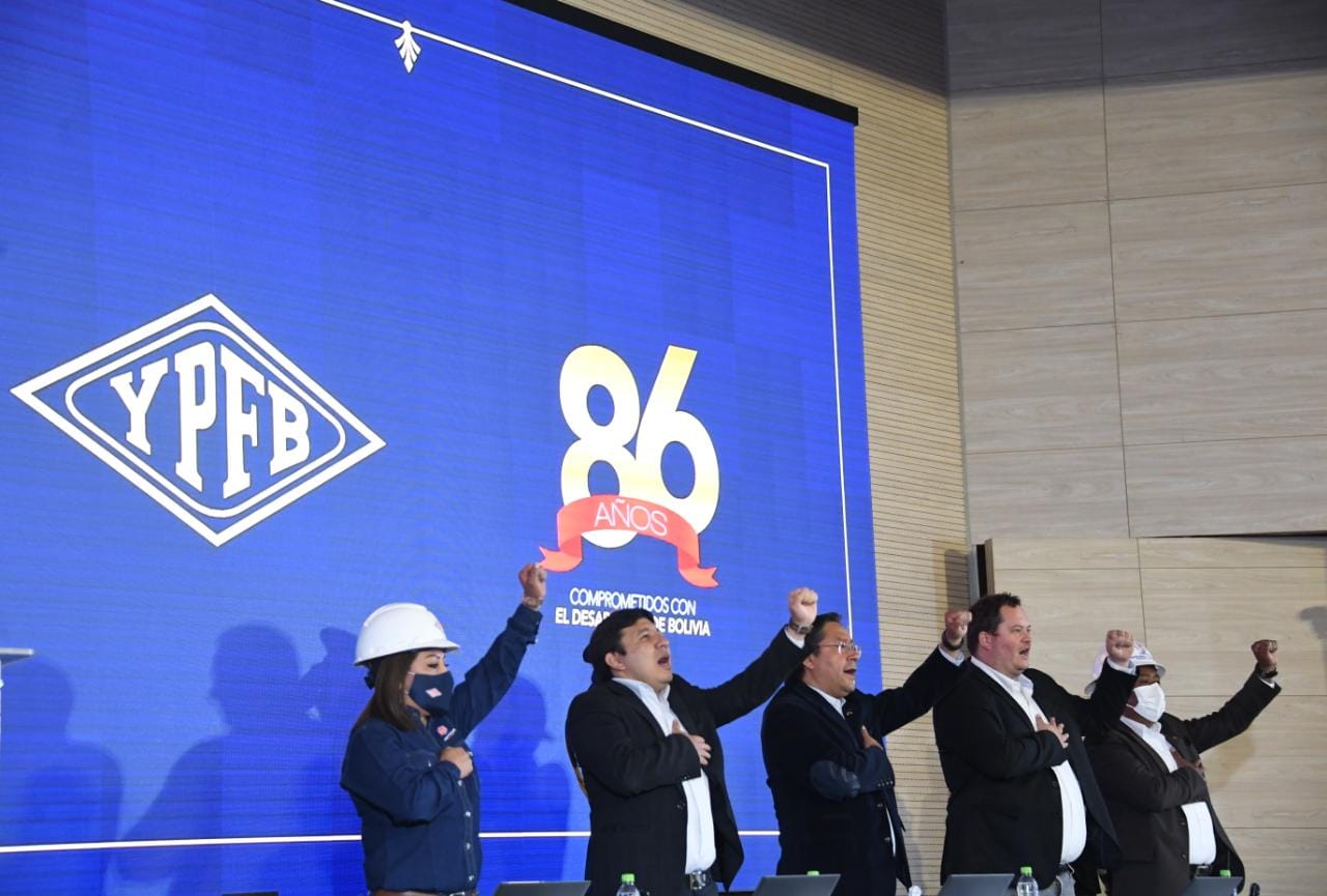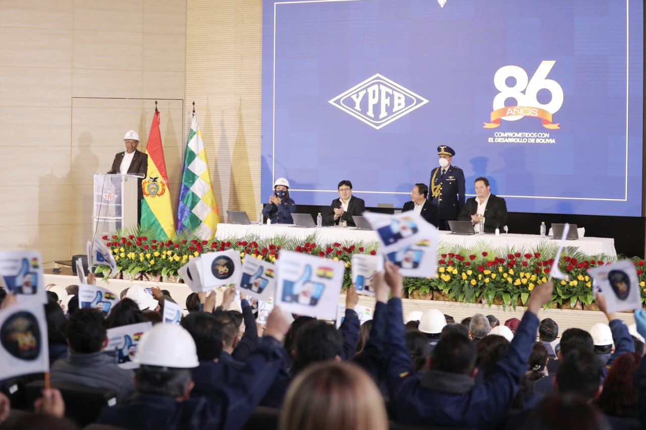 El presidente del Estado Plurinacional de Bolivia, Luis Arce, participa del acto por el 86 aniversario de la empresa estatal Yacimientos Petrolíferos Fiscales Bolivianos YPFB Corp.