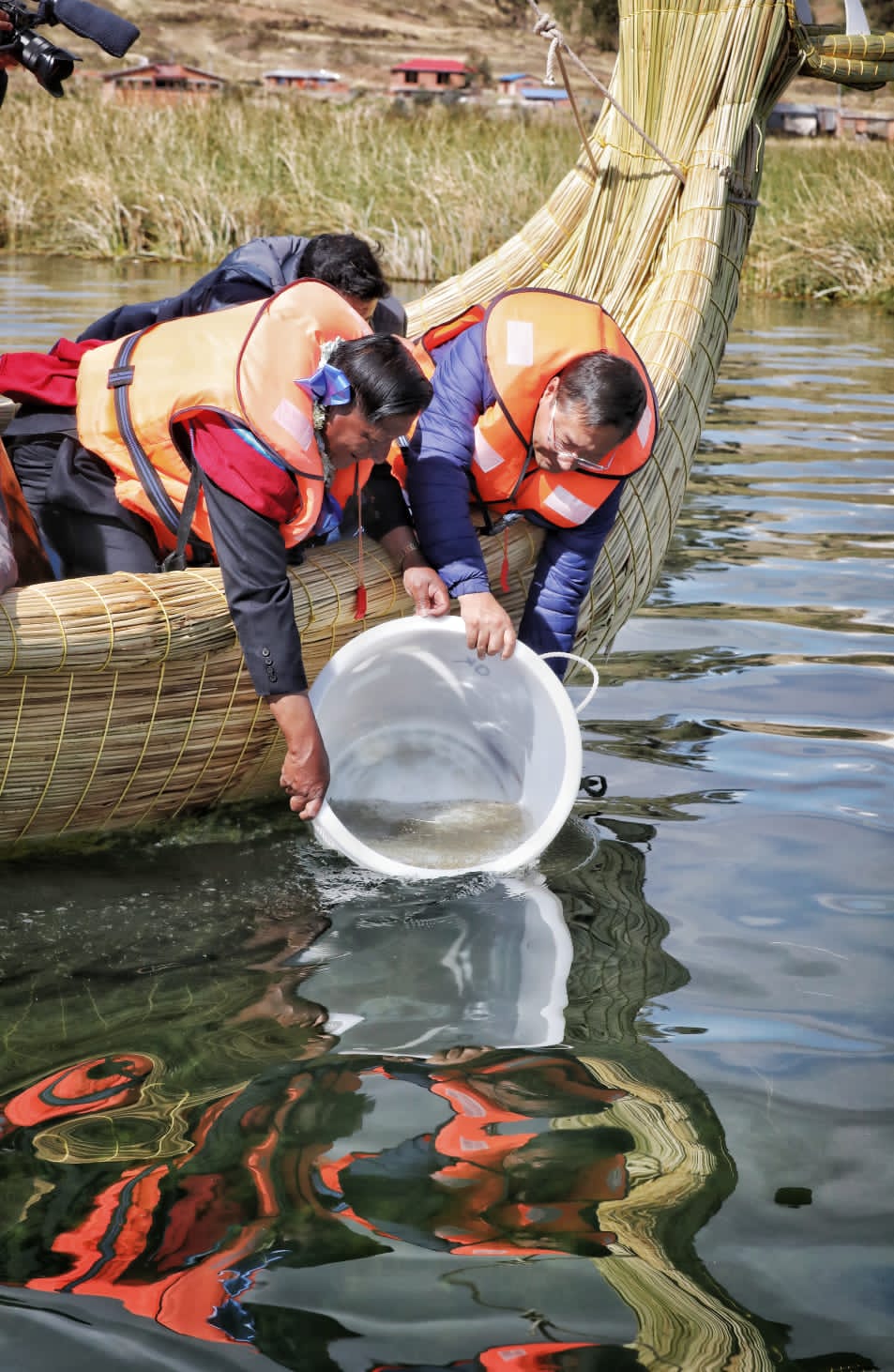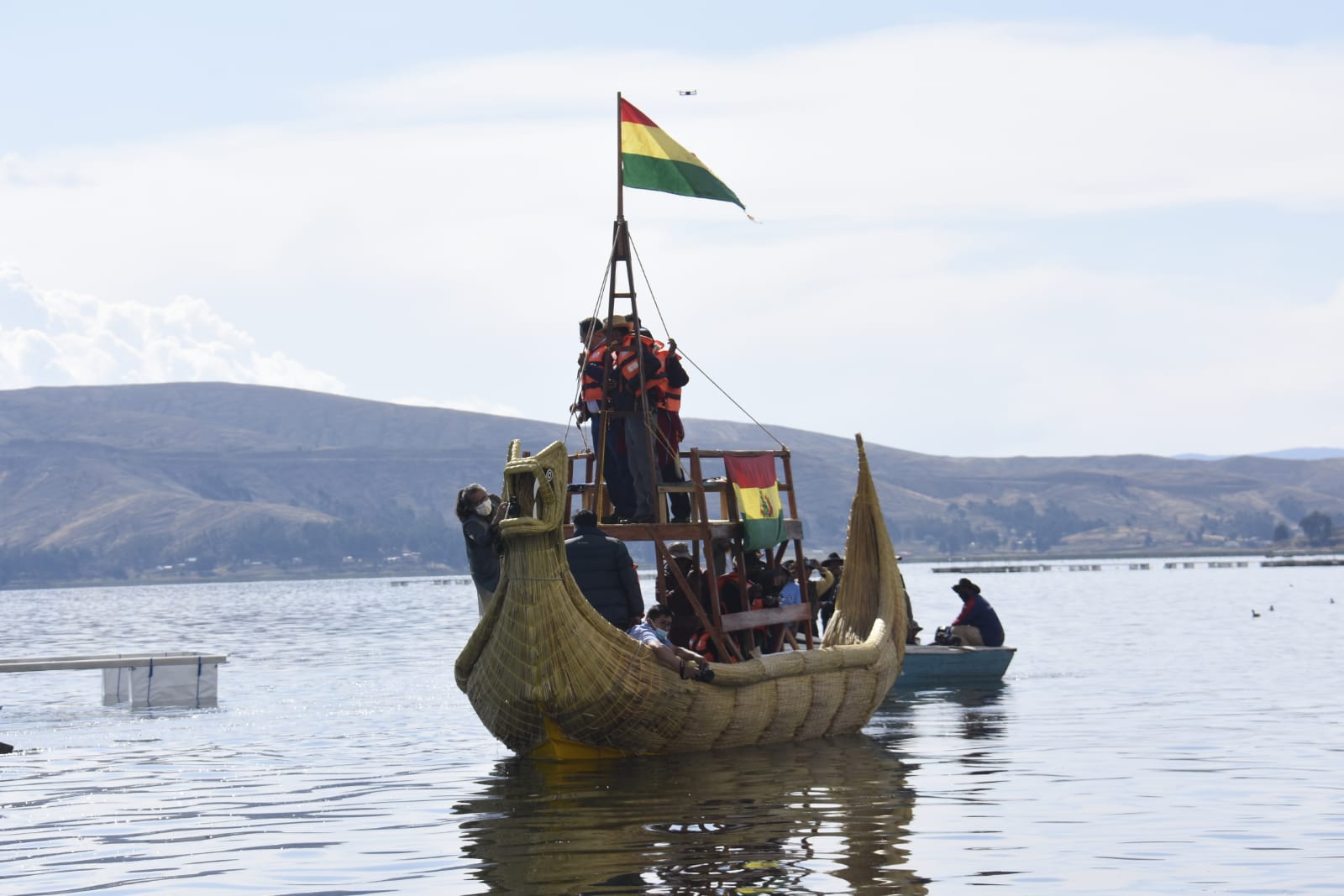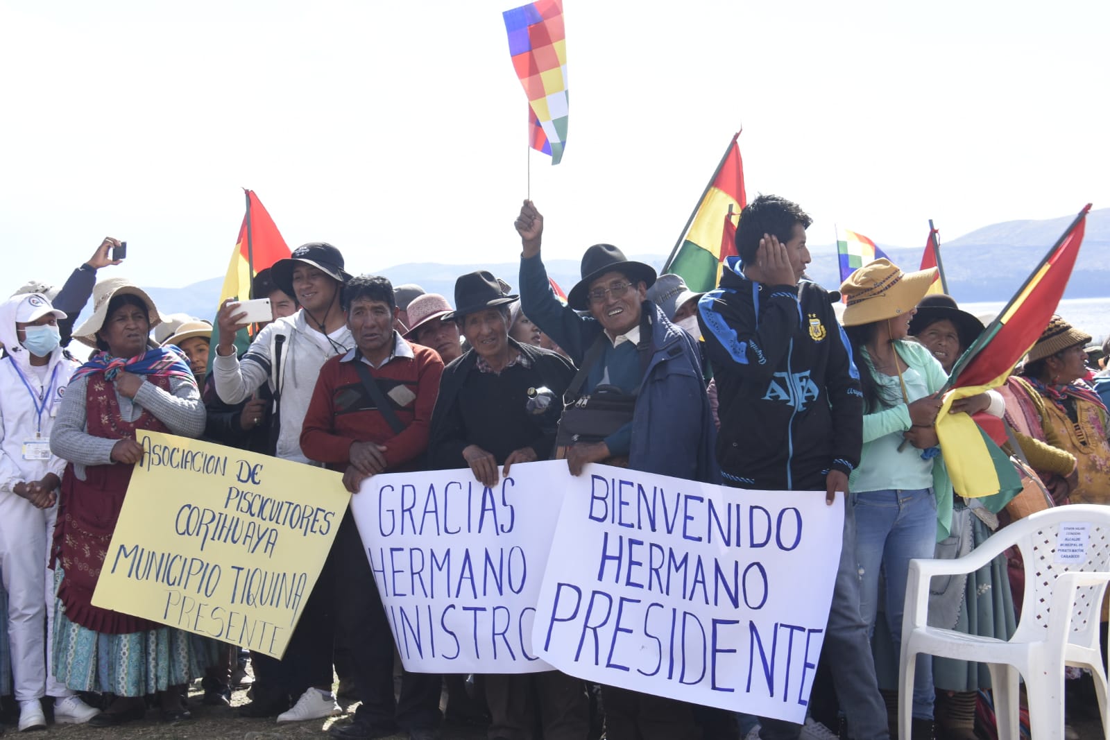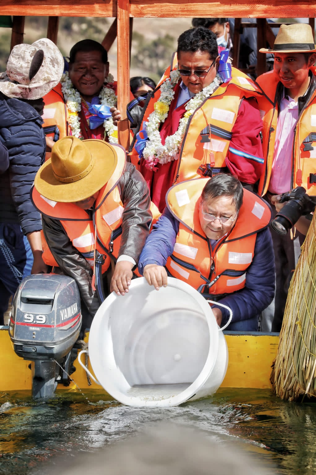 El Presidente del Estado Plurinacional de Bolivia Luis Arce Catacora participa en la siembra de alevines de carachi amarillo y negro en el Lago Titicaca, en Chua Cocani, La Paz