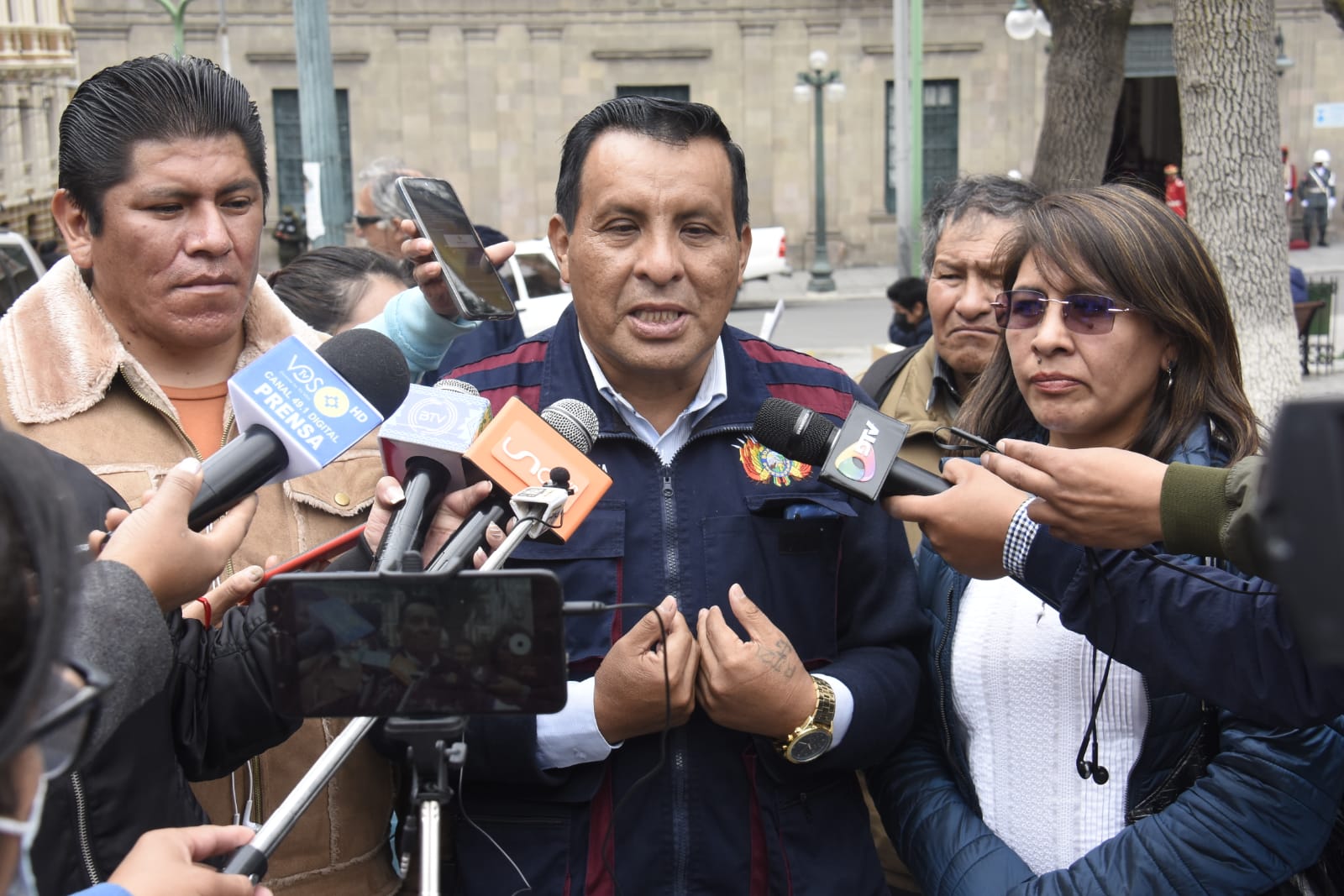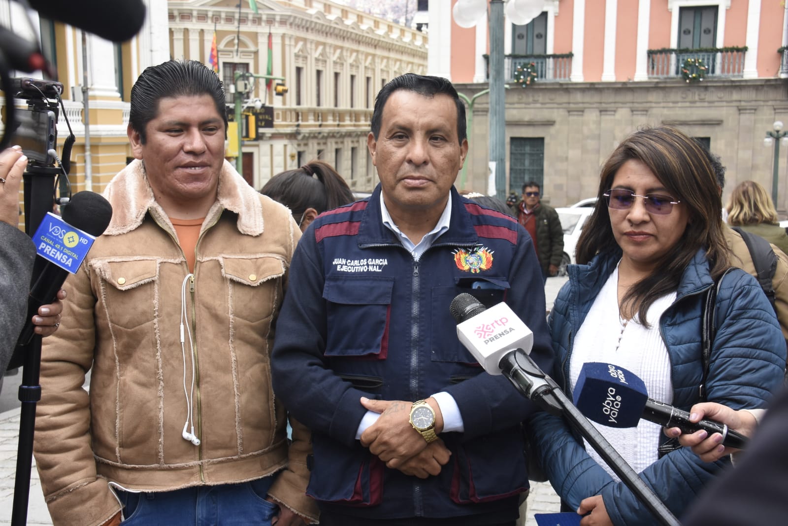 El secretario ejecutivo de la Confederación de Trabajadores Gremiales de Bolivia, Juan Carlos García, brinda declaraciones a la prensa para desvirtuar movilizaciones anunciadas por otro sector