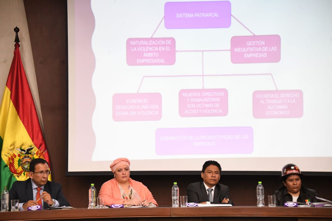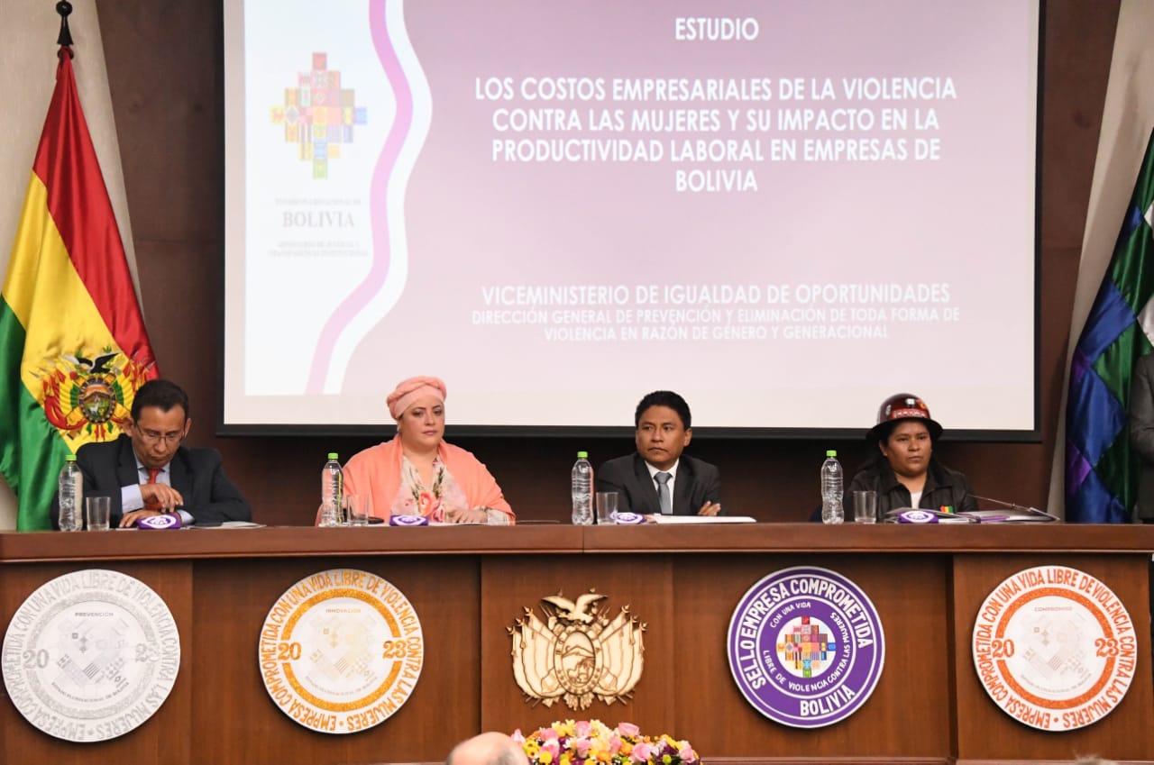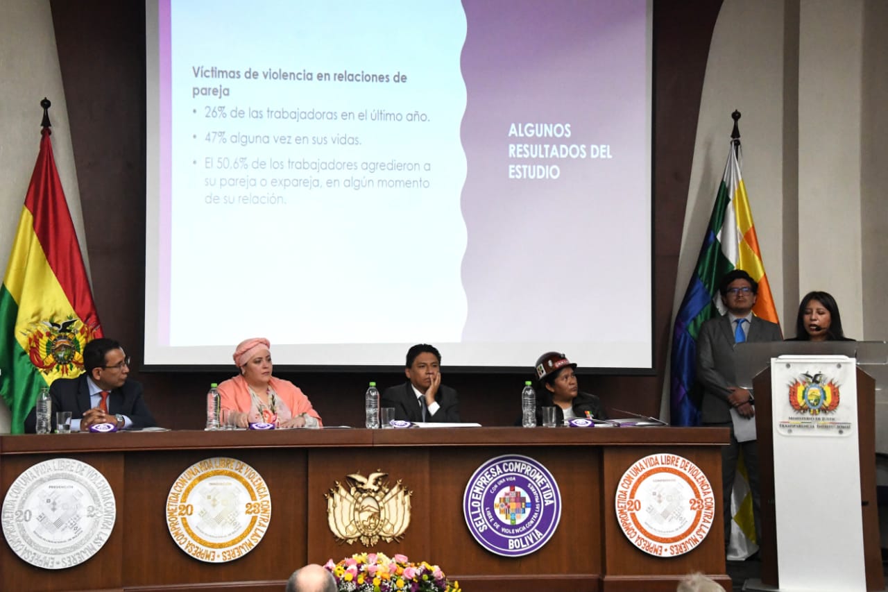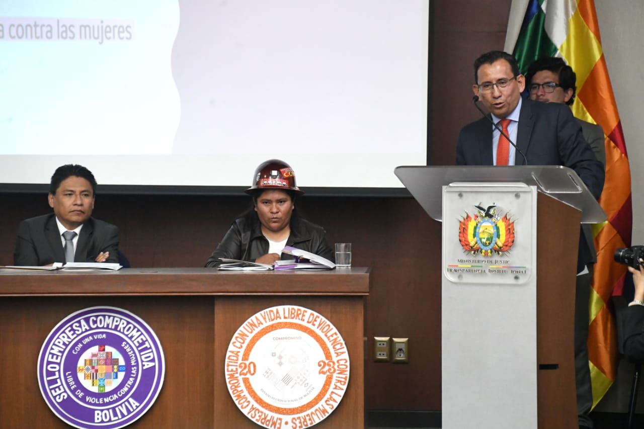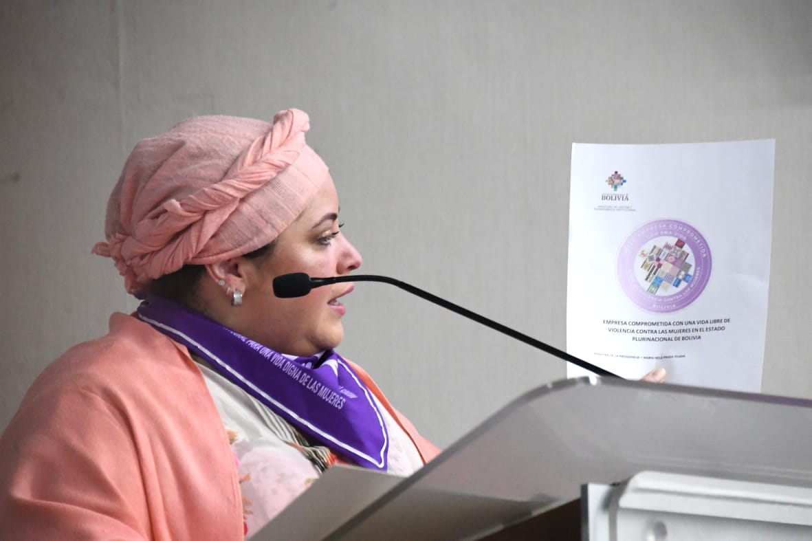 Lanzamiento del Sello Empresa Comprometida con una Vida Libre de Violencia Contra las Mujeres en el Estado Plurinacional de Bolivia, con la presencia de la ministra de la Presidencia Maria Nela Prada y el ministro de Justicia y Transparencia Instituciona