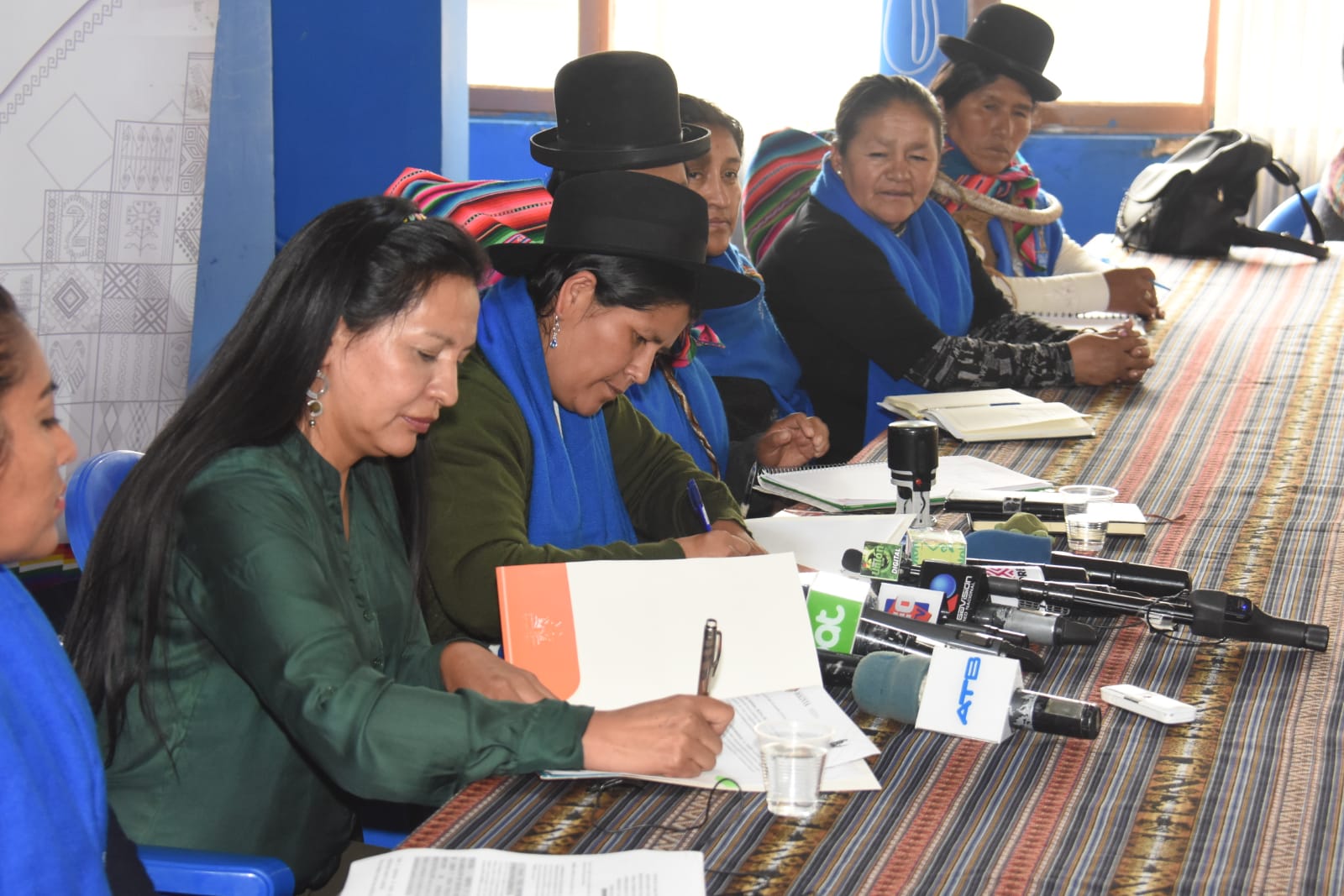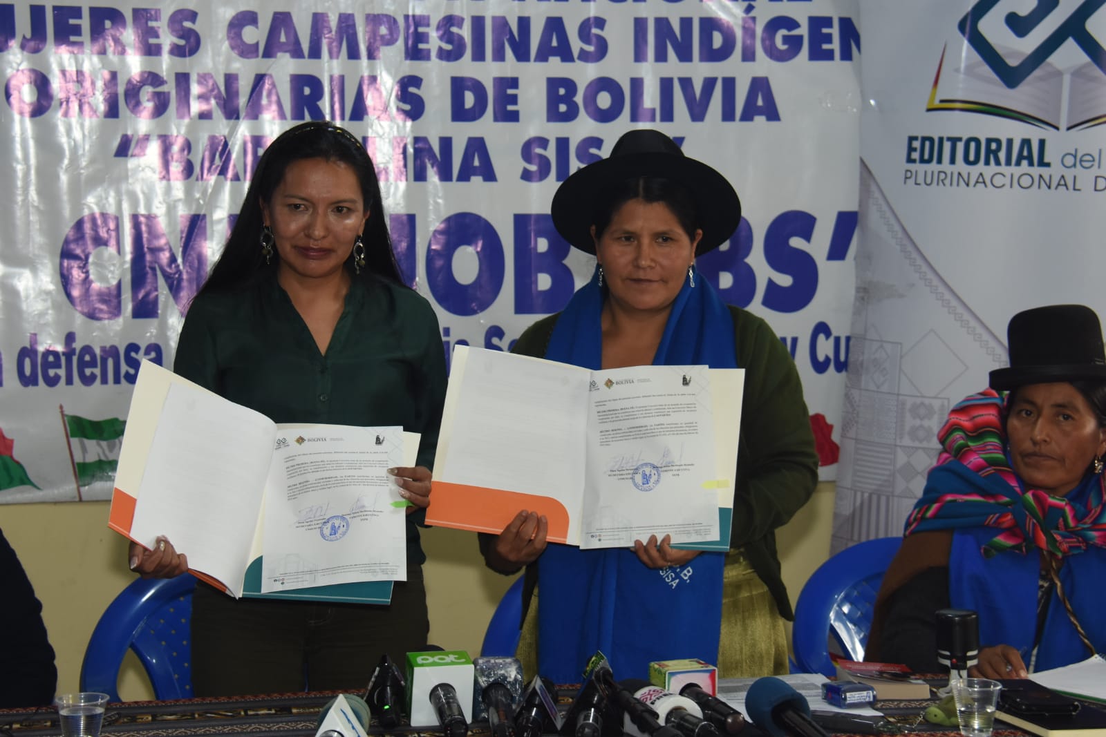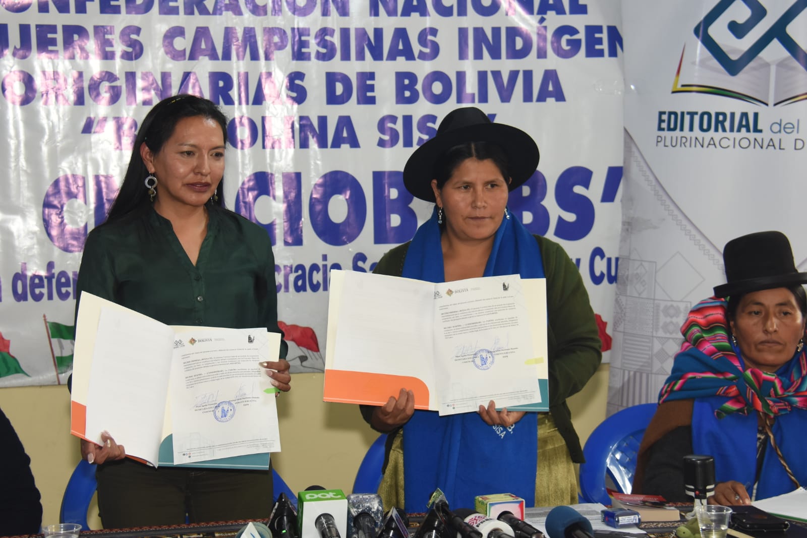 Firma de convenio entre la Confederación Nacional de Mujeres Campesinas Indígenas Originarias de Bolivia Bartolina Sisa y la Editorial del Estado Plurinacional de BoliviaUsuario ABIGalería Fotográfica 01 Febrero 2023 Visto: 12267ShareTwittearshare with Whatsappshare with Telegram Foto: Gonzalo JallasiAnteriorSiguiente
