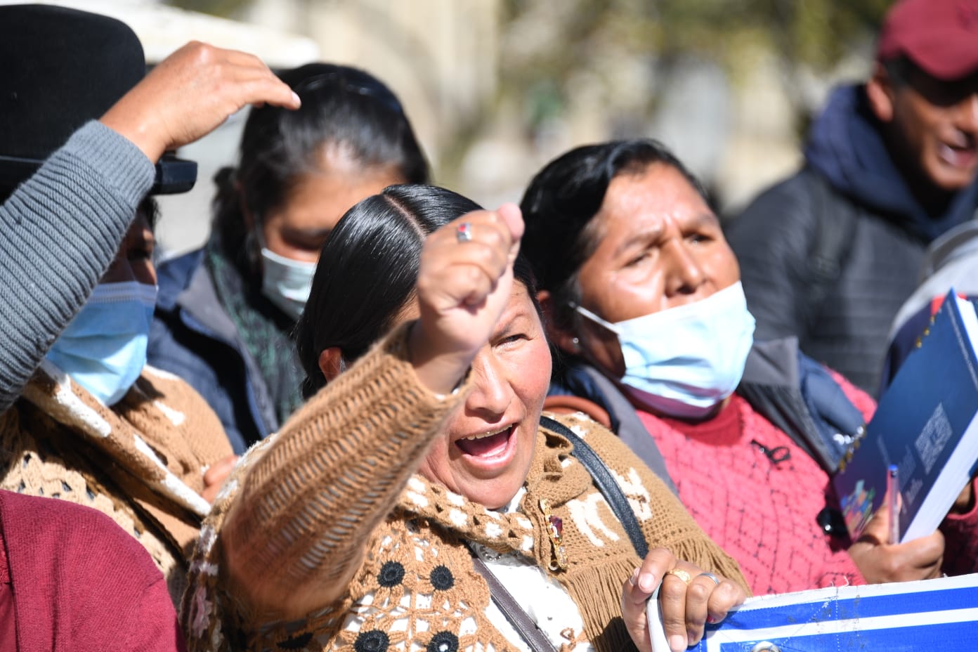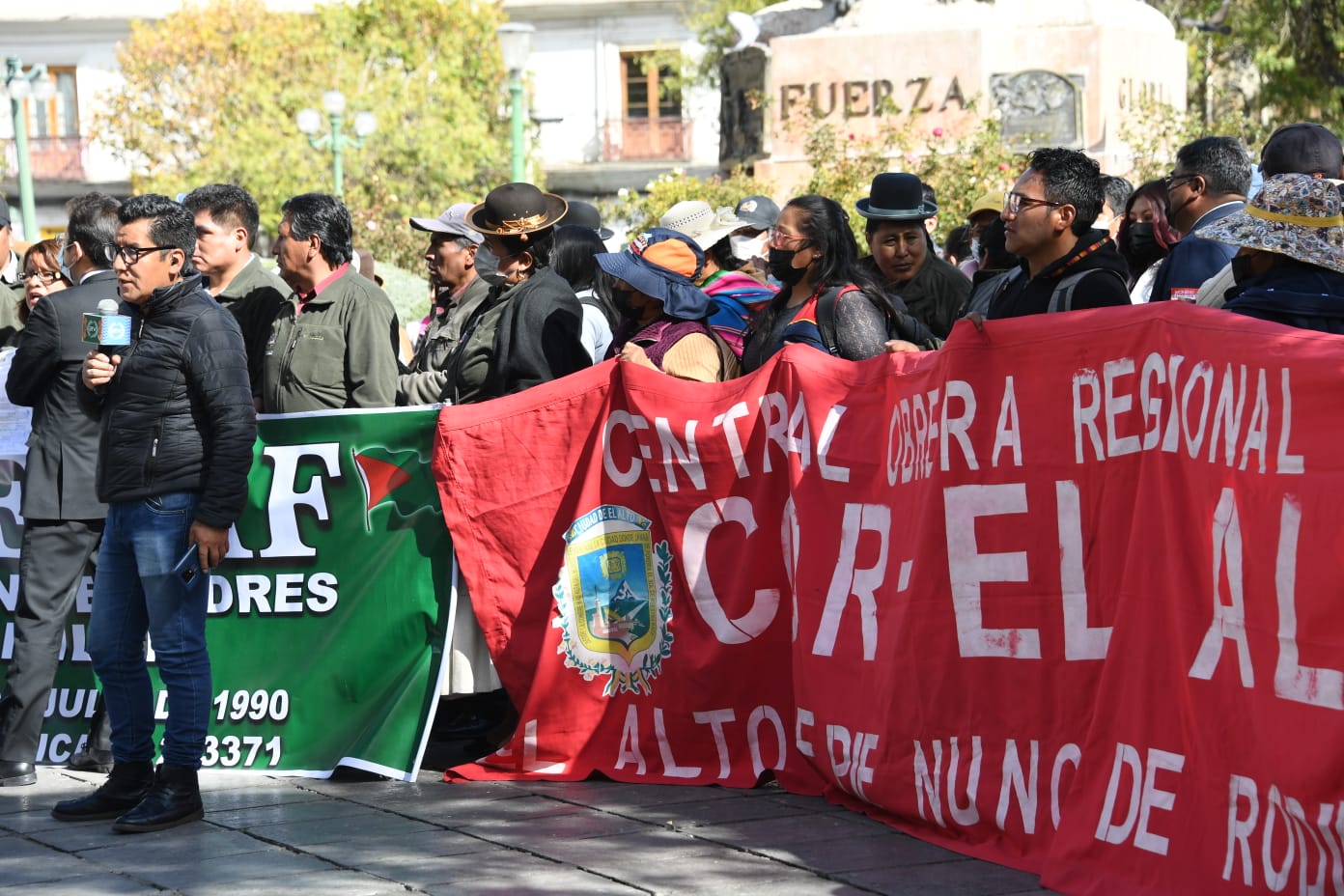 Jenny Arce Presidenta de la Federación de Padres de Familia (FEDEPAF) junto a el CONCEJO DISTRITAL DE JUNTAS ESCOLARES (CODIJE), la COORDINADORA REGIONAL DE MADRES Y PADRES DE FAMILIA (COREMPAF) y la CENTRAL OBRERA REGIONAL DE EL ALTO (COR) se dirigen a los medio en plaza Murillo. Fotos: Josué Cortéz
