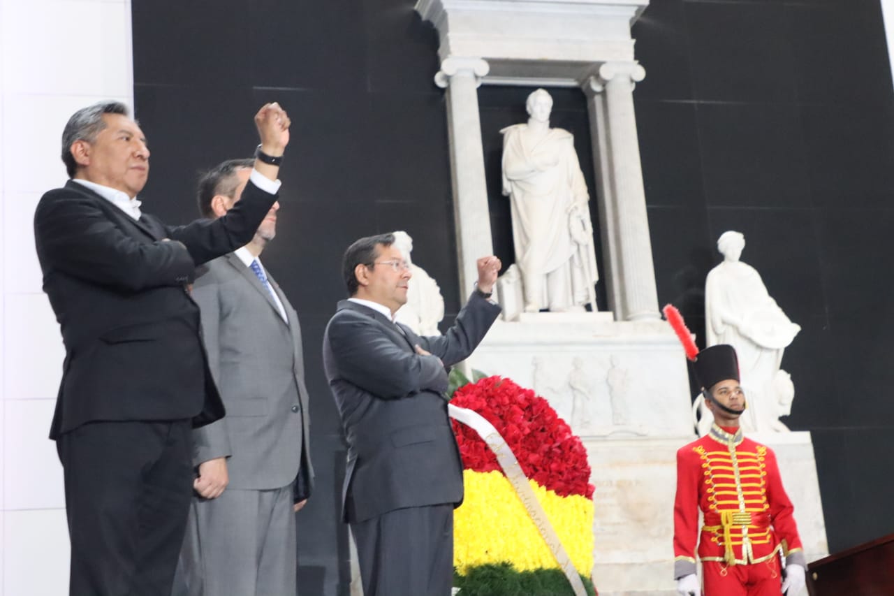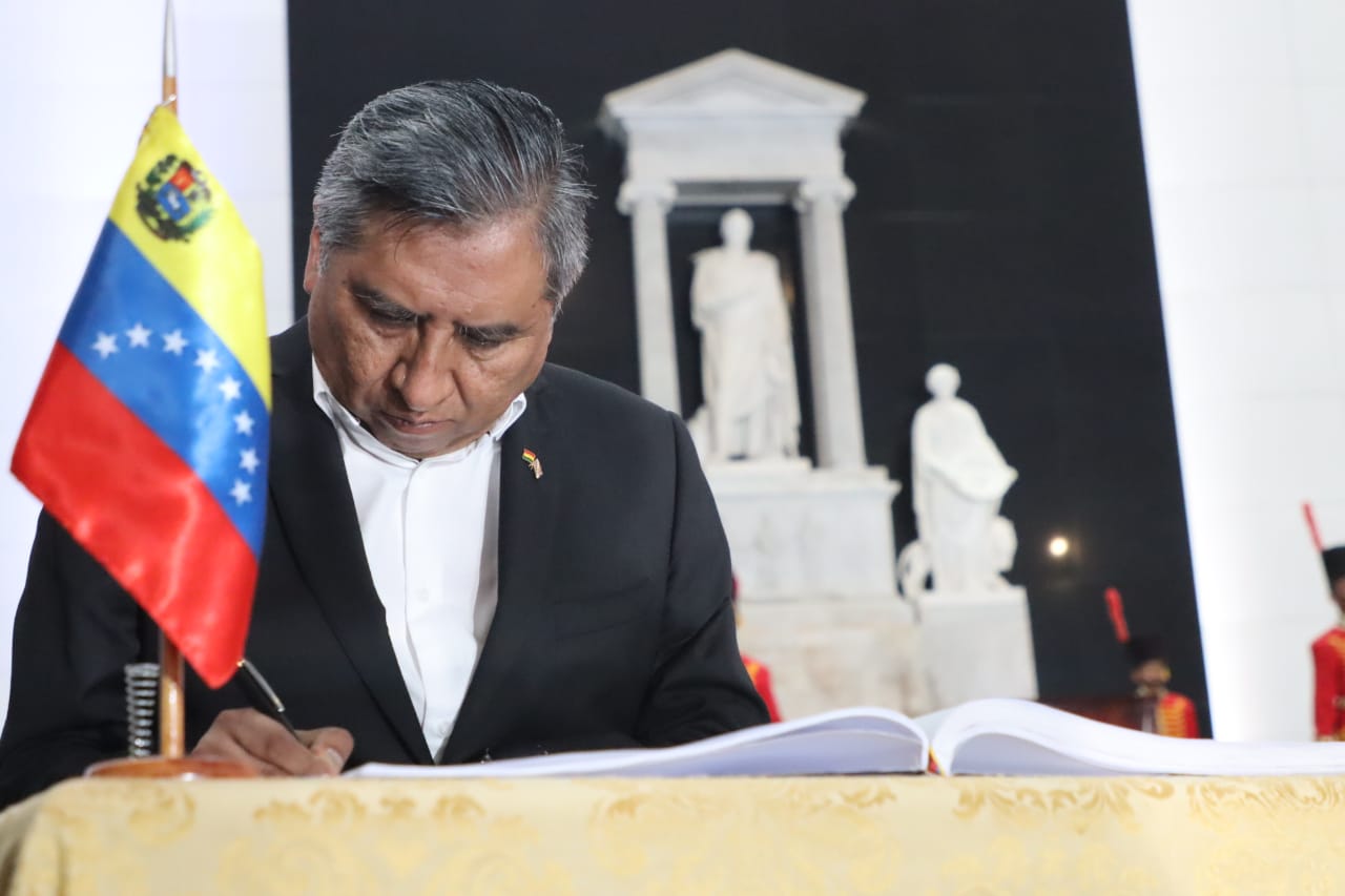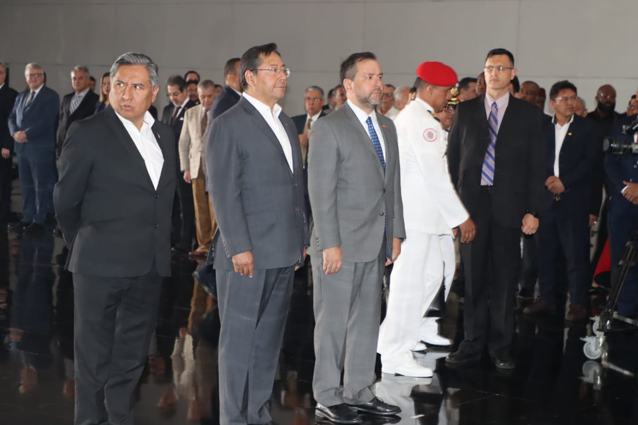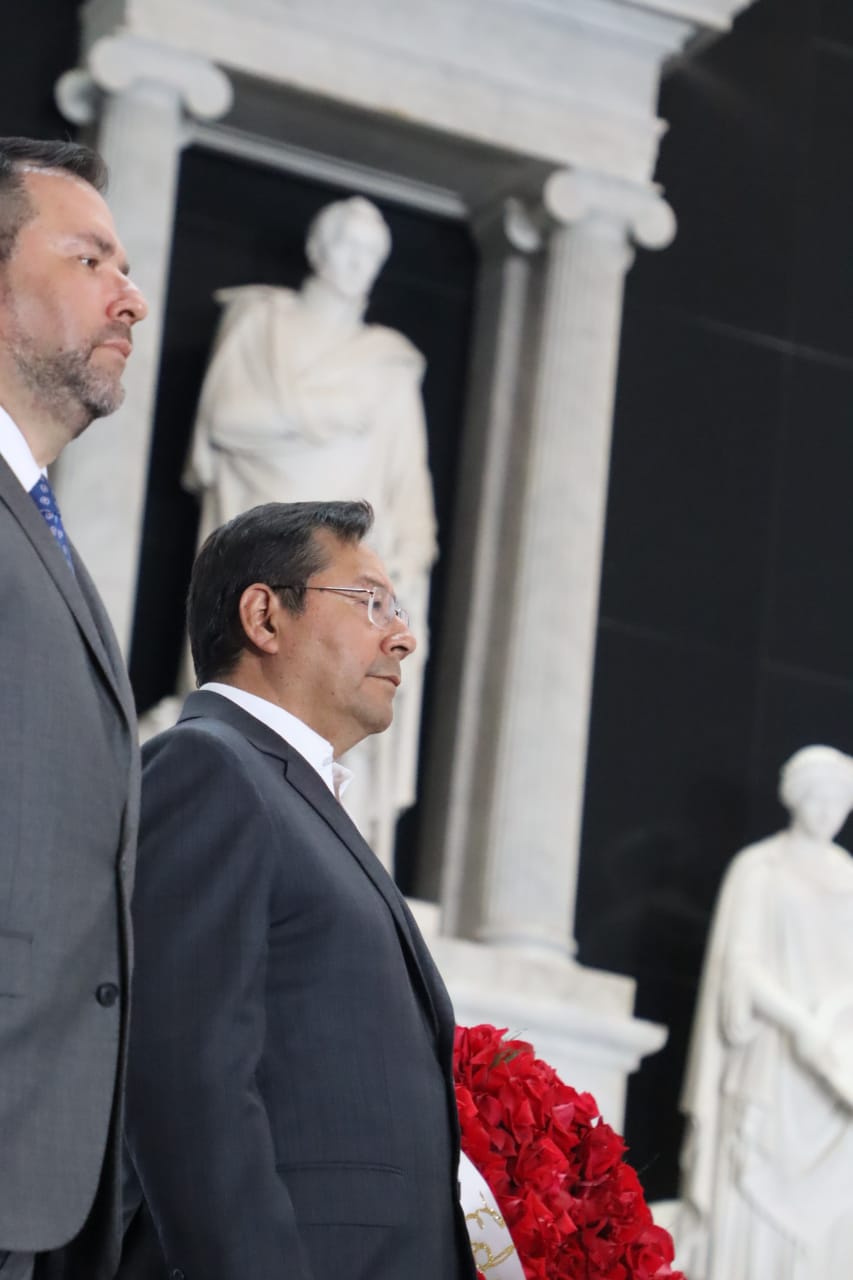 Presidente del Estado Luis Arce, rinde honores con la entrega de una ofrenda floral ante los restos del libertador Simón Bolívar, en el Panteón Nacional de Venezuela. Fuente: Comunicación Presidencial
