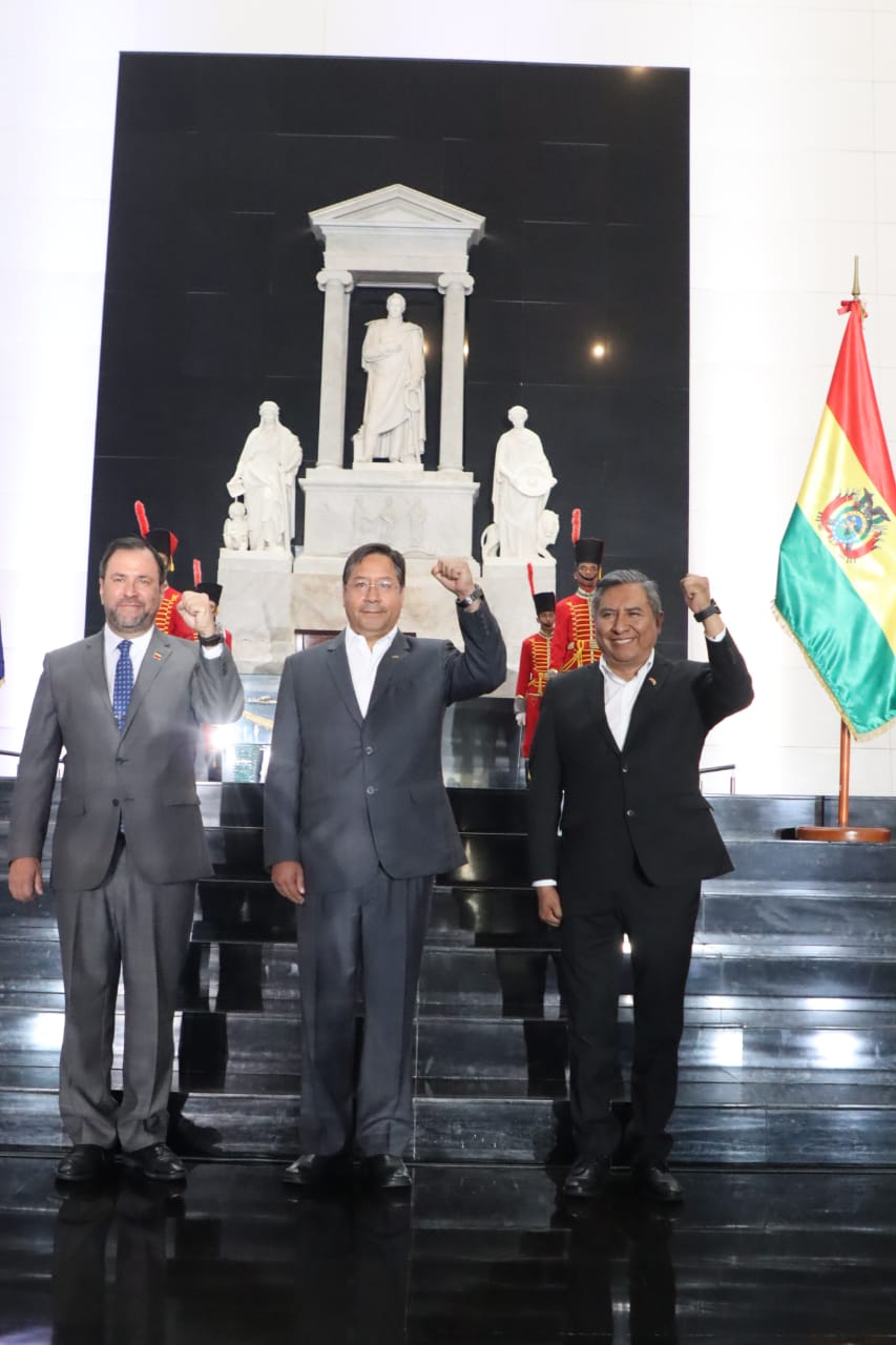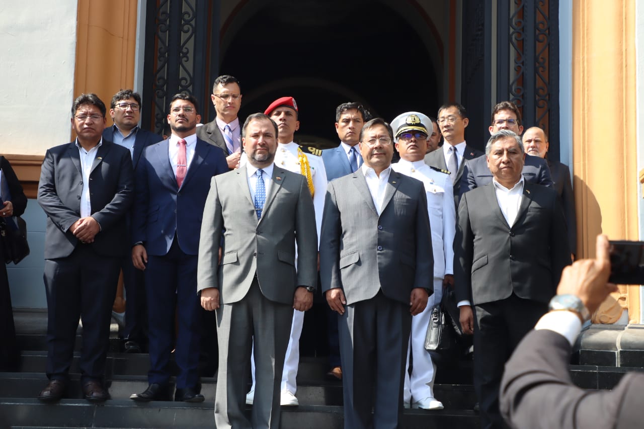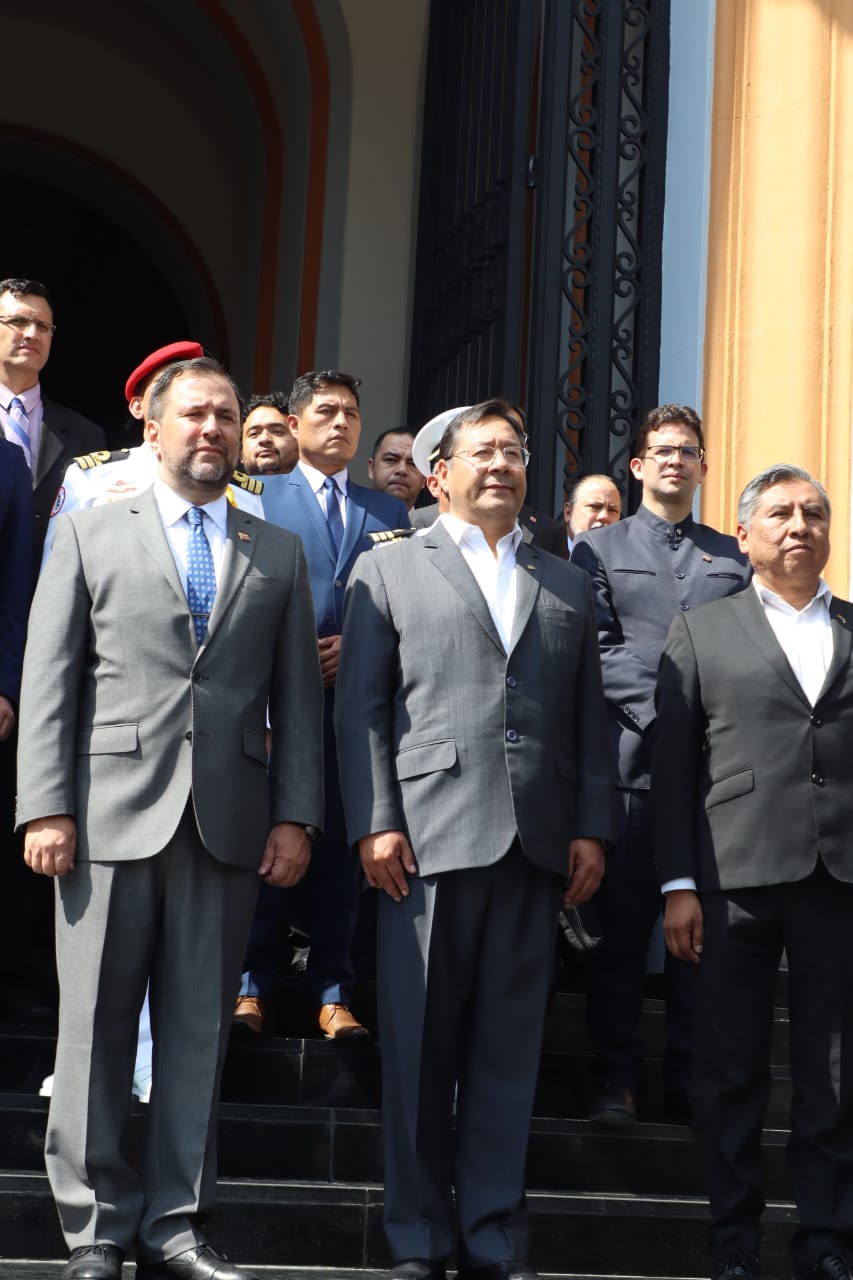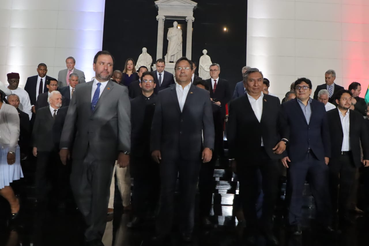 Presidente del Estado Luis Arce, rinde honores con la entrega de una ofrenda floral ante los restos del libertador Simón Bolívar, en el Panteón Nacional de Venezuela. Fuente: Comunicación Presidencial