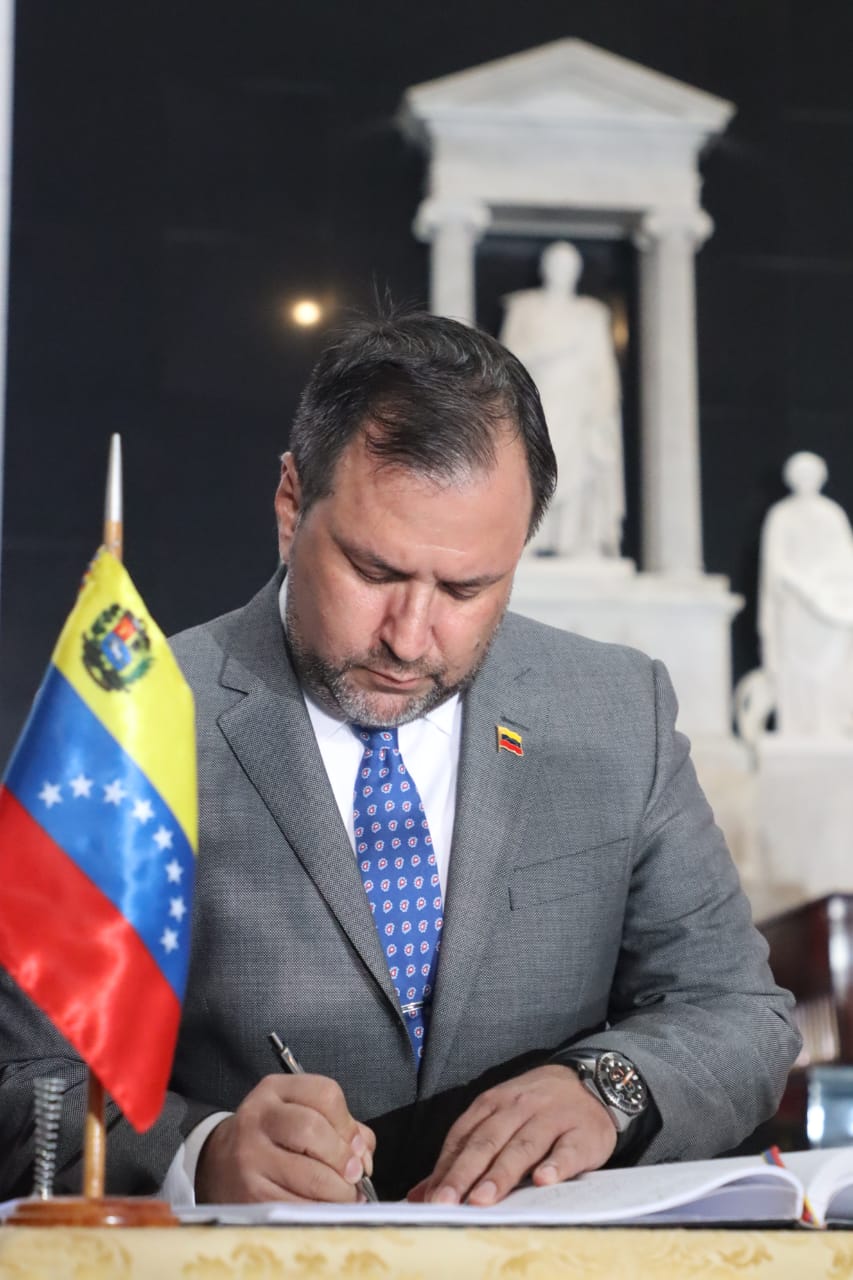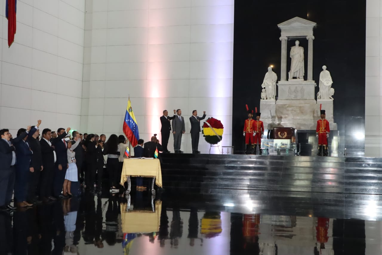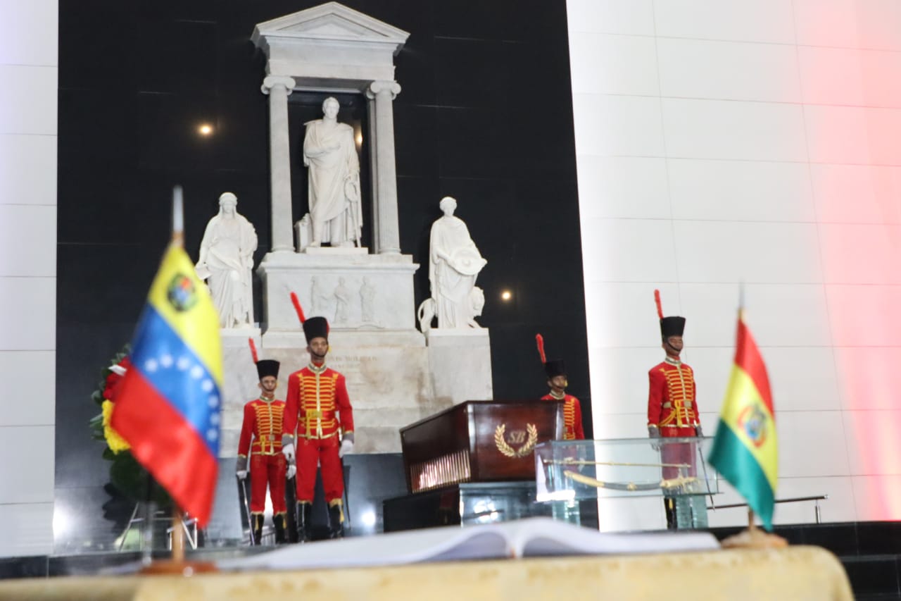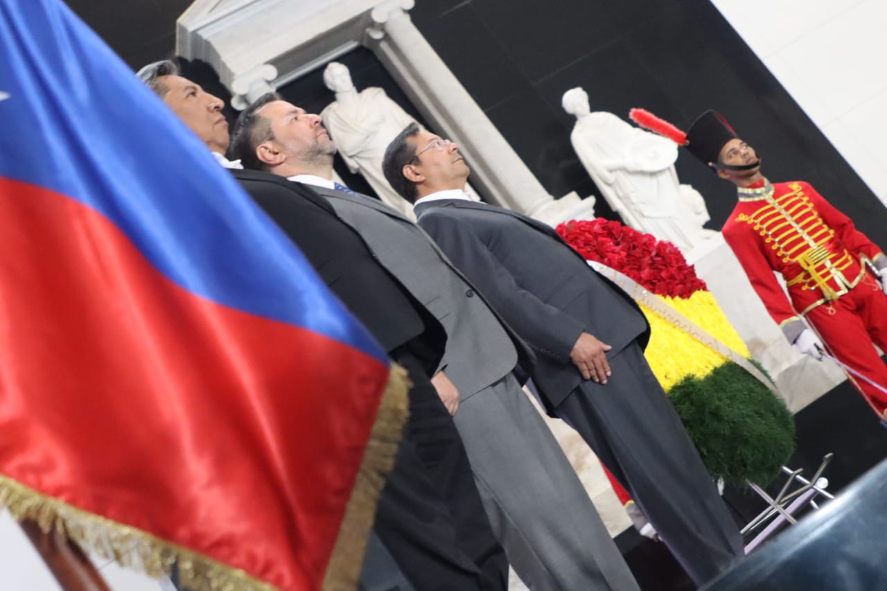 Presidente del Estado Luis Arce, rinde honores con la entrega de una ofrenda floral ante los restos del libertador Simón Bolívar, Panteón Nacional de Venezuela