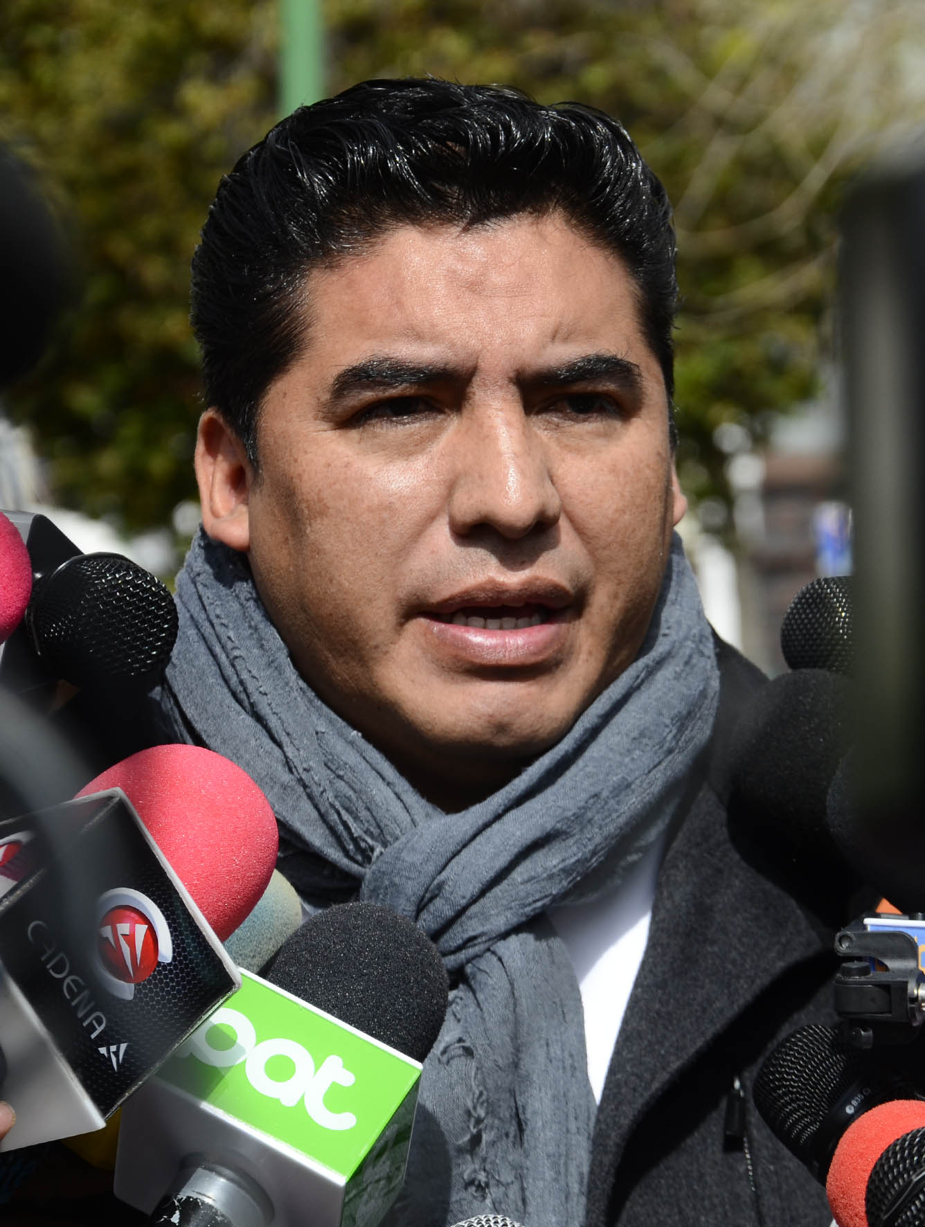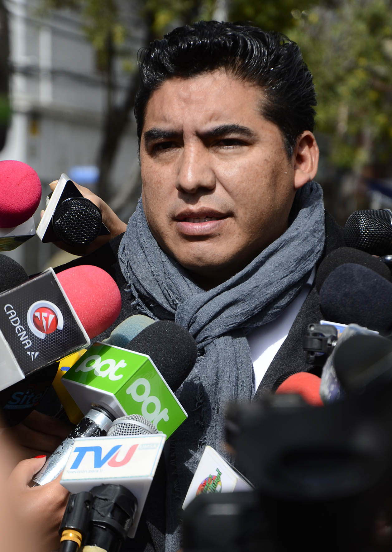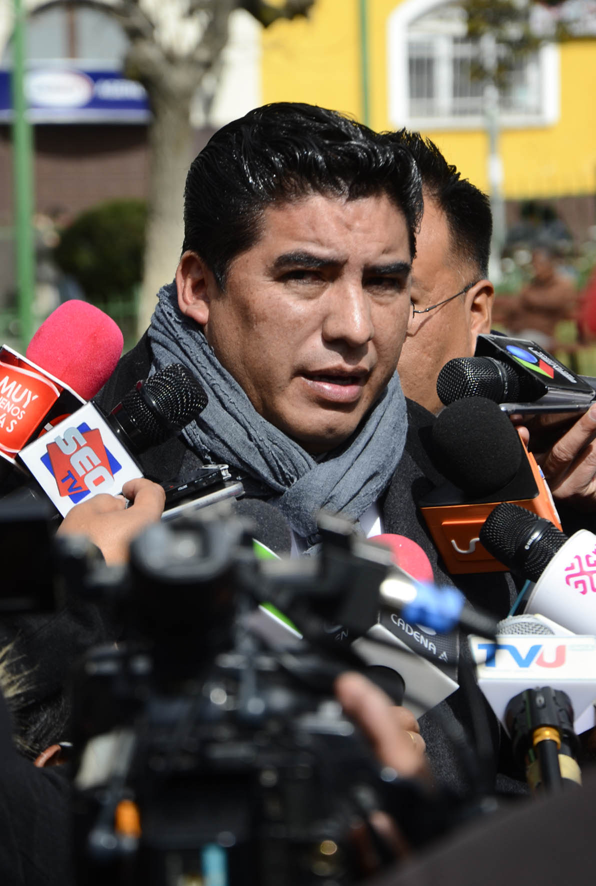 El Director de Régimen Penitenciario, Lic. Juan Carlos Limpias se dirige a los medios de comunicación sobre la salud del privado de libertad Luis Fernando Camacho. Foto: Freddy Barragán