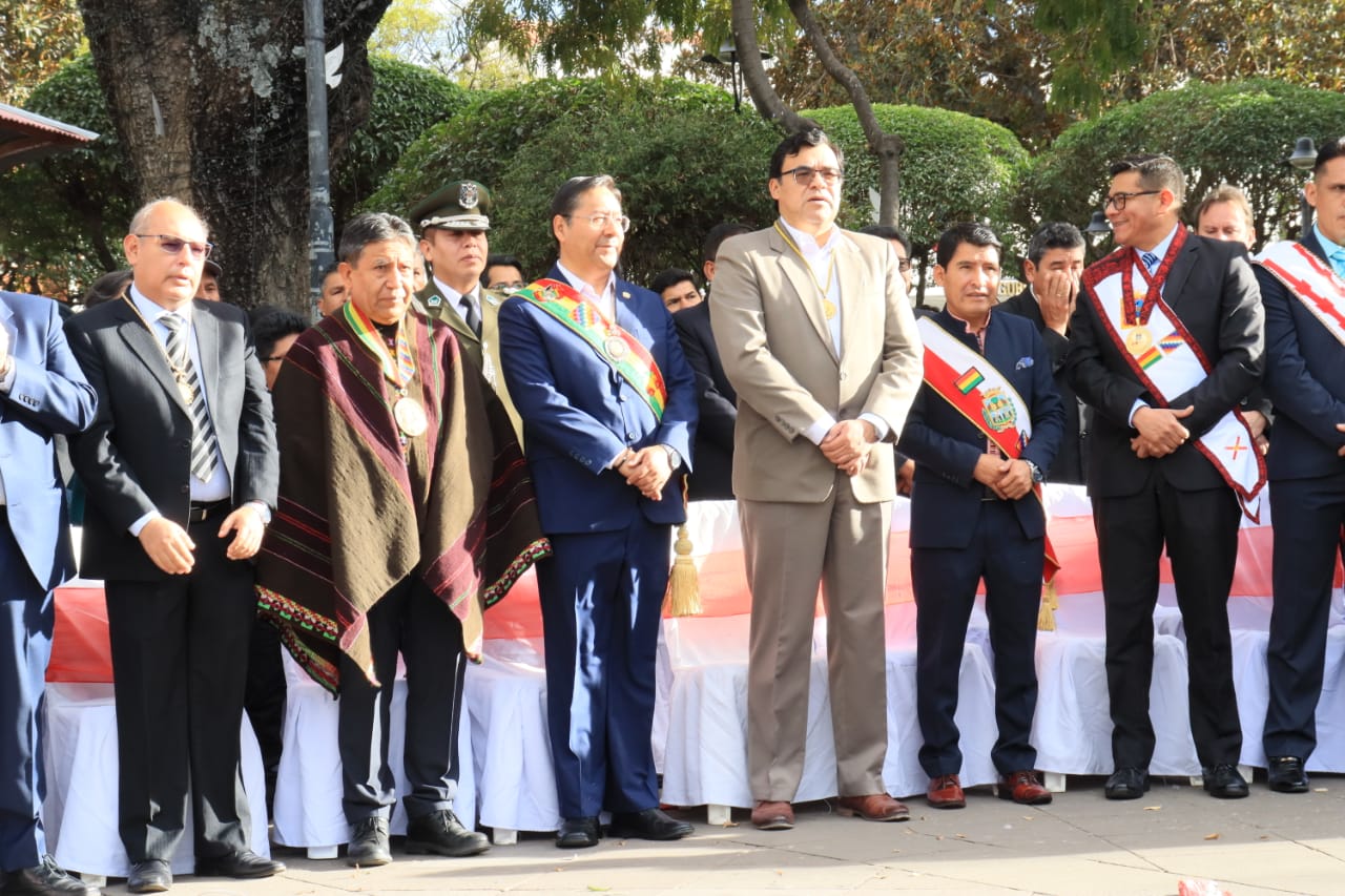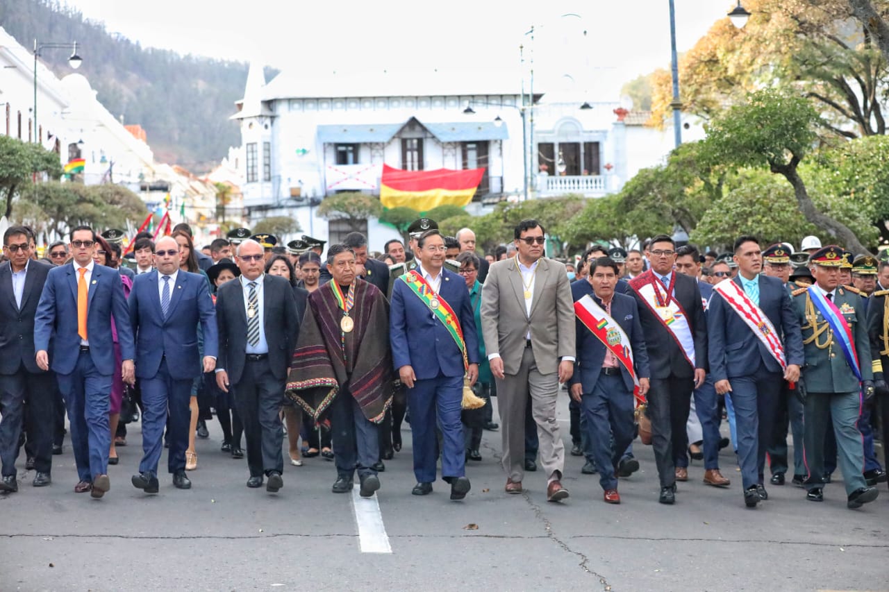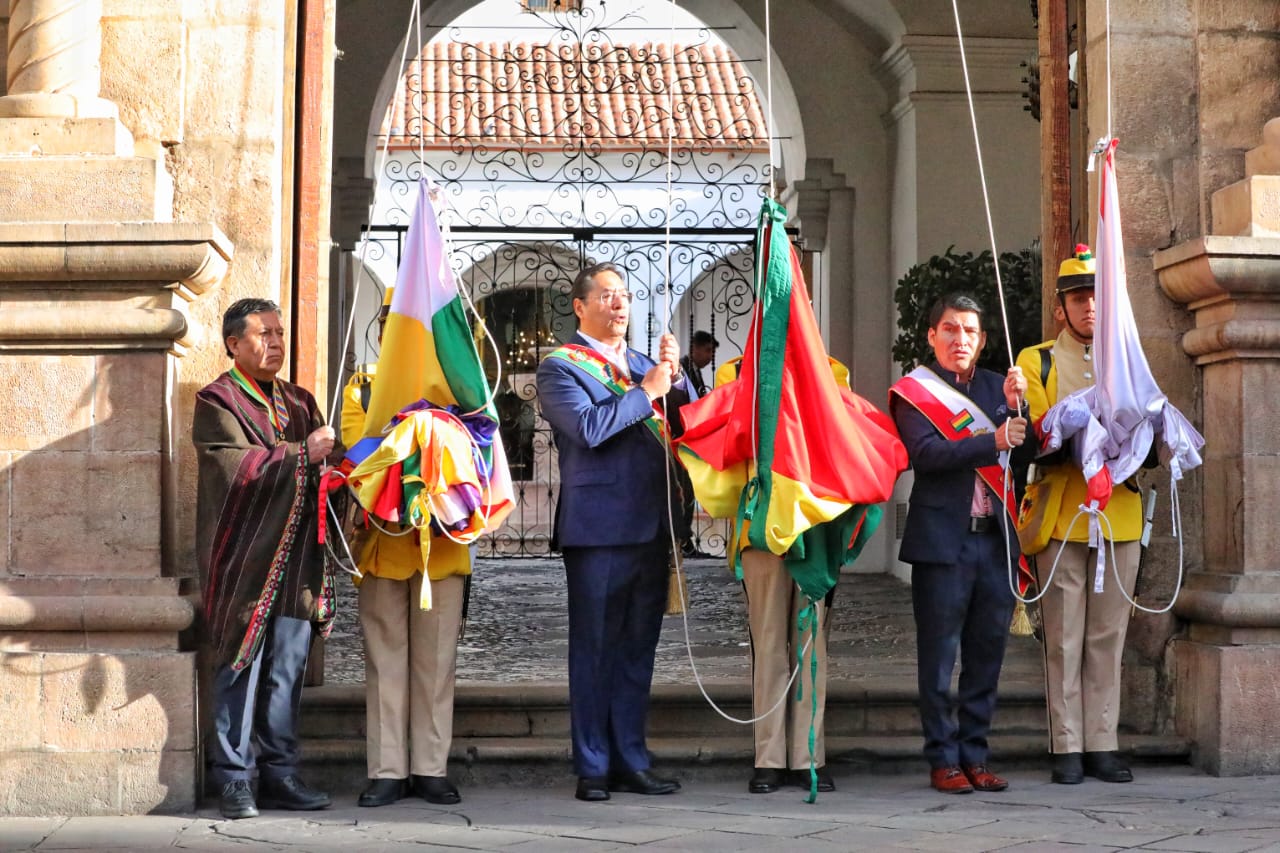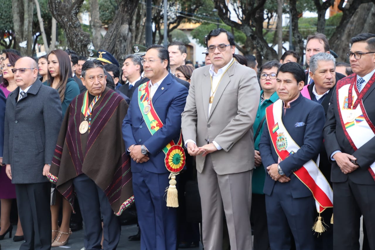 Presidente del Estado Luis Arce entrega en Sucre Ofrenda floral e iza banderas en homenaje a los 214 años de la Revolución del 25 de mayo de 1809