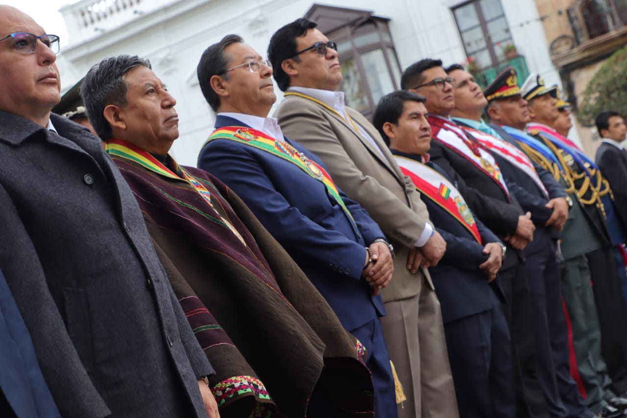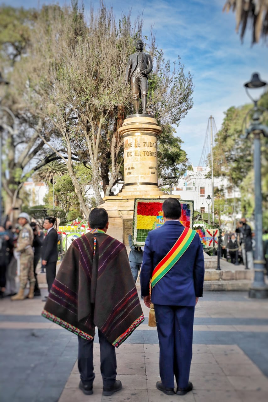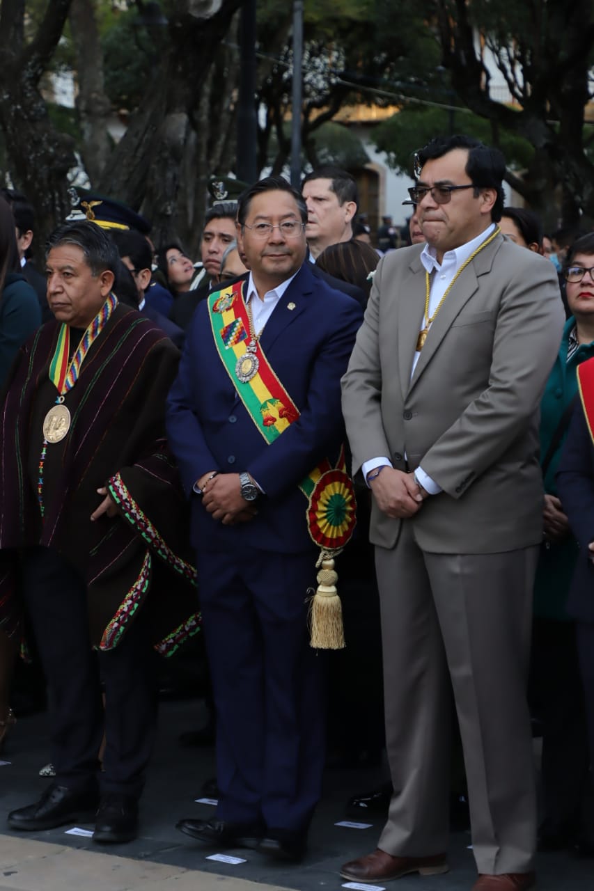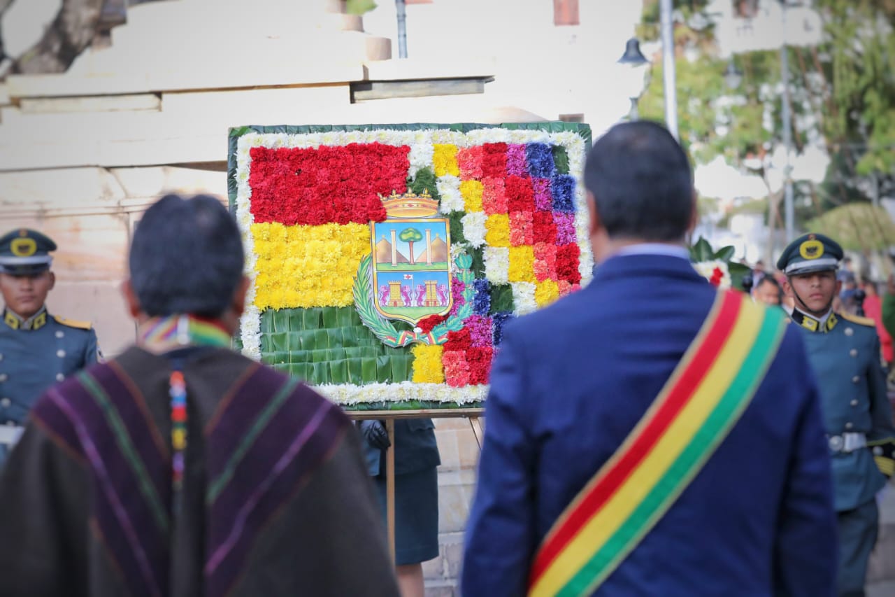 Presidente del Estado Luis Arce entrega en Sucre Ofrenda floral e iza banderas en homenaje a los 214 años de la Revolución del 25 de mayo de 1809. Fuente: Comunicación Presidencial