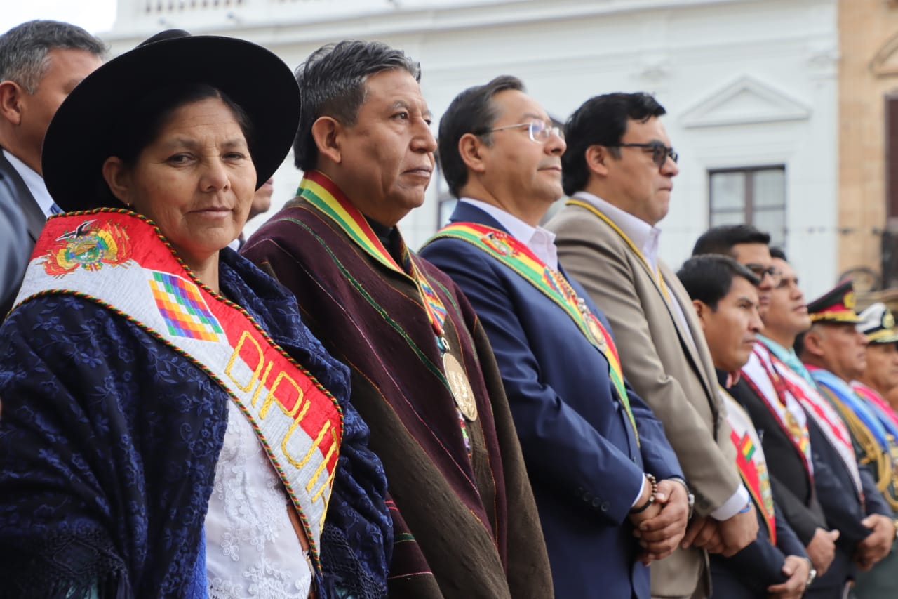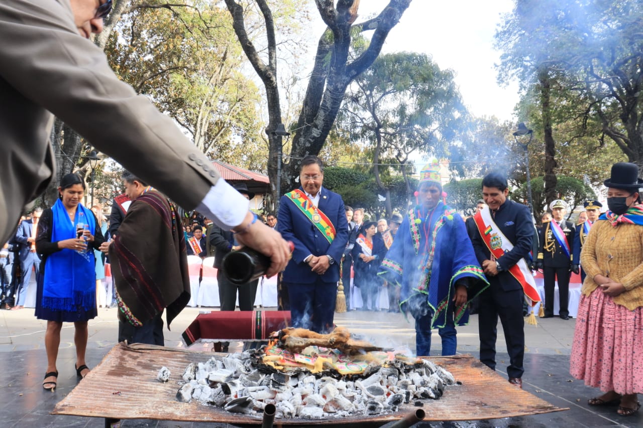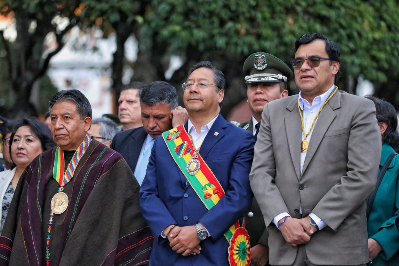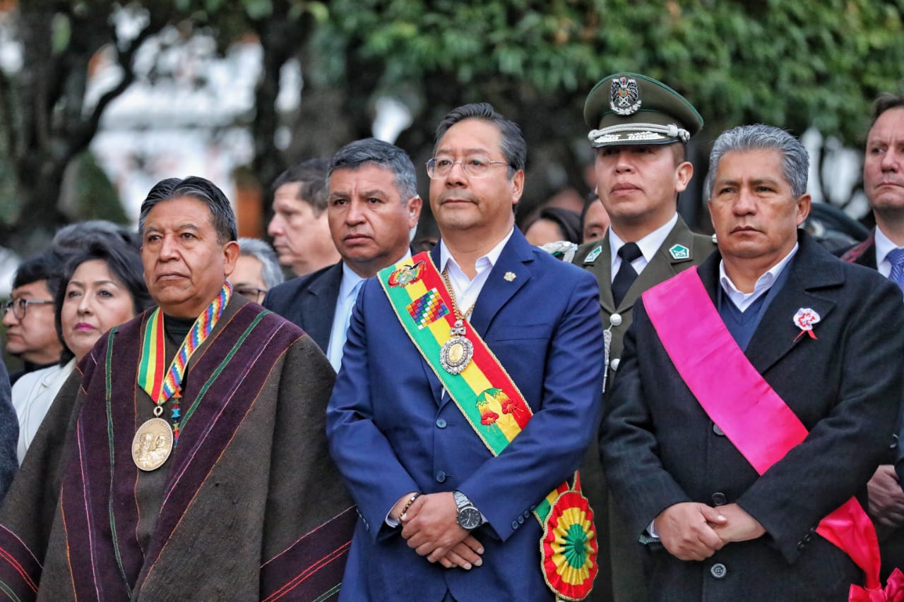 Presidente del Estado Luis Arce entrega en Sucre Ofrenda floral e iza banderas en homenaje a los 214 años de la Revolución del 25 de mayo de 1809. Fuente: Comunicación Presidencial