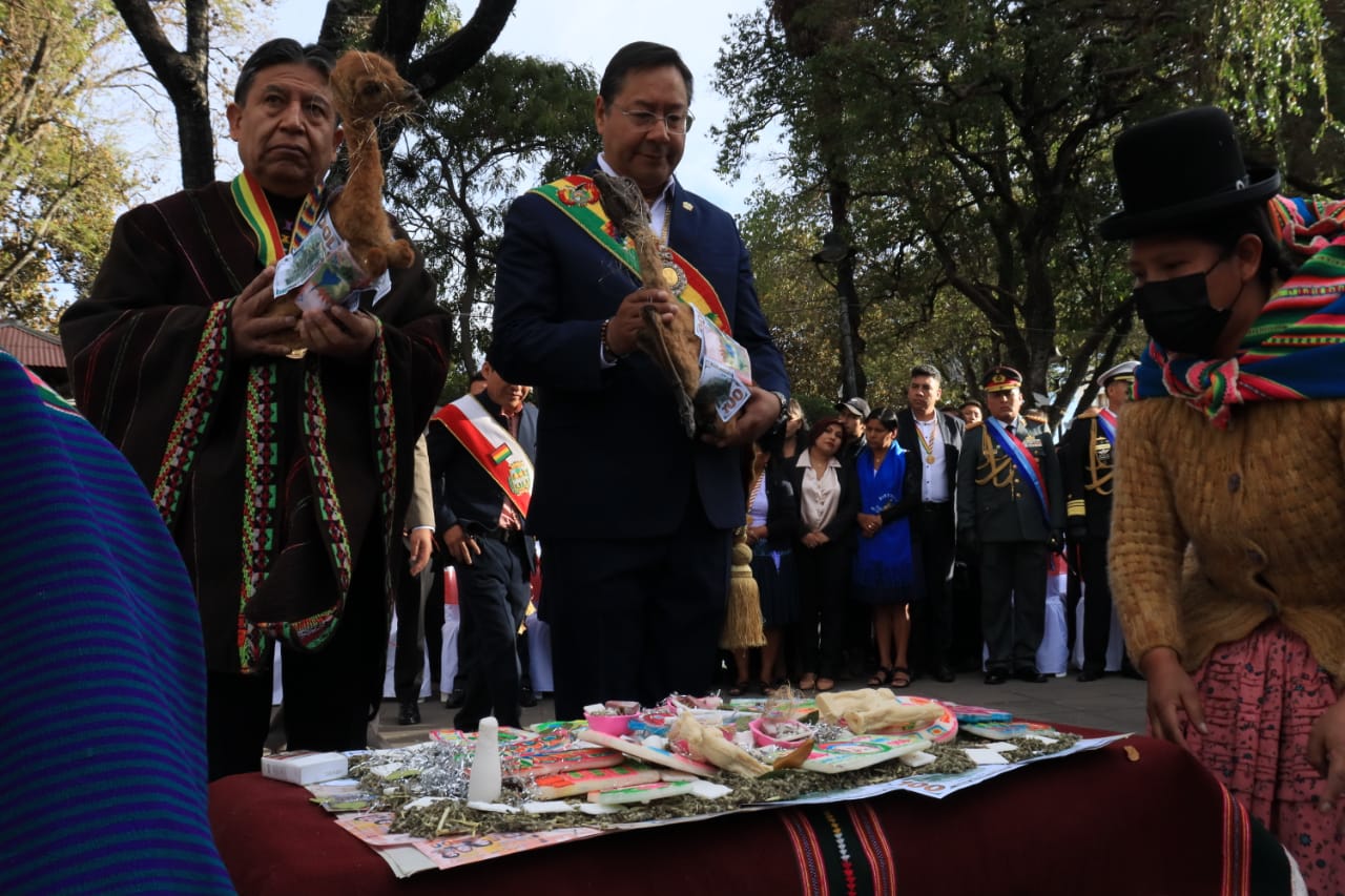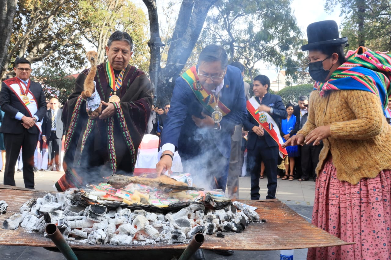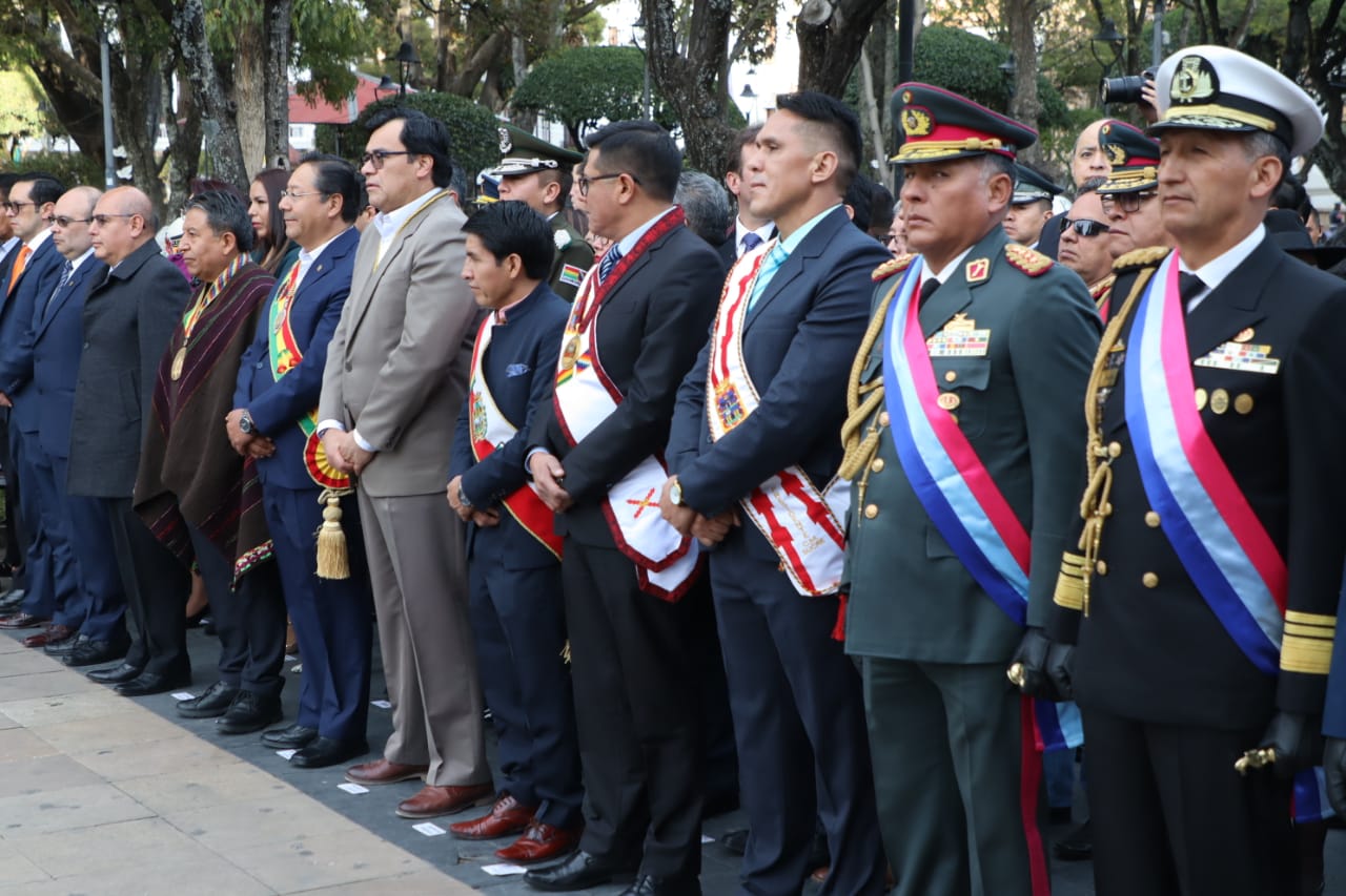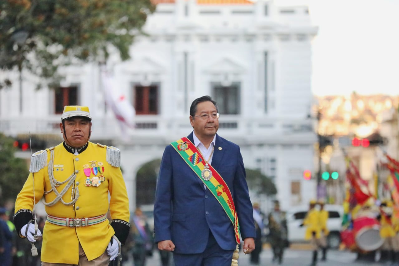 Presidente del Estado Luis Arce entrega en Sucre Ofrenda floral e iza banderas en homenaje a los 214 años de la Revolución del 25 de mayo de 1809. Fuente: Comunicación Presidencial